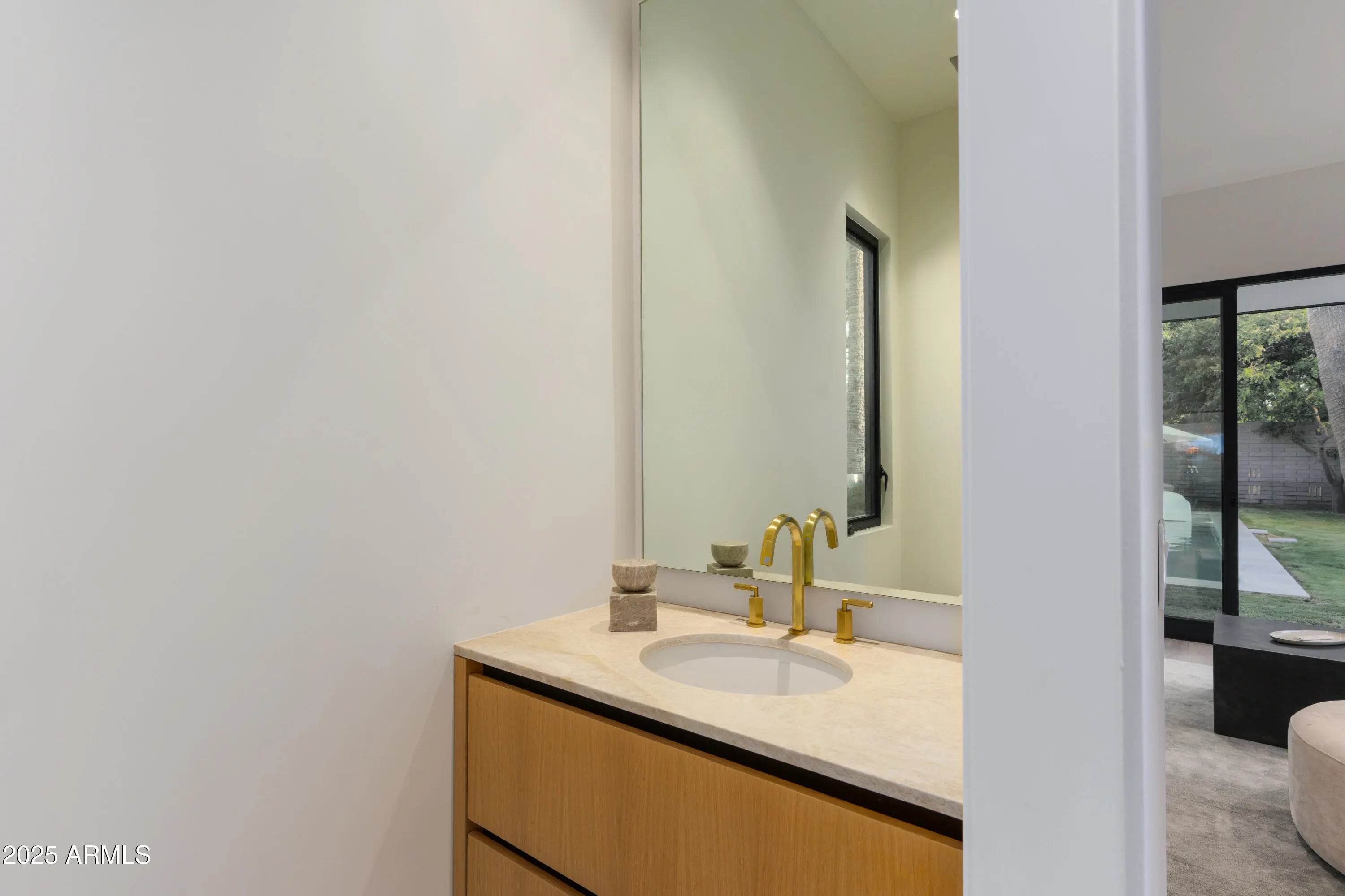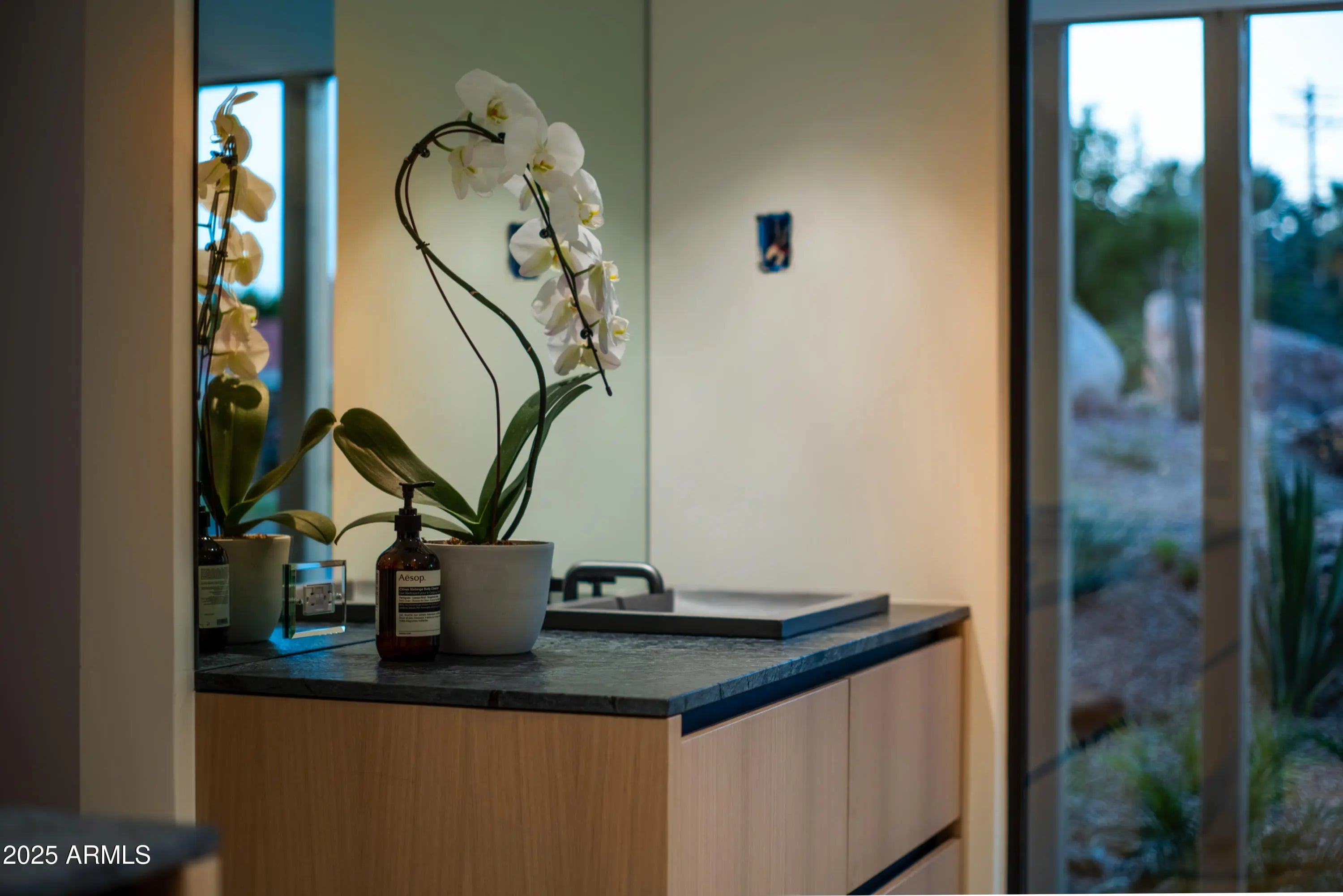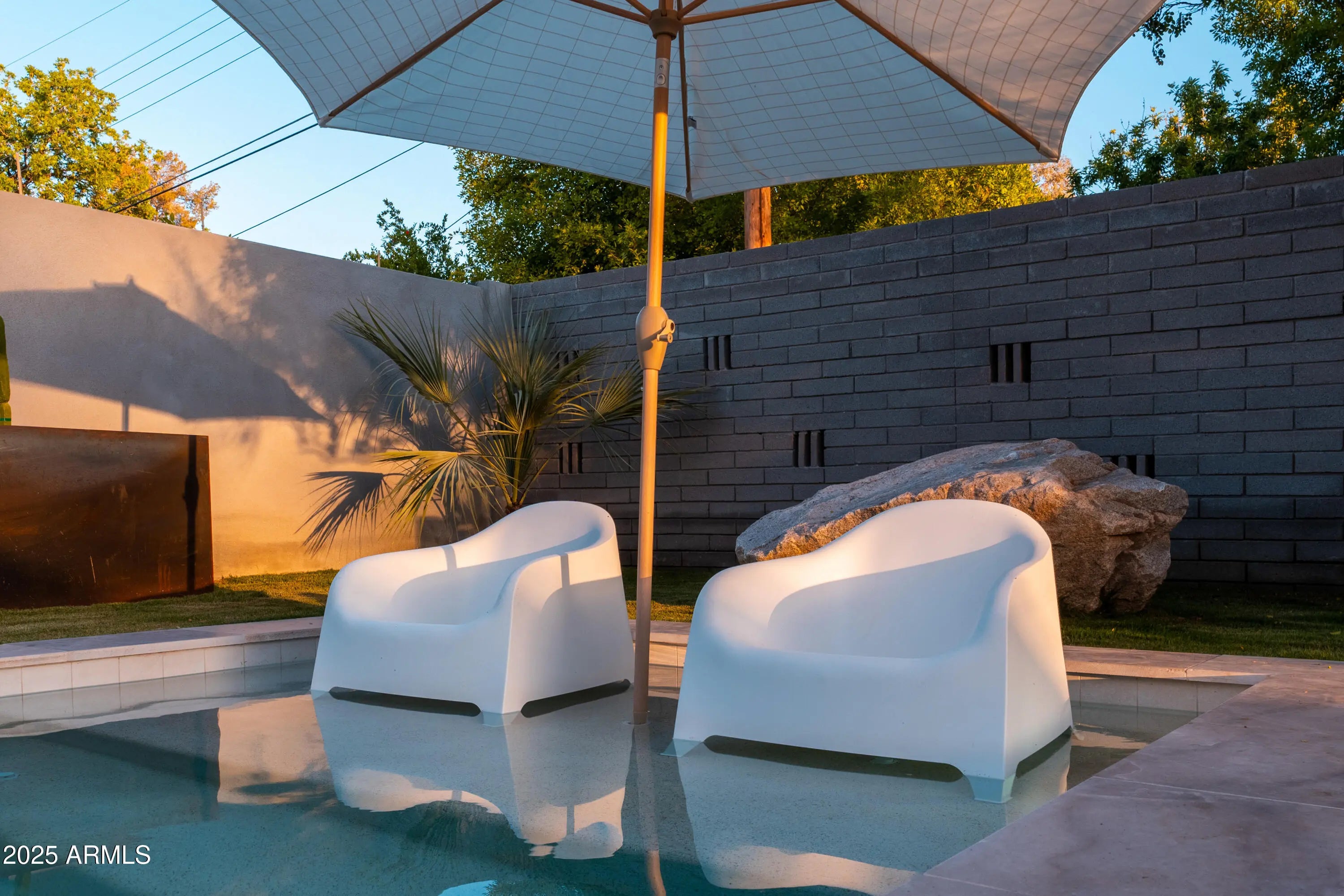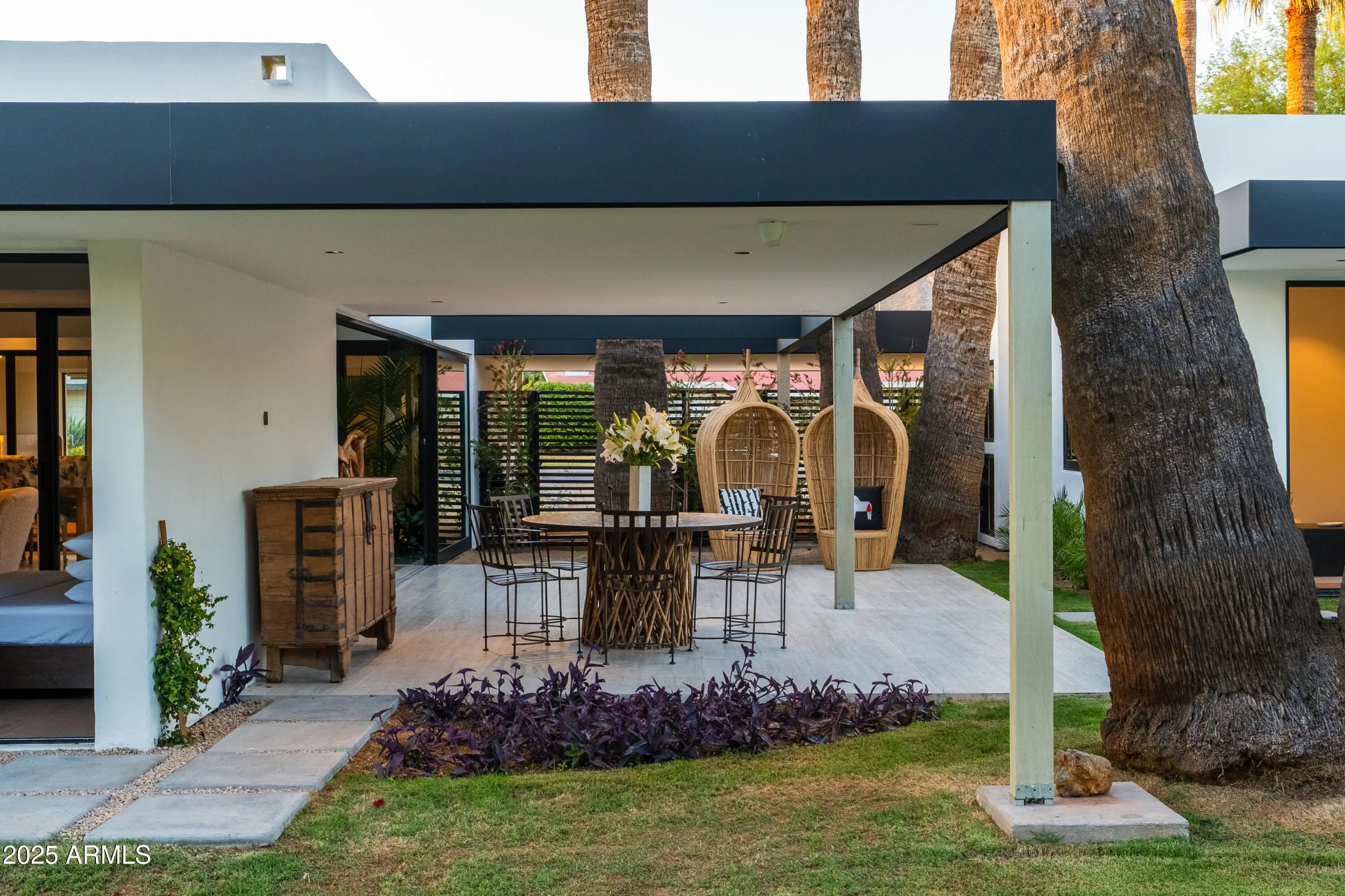 Mid-century icon originally dreamed by William B. Scarbro and reborn by PHX Historic, this residence blurs art, architecture, and landscape. Professionally sculpted grounds wrap the home in desert theater with towering palms, carved boulders, and curated plantings framing every sightline. Inside, a sun-washed great room reveals blonde hardwoods, rift-cut white oak millwork, and slabs of blue Tortuga marble that feel almost aquatic. The culinary core features a Pro-48 Sub-Zero, Wolf 48'' gas range, scullery, and paneled Cove dishwasher. The main house hosts a primary suite with ¾ bath, two guest rooms joined by a jack-and-jill, office, laundry, and a powder mural. A private casita adds a family lounge, bedroom, and ¾ bath. Indoors dissolve into the pool, fenced grounds, and 60-year palms.