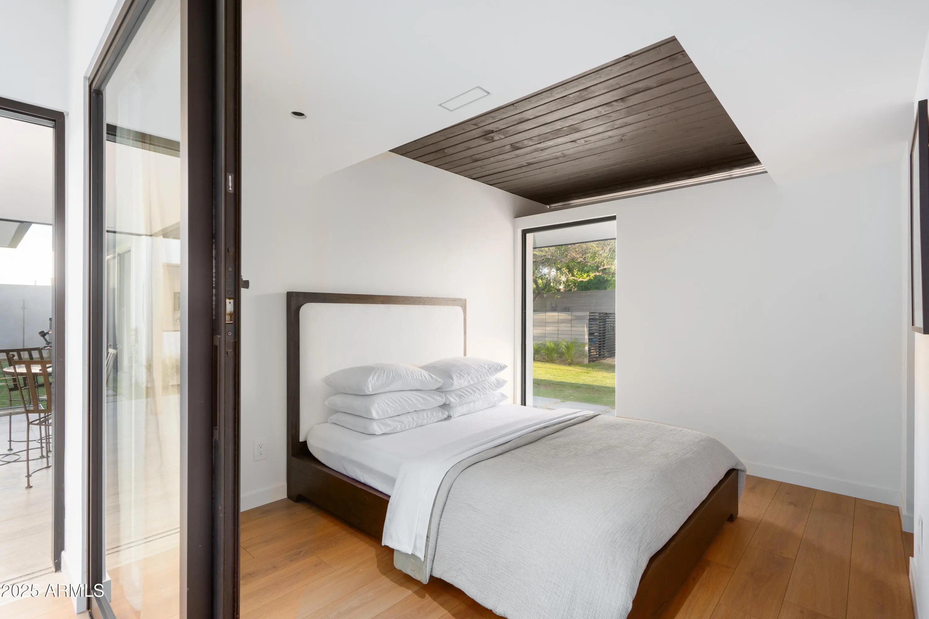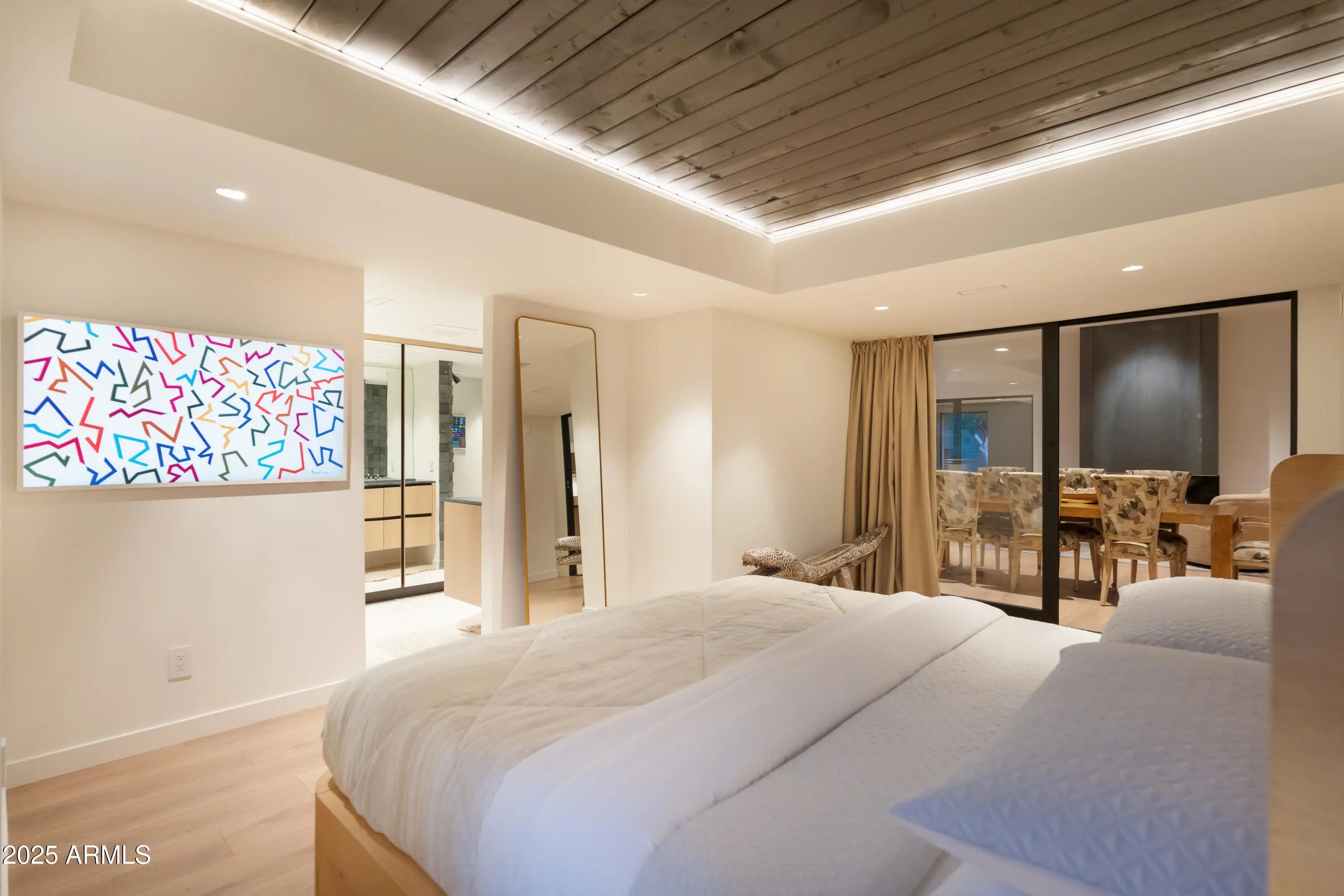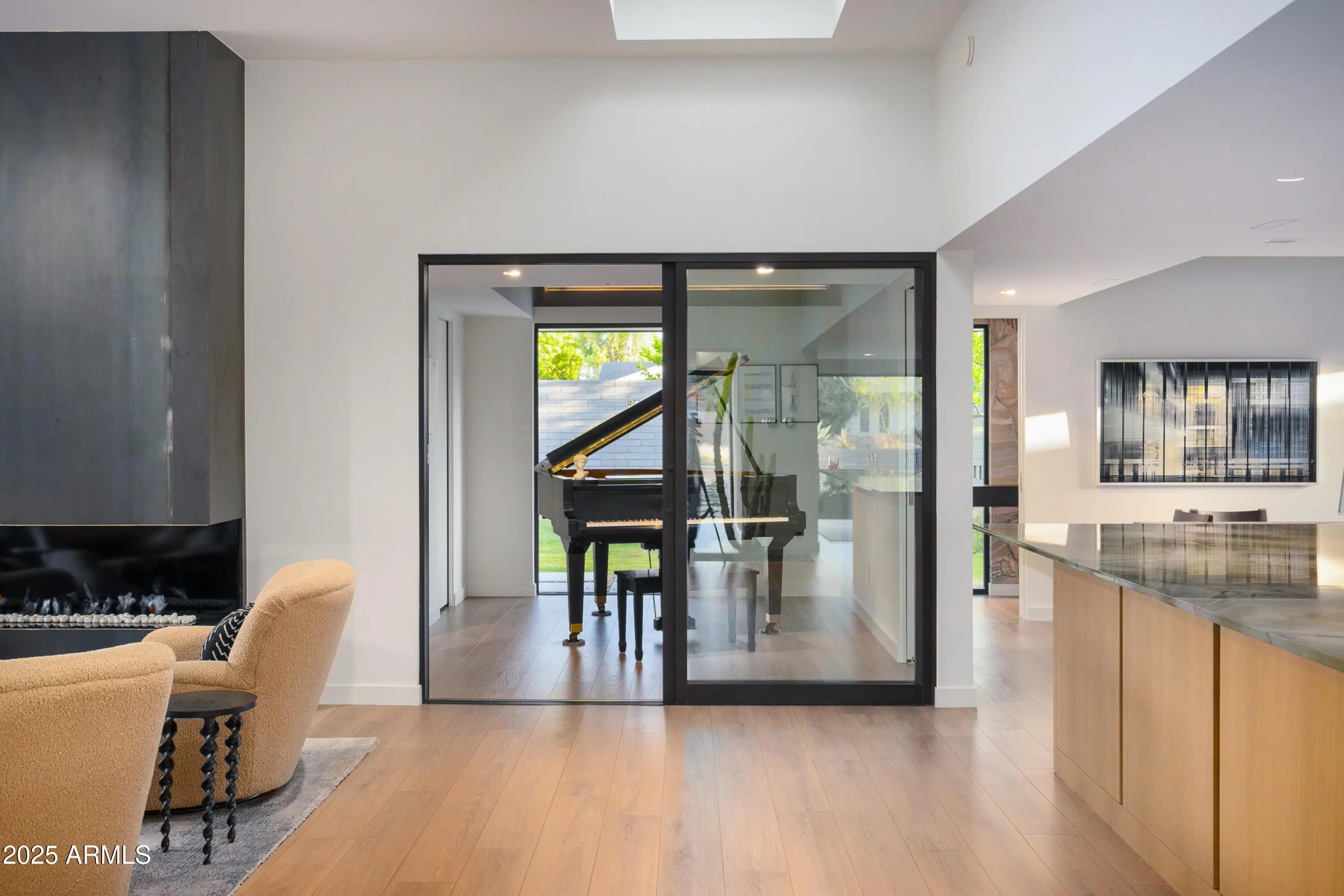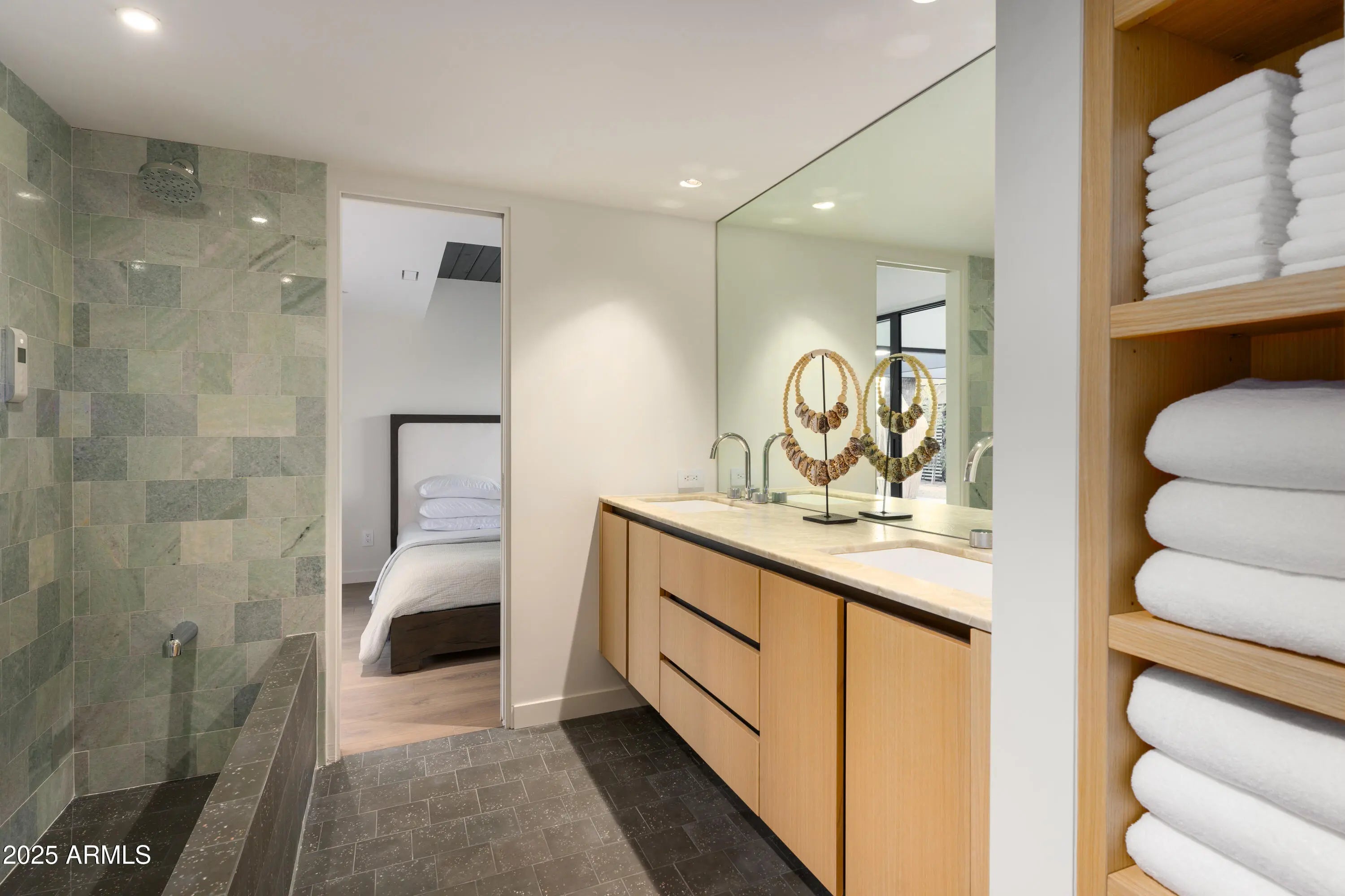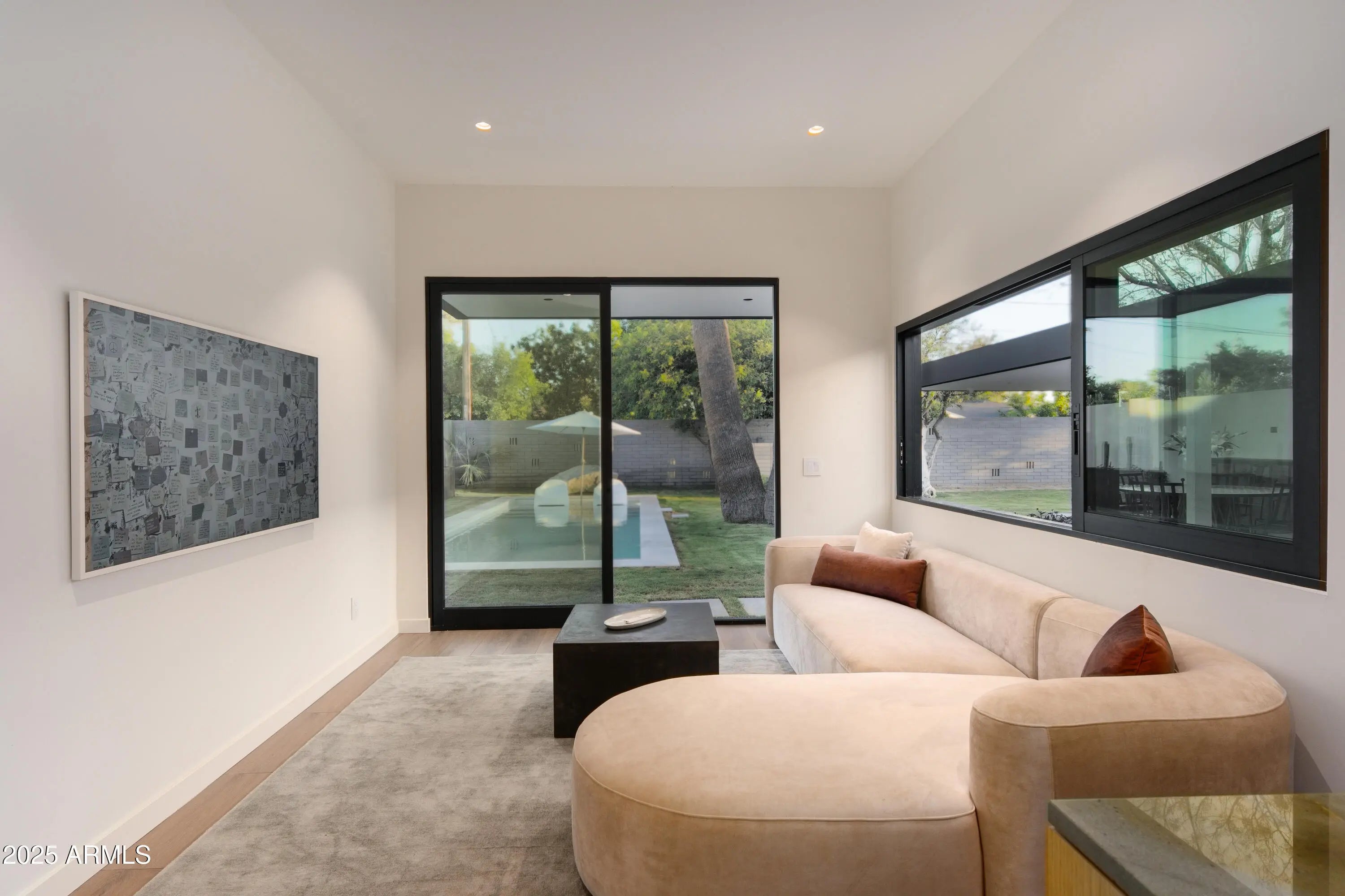 Mid-century icon originally dreamed by William B. Scarbro and reborn by PHX Historic, this residence blurs art, architecture, and landscape. Professionally sculpted grounds wrap the home in desert theater with towering palms, carved boulders, and curated plantings framing every sightline. Inside, a sun-washed great room reveals blonde hardwoods, rift-cut white oak millwork, and slabs of blue Tortuga marble that feel almost aquatic. The culinary core features a Pro-48 Sub-Zero, Wolf 48'' gas range, scullery, and paneled Cove dishwasher. The main house hosts a primary suite with ¾ bath, two guest rooms joined by a jack-and-jill, office, laundry, and a powder mural. A private casita adds a family lounge, bedroom, and ¾ bath. Indoors dissolve into the pool, fenced grounds, and 60-year palms.