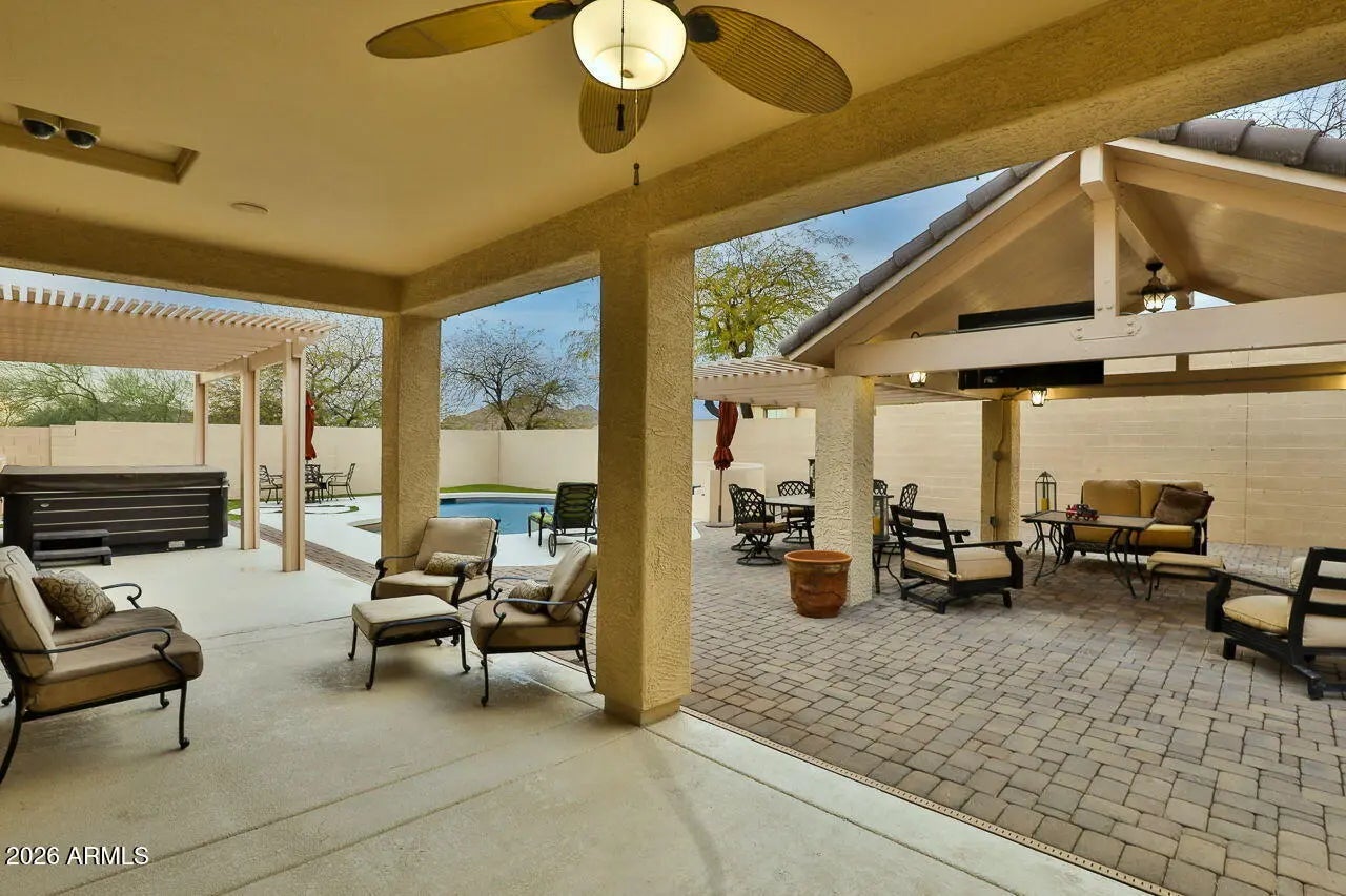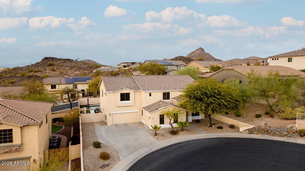 Stunning mountainview retreat in Gated Northern Phoenix cul-de-sac W/ no neighbors behind for ultimate privacy. Spacious 2-story home featured by a gourmet kitchen W/ breakfast bar & generous prep space. Entertain effortlessly in the media room W wet bar, wine fridge, & media equip incl+ 2 flexible dens. The private primary suite offers a sitting area, spa-style bath w/ dual showers, & walk-in closet. Upstairs includes a Jack-&-Jill suite, additional en-suite bedroom, & guest room w/ full bath. Resort-style backyard w covered patio, pergola, outdoor kitchen w dual grills, refrigerator, sink, & TV, + Pool, fire pit, covered hot tub, turf, & dog run. Pre-wired surround sound, security system, & 3 HVAC units recently replaced. Close to schools, dining, shopping, & outdoor recreation.