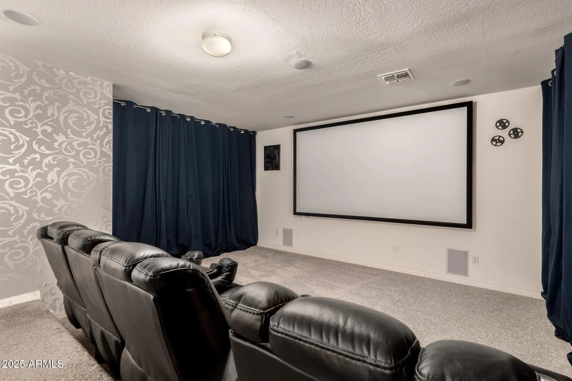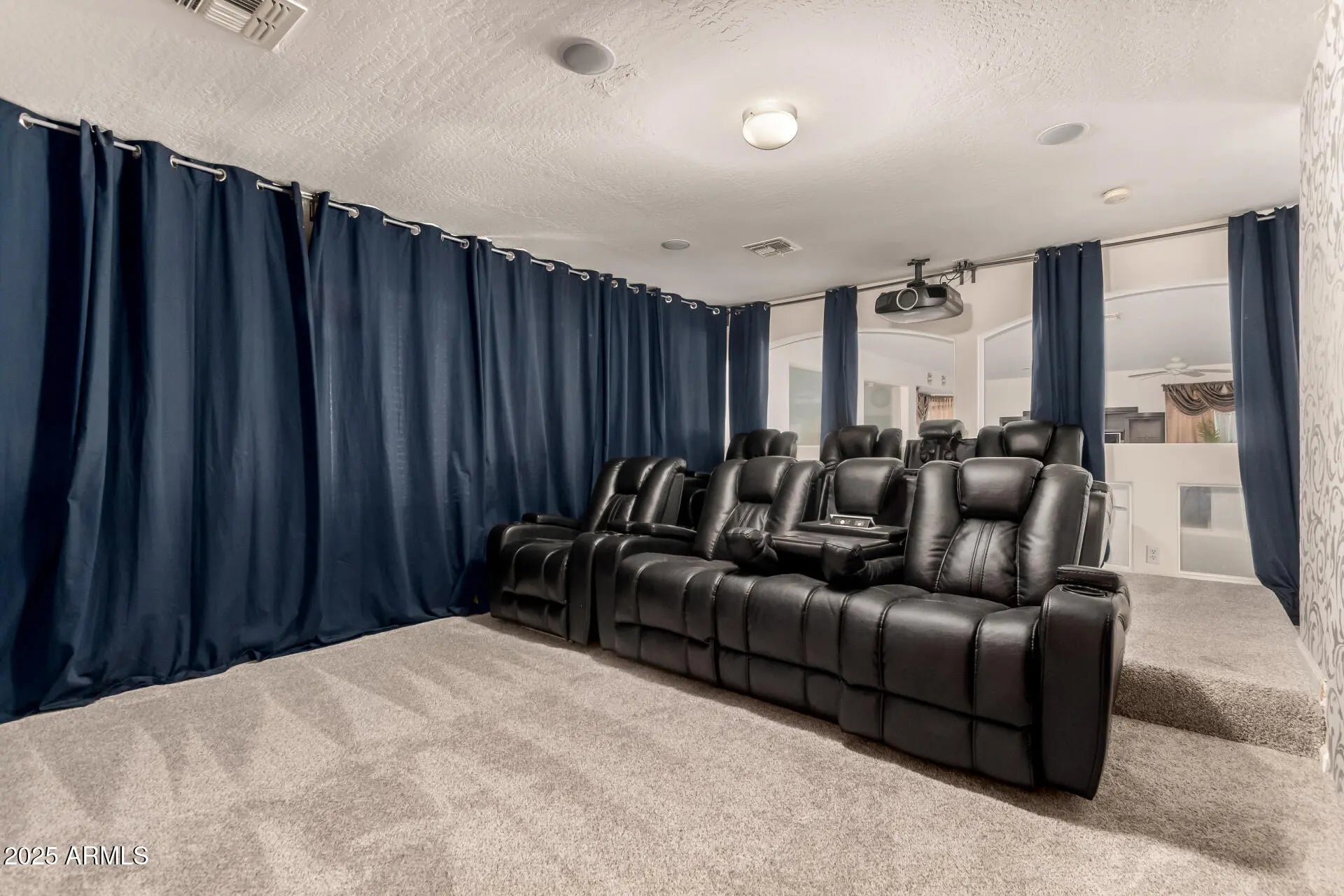 Come see this luxurious floorplan, featuring a downstairs master bedroom, multiple lofts, and custom theater room, with NEW CARPET and NEW EXTERIOR PAINT! From the moment you arrive and see the beautiful curb appeal and majestic architecture, you'll know this house is special, beyond the upgraded 2X6 construction. Enter to find soaring 20-foot ceilings and a welcoming living room with gas fireplace. Continue to find an upgraded kitchen with granite counters and plenty of cabinets, and a bar area off the family room. Head upstairs to the media room and feel free to sit in the theater recliners, since they are included in the sale, along with the audio equipment and the screen! 10,000sf lot means a HUGE backyard, and it comes with a full-length covered patio, plus a drive-through garage.