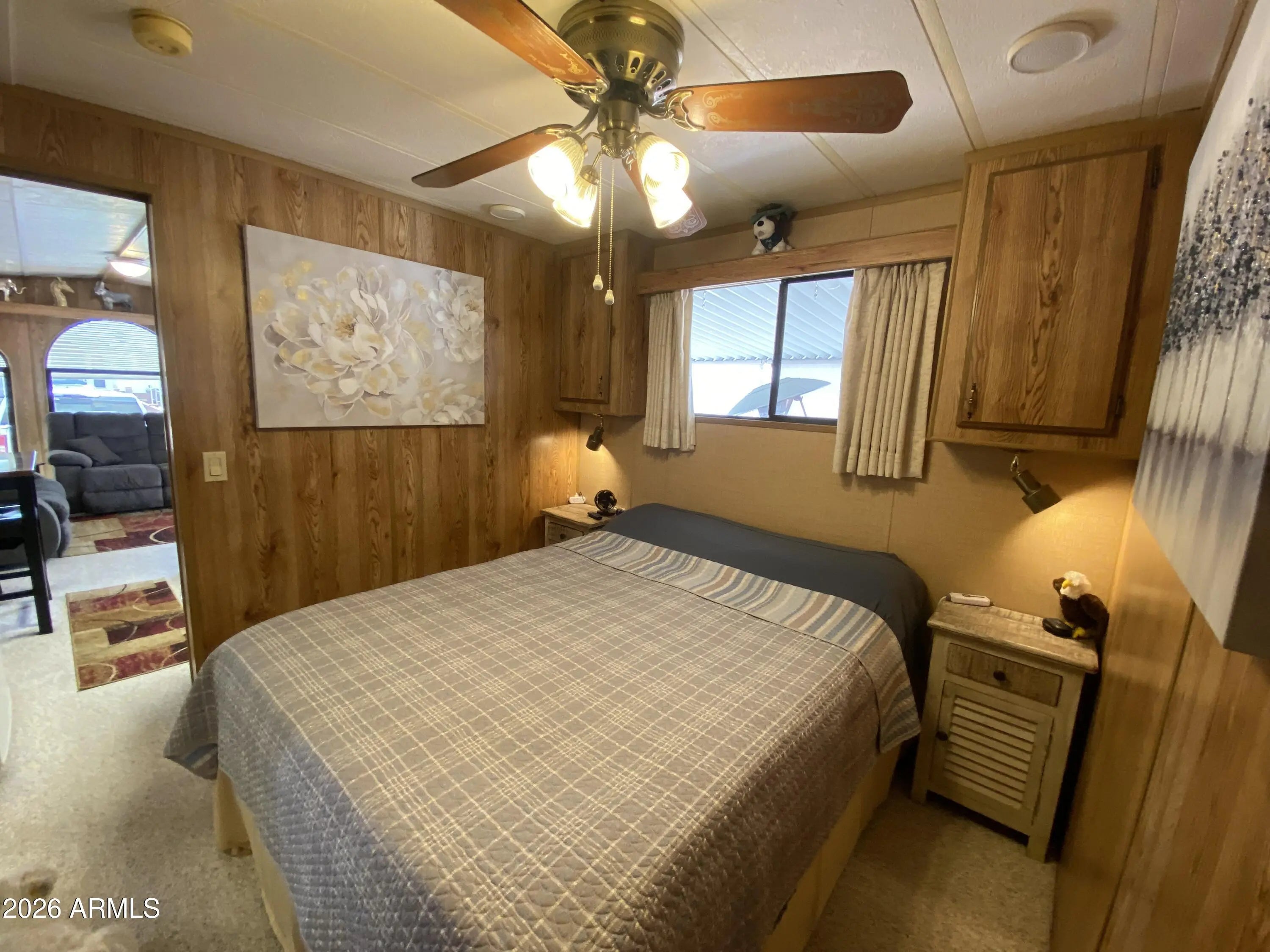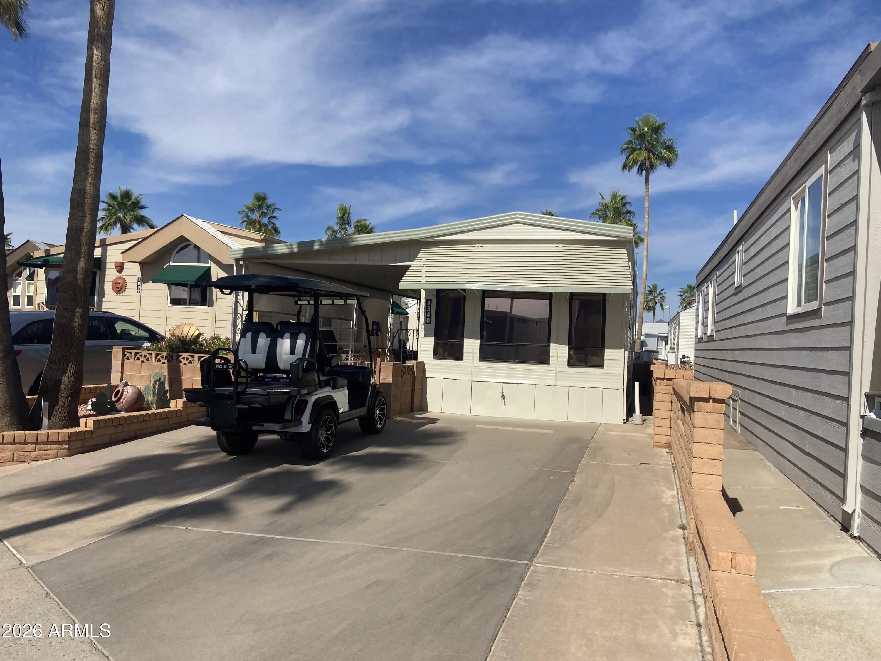 Own the land in this 55+ golf course resort. Incredibly clean and well taken care of unit on an extra deep lot (75ft) Plenty of parking for your vehicle and golf cart without taking away from outside entertaining space. Very roomy shed with brand new W/D purchased 1/2026. Exterior paint and roof sealant completed 1/2026. A/C & heat system professionally inspected 1/2026 and was given a great report and life expectancy. New hot water heater 2025. 2 reclining loveseats, 2 TV's, kitchen table, queen bed, dishes, utensils and cookware all stay!! 3 ft block wall around entire unit, great for dogs, and a front double gate entrance.