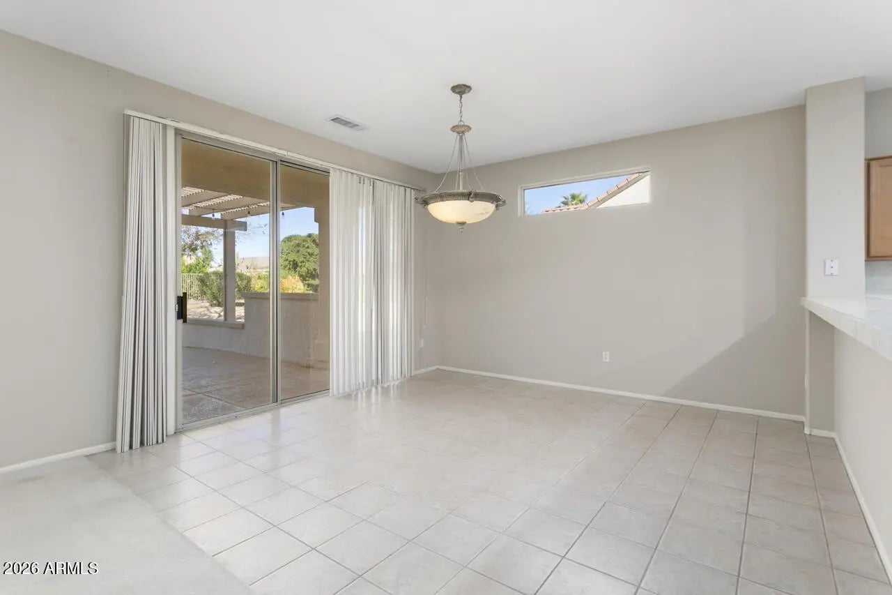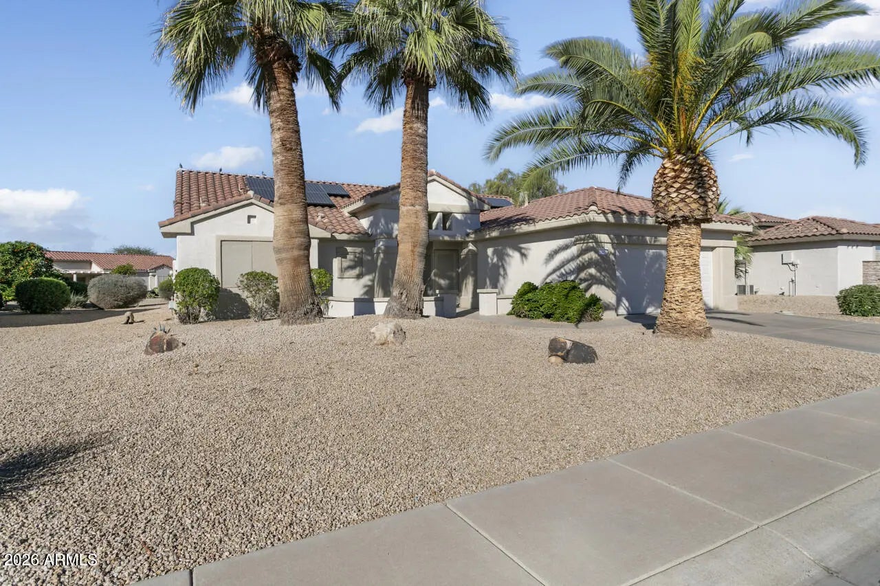 Popular Cholla model has great curb appeal, offers 2 bedrooms, 2 baths and a den. Inside, is a neutral palette, 12'' tile in key areas, kitchen has maple cabinetry, tiled countertops, an island, electric range, Whirlpool stainless refrigerator, a breakfast space and breakfast bar for extra seating. The great room has a built-in audio/visual wall and a formal dining space. The laundry room is inside and the 2 car garage has storage cabinets. The spacious backyard, extended covered patio with knee wall is perfect for outdoor living and entertaining. NEW Exterior paint. Landscape irrigation system has been replaced with PVC. Termite warranty-Tride and True. This home offers great bones, lots of potential to add your personal touches, and leased solar for future energy savings.