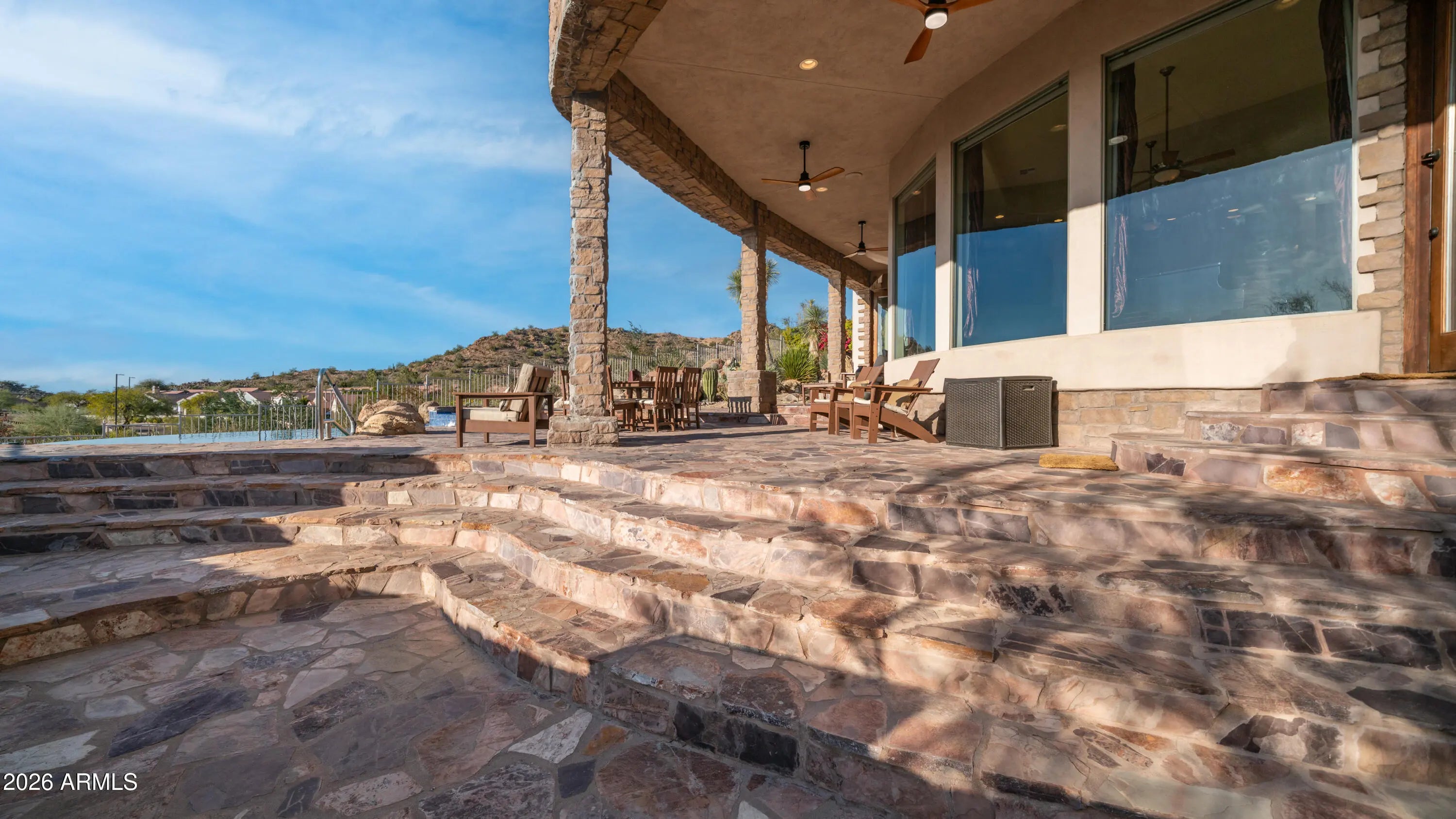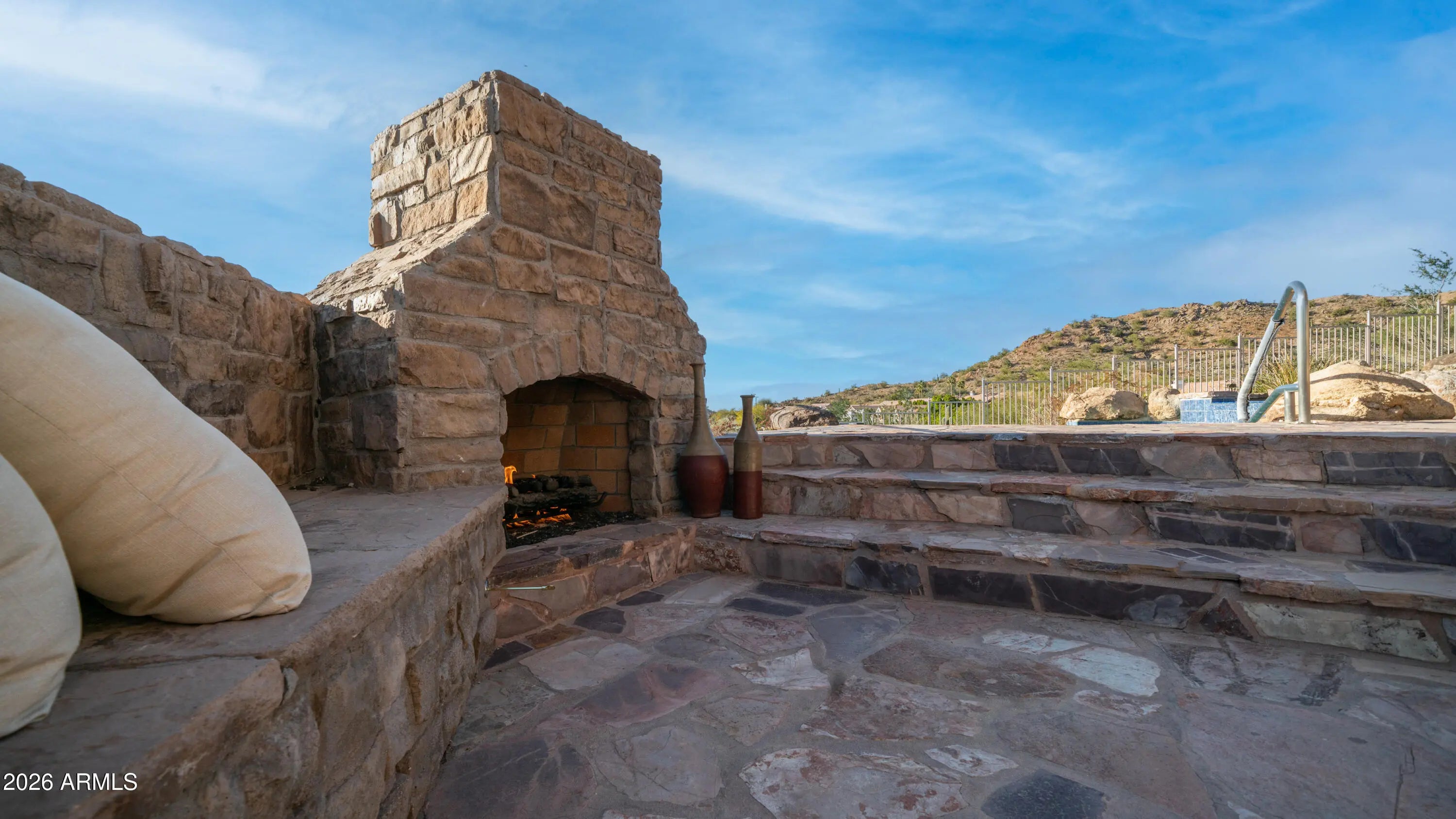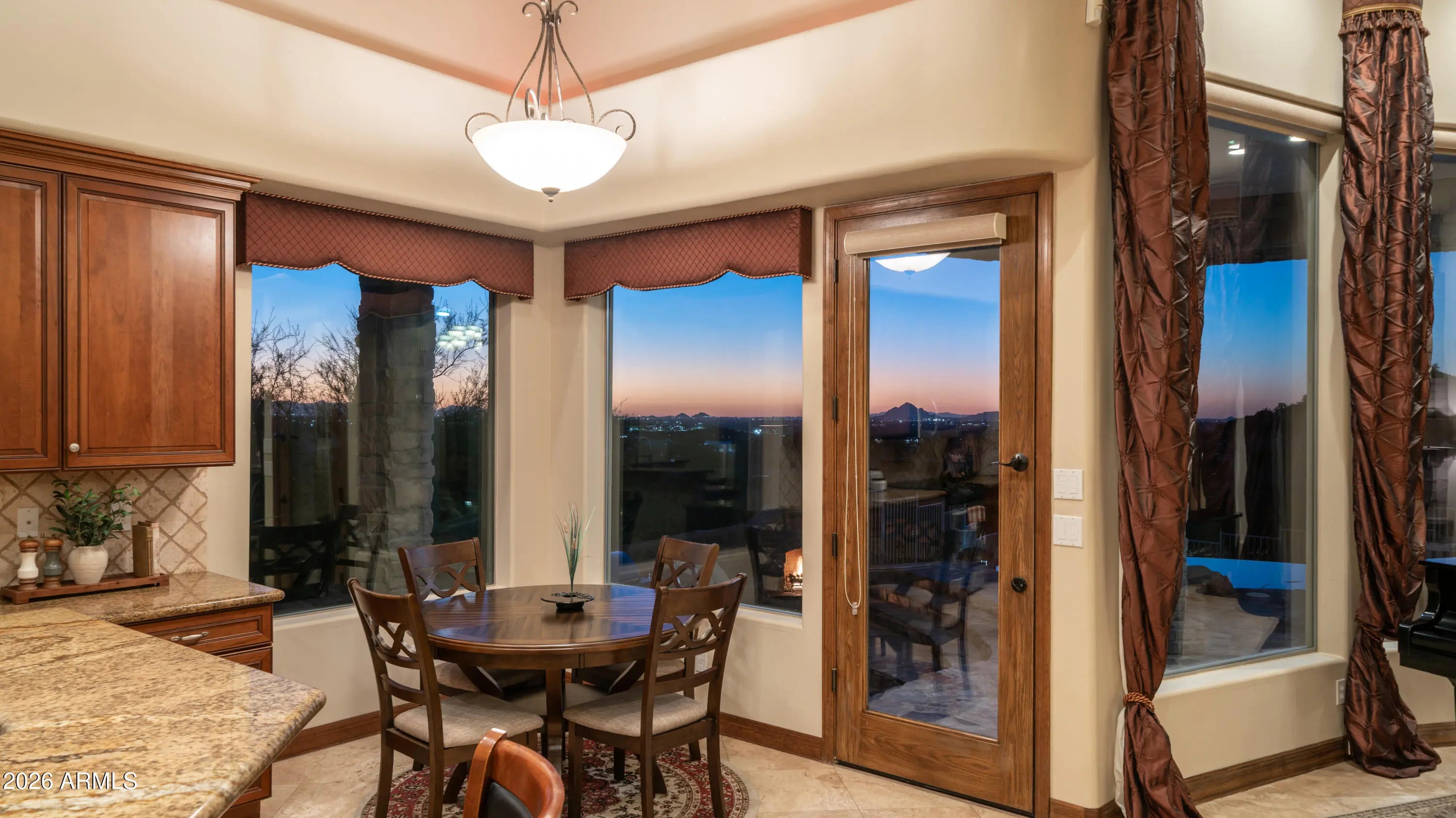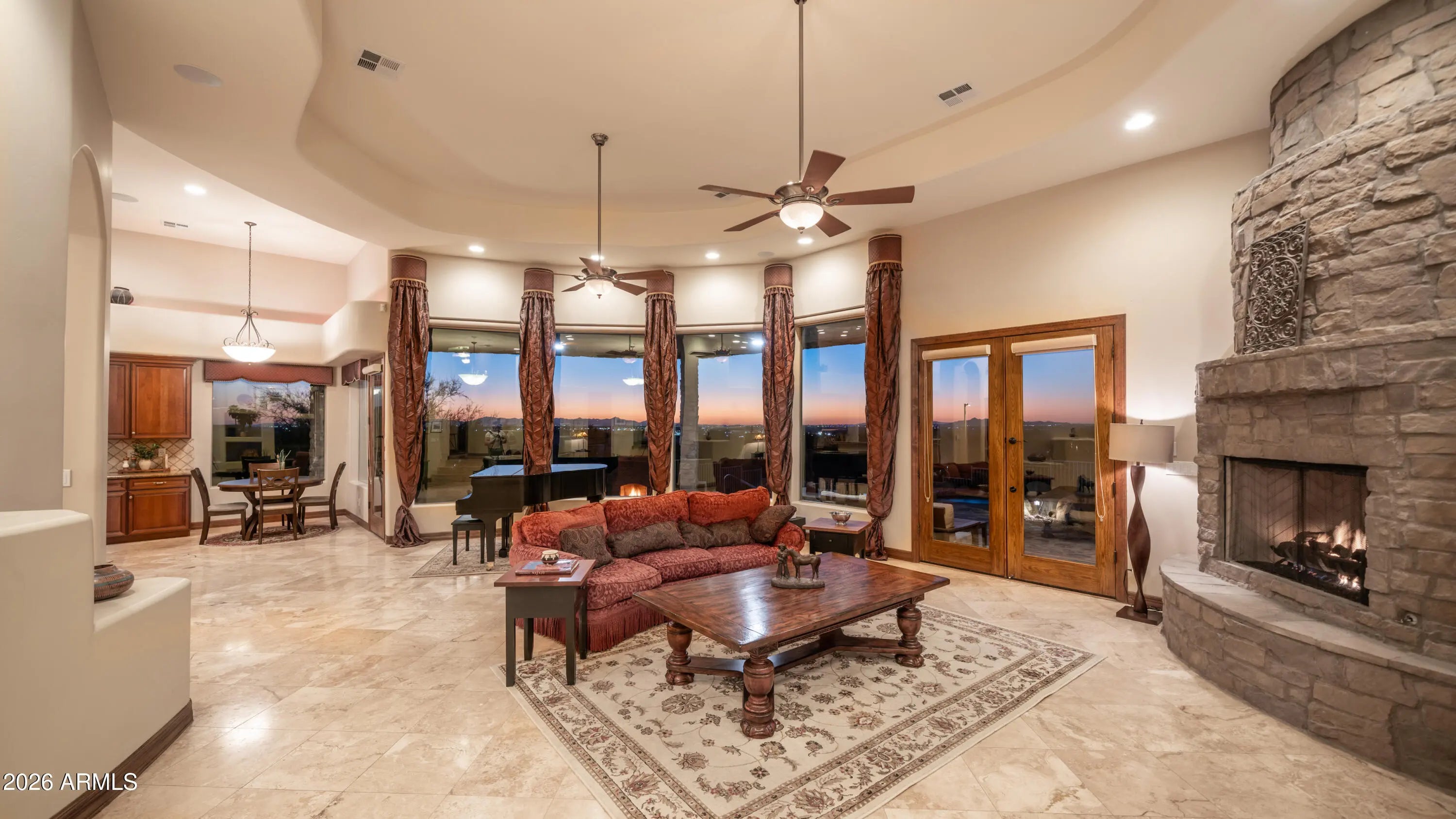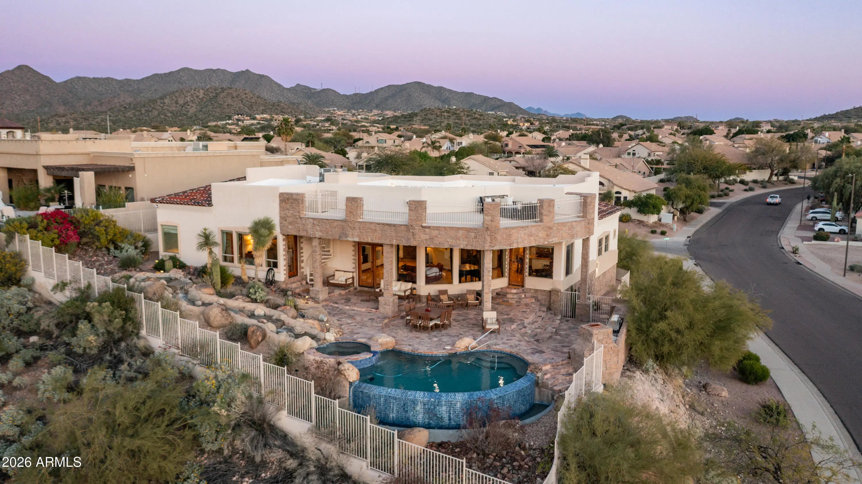 Million-dollar views and timeless Santa Fe architecture define this truly stunning, one-of-a-kind custom home, perfectly perched on an elevated corner lot in the prestigious Red Mountain Ranch golf course community. An expansive paved driveway leads to an impressive stone entry. The moment you enter, dramatic, unobstructed panoramic views command your attention, framed by a striking curved wall of windows that perfectly showcases the majestic mountains, twinkling city lights, and breathtaking Arizona sunsets. This architecturally stunning residence is truly rare, offering spectacular views from every window. Soaring 14-foot ceilings, travertine flooring, electric blinds, custom drapery, coffered ceilings, graceful arches, and stone accents come together to create refined, elegant living. The expansive great room showcases a dramatic curved stone fireplace with custom niches and offers a generous space for entertaining, and even a grand piano. The kitchen features beautiful Alder cabinetry, stainless steel appliances, a center island with sit-up breakfast bar, and seamlessly flows to the breakfast nook, great room, and formal dining room, ideal for both everyday living and hosting gatherings. Offering 3,502 sq ft, this thoughtfully designed home includes 3 bedrooms, 3 baths, plus a private office with a Murphy bed and its own entrance, perfect as a fourth bedroom. A large second sitting room/bonus room, that can easily convert to a fifth bedroom. One bedroom is thoughtfully situated in its own private wing, making it ideal for a guest suite or multigenerational living. The primary retreat is a true sanctuary, featuring expansive windows that frame stunning views. The spa-inspired primary bathroom offers dual vanities, a walk-in shower, a corner jetted soaking tub, and a spacious walk-in closet. Step outside to an entertainer's dream backyard, where even more breathtaking views await. Featuring a 45-foot covered patio, a stunning negative-edge pool and spa with cascading water features, and an outdoor kitchen complete with a stone fireplace. A spiral staircase leads to an expansive deck with spacious seating areas and breathtaking 360-degree views, stretching from the golf course and surrounding mountains to sparkling city lights and unforgettable desert sunsets. This is true desert luxury living in a Santa-Fe style masterpiece, offering some of the most spectacular views in the Valley. Red Mountain Ranch offers an array of amenities, including an 18-hole Championship Golf Course, Restaurant, Tennis Courts and a new Gated Park with Pickleball Courts, Pool/Spa, and Fitness Center with an optional membership fee. Conveniently located just minutes from the Tonto National Forrest with some of the best Hiking and Biking Trails and just 15 minutes to Saguaro Lake and the Salt River, 20 minutes to Sky Harbor and Williams Gateway Airports, Scottsdale, and close to Shops, Restaurants.