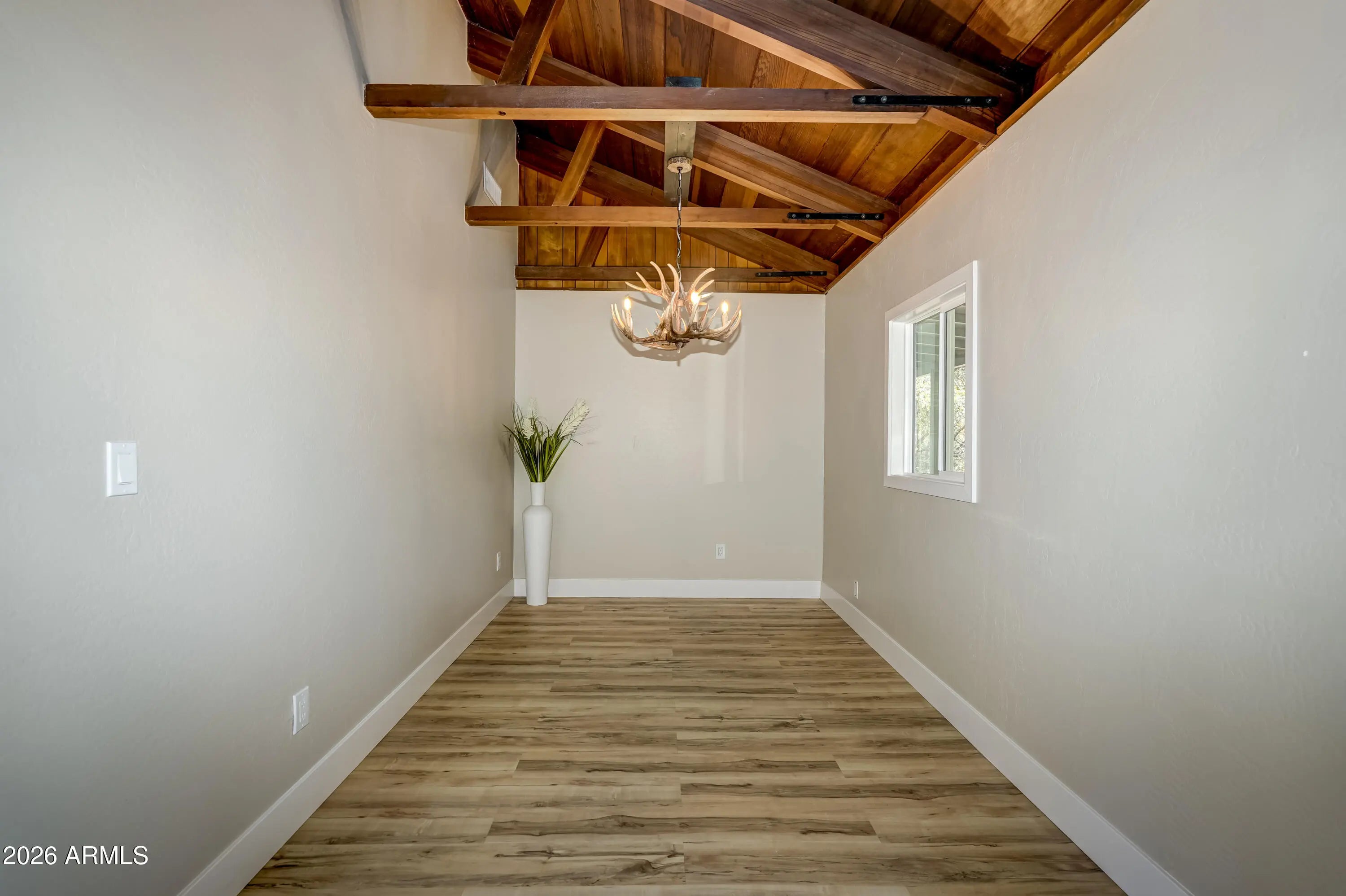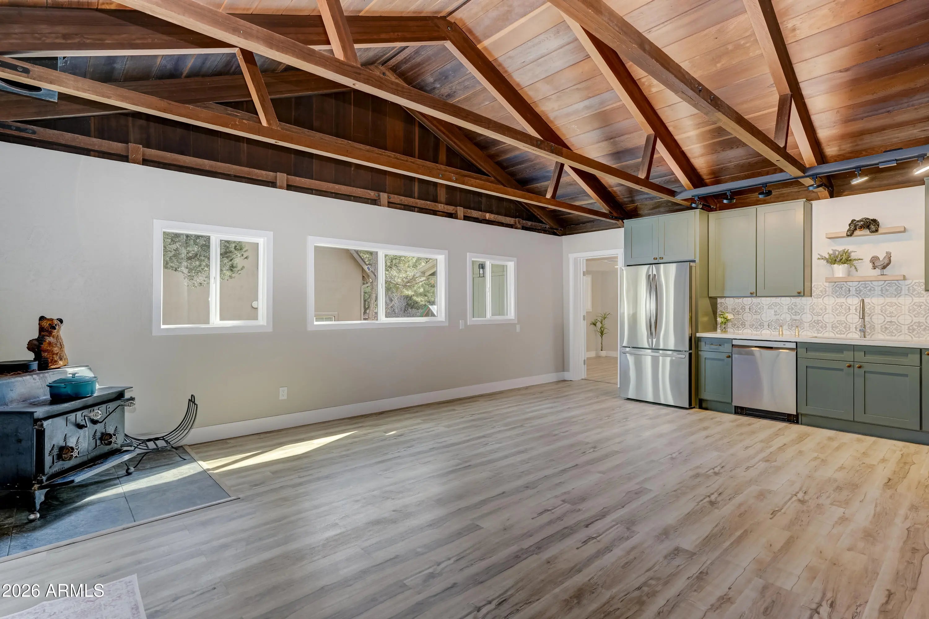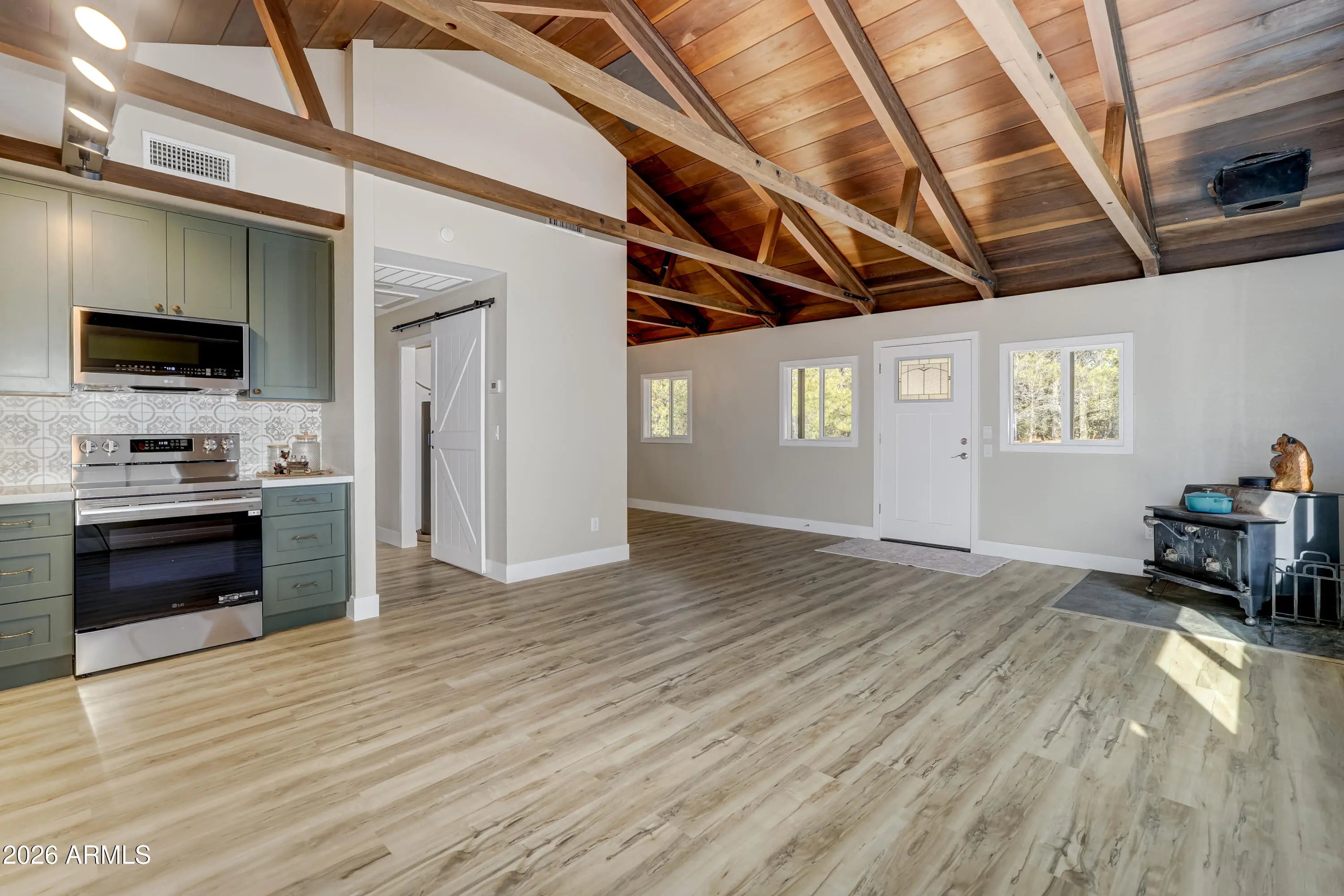 Beautifully updated cabin retreat in the pines of Groom Creek! This move-in-ready home blends rustic charm with modern upgrades, featuring soaring ceilings with exposed wood beams, custom LED lighting, brand-new waterproof LVP flooring, updated cabinetry, and new appliances. Major improvements include a new roof (2024), new septic system (2024), and energy-efficient windows (2025). Spacious split floorplan with a large primary suite and 2 additional bedrooms with a separate bathroom for added privacy. Enjoy the oversized front porch--perfect for relaxing, taking in the fresh mountain air, and watching local wildlife. A turnkey mountain getaway with timeless character and modern comfort!