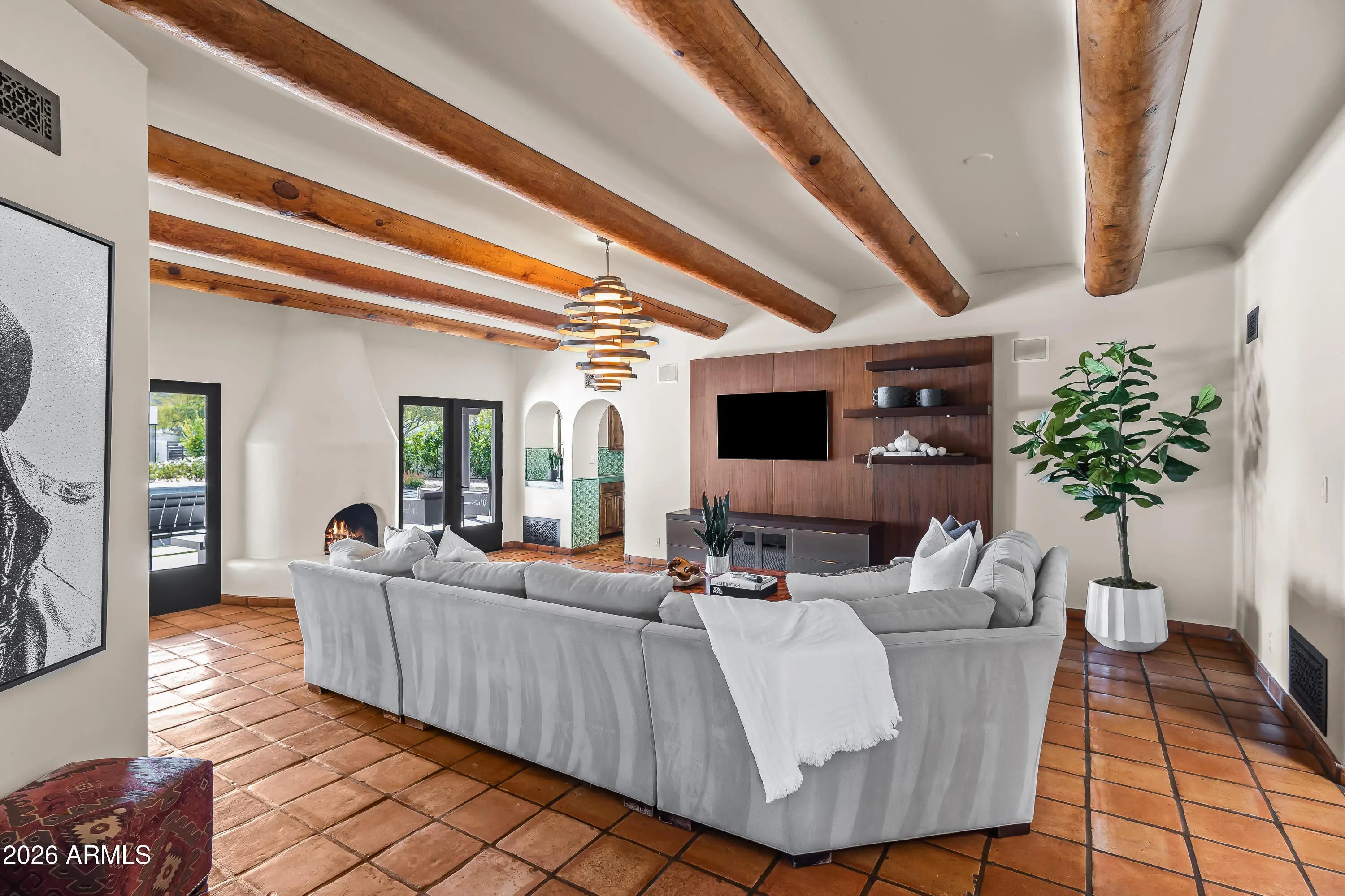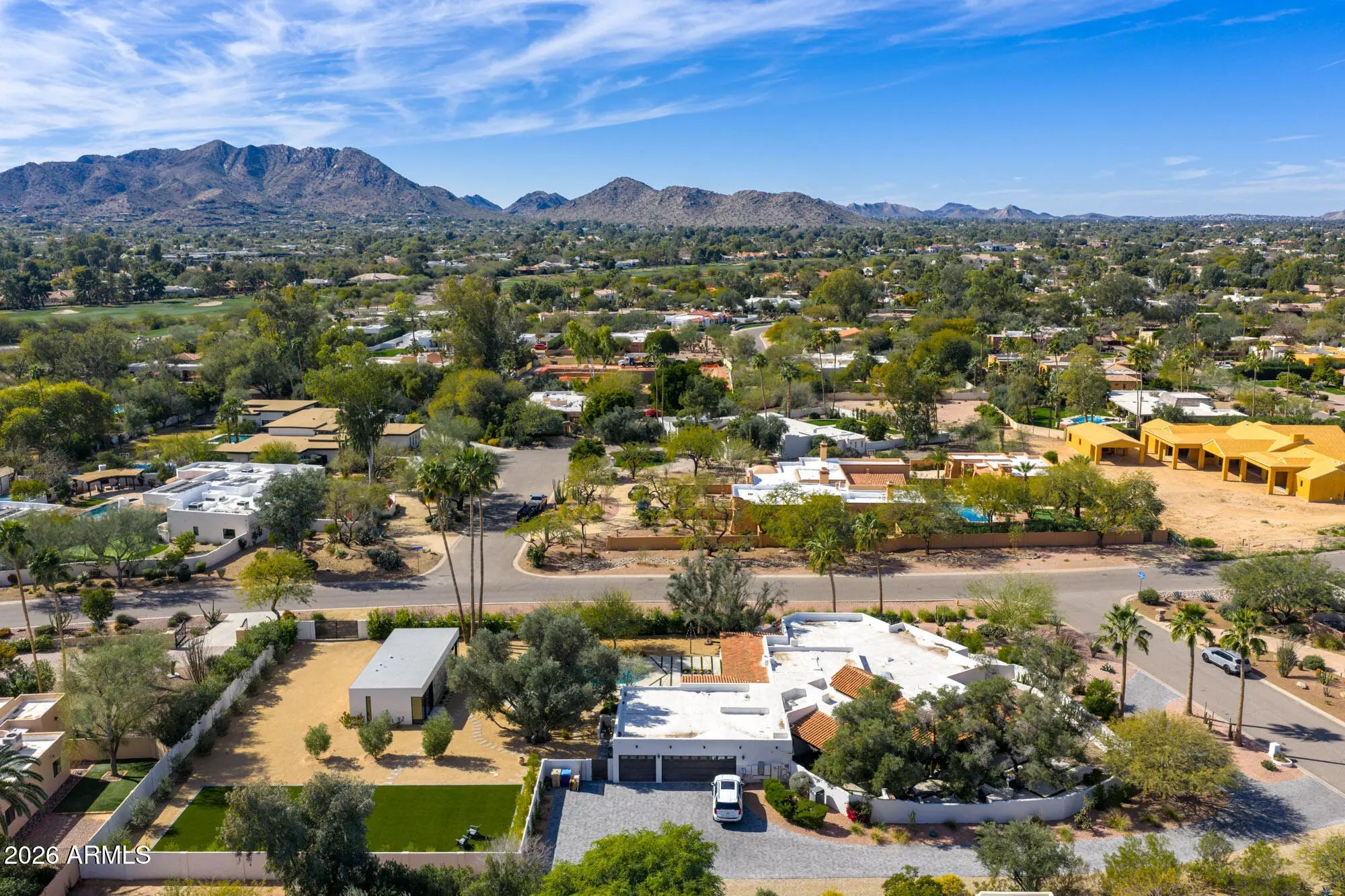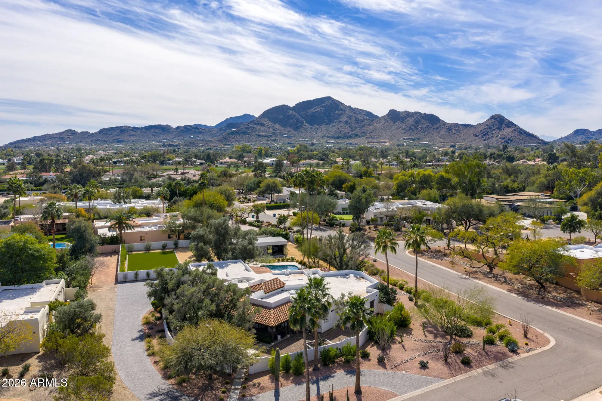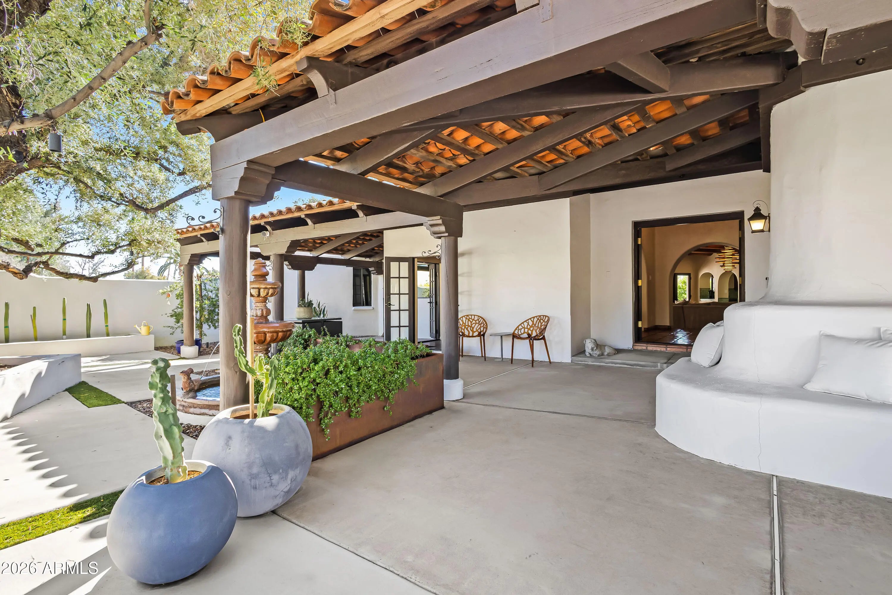 Crafted by Nance Construction, this timeless Spanish-style estate is privately positioned in the heart of Paradise Valley and framed by sweeping mountain views. Rich architectural character defines the residence, from arched entryways and hand-laid Saltillo tile to exposed wood beam ceilings and adobe fireplaces that anchor the home with warmth and authenticity. Expansive windows and multiple French doors bathe the interiors in natural light while creating effortless indoor-outdoor living. The thoughtfully designed floor plan offers both intimate gathering spaces and elegant entertaining areas, including a formal dining room and a spacious family room complete with a wet bar and custom built-in shelving. The chef's kitchen blends charm and function, featuring a central island, built-in breakfast nook, gas range, and floor-to-ceiling custom wood cabinetry offering abundant storage. The primary suite serves as a private retreat, highlighted by its own adobe fireplace, a dedicated sitting room, direct backyard access, and a spa-inspired bath with an oversized walk-in shower and separate built-in tub. The expansive backyard is designed for year-round enjoyment, showcasing a custom pool, covered patios, exterior fireplace, and fire pit all surrounded by mature trees and expansive lawns. A private enclosed courtyard and desert landscaping enhance the estate's sense of seclusion and arrival. New detached guest house offers exceptional flexibility for entertaining or multi-generational living, complete with a living room, kitchen, and one bedroom with full bath. An extraordinary opportunity to own a true Spanish estate in one of Paradise Valley's most sought-after locations, moments from Arizona's premier resorts, golf, dining, and shopping.