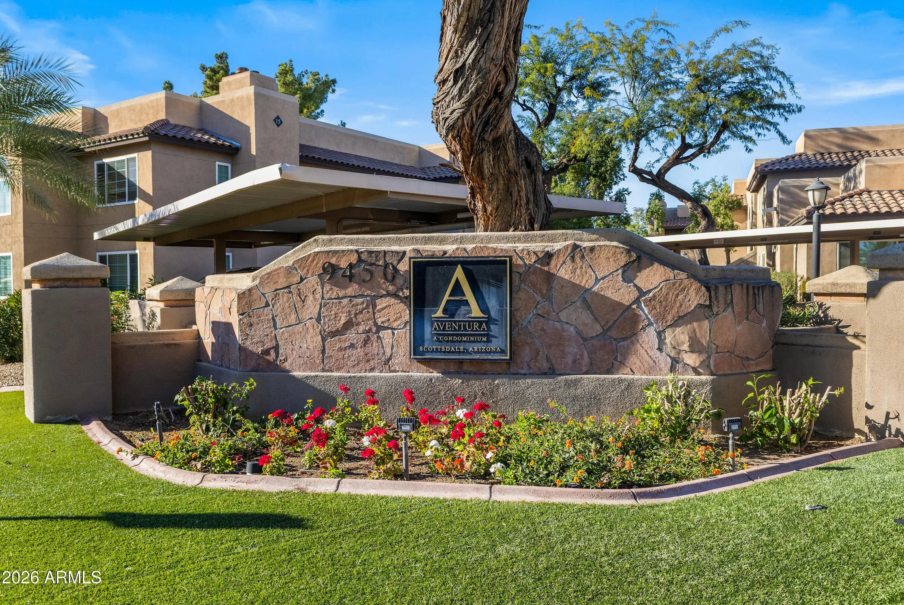 Lovely one-bedroom, one-bathroom condo located on the desirable A-side of Aventura, offering a quiet setting farthest from Shea Blvd. Enjoy peaceful green lawn views and is just steps from the community's pool and BBQ. This turnkey residence is being offered fully furnished with curated Copenhagen and Crate & Barrel furniture, artwork, a Dyson air purifier, a Vitamix, Roomba vacuum, truly move-in ready from day one. The light-filled living room features rich Merbau wood flooring, a cozy fireplace with updated tile surround, and large windows that bring in natural light and tranquil greenery views. Sliding glass doors open to a private covered balcony. The kitchen has been tastefully updated with granite countertops, an updated backsplash, stainless steel appliances, granite sink, modern faucet, and refreshed lighting, seamlessly connecting to the dining area. The spacious bedroom accommodates a king-size bed and includes a ceiling fan and walk-in closet. The bathroom has been updated with granite counters and a travertine shower with glass enclosure. Additional improvements include new windows, a new sliding glass door, and a hot water tank replaced in 2023. This unit includes in-unit laundry, extra storage, one assigned covered parking space, and a highly coveted PRIVATE GARAGE an exceptional bonus within the community. Residents enjoy access to Aventura's resort-style amenities including three pools, two spas, tennis courts, and barbecue areas.
