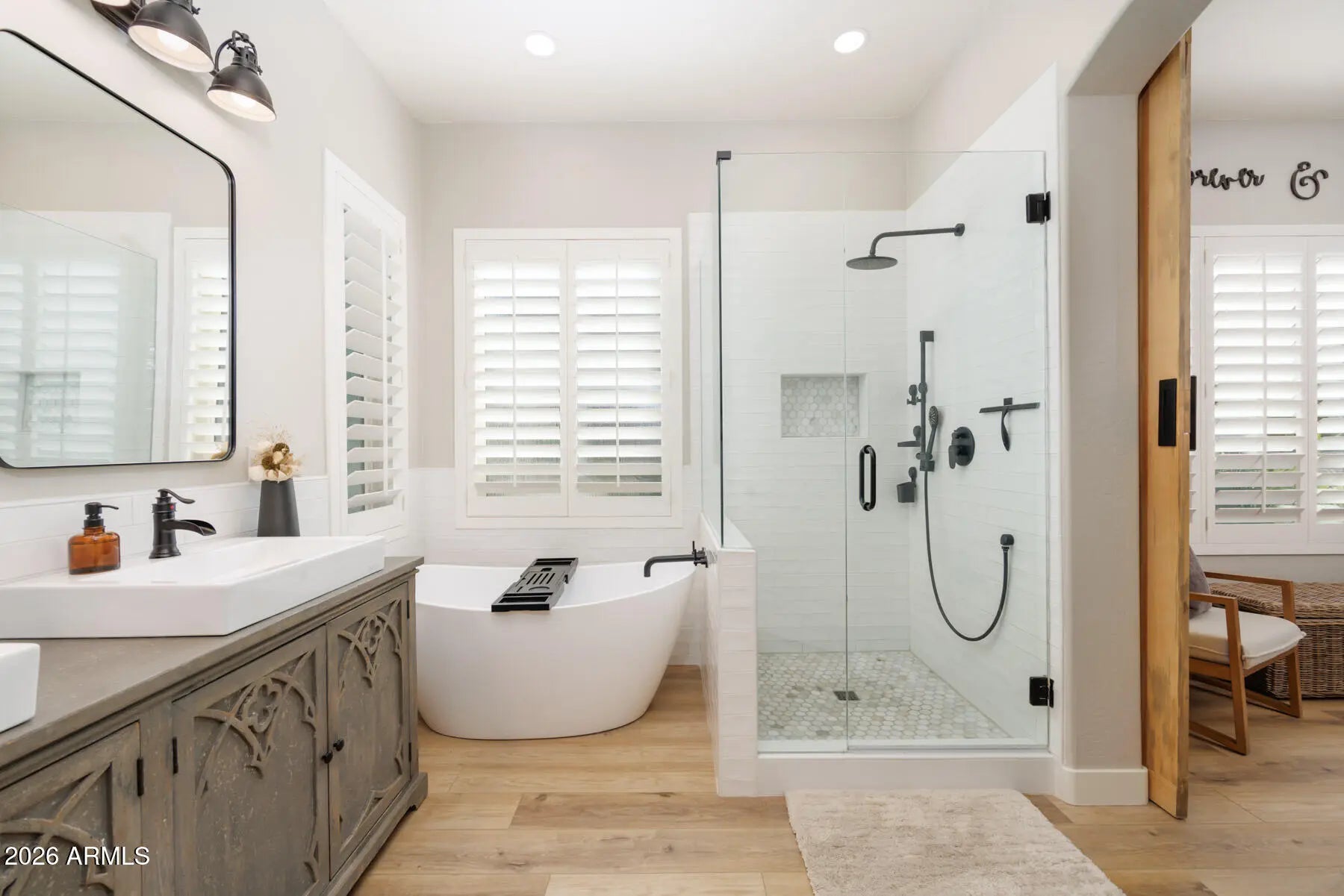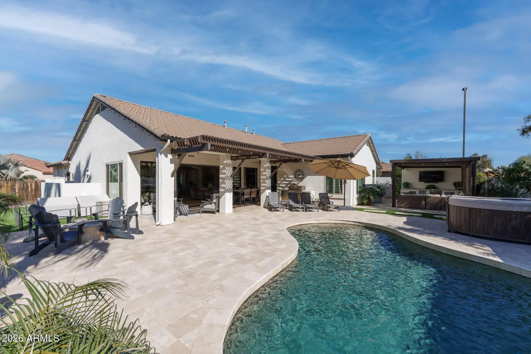 Welcome to this beautifully renovated home in the highly sought after Seville Golf Club community. Situated on a desirable corner lot with a three car garage, this home has been thoughtfully redesigned from top to bottom with custom details that truly set it apart. From the covered front porch to the low maintenance synthetic grass in the front yard, the curb appeal sets the tone from the moment you arrive. Step inside to an open concept layout featuring a desirable split floor plan, luxury vinyl plank flooring, and plantation shutters throughout. The kitchen is the true centerpiece of the home, showcasing two oversized islands with custom wood surrounds, refinished cabinetry, and crisp white quartz countertops. It opens seamlessly to the main living and dining areas, creating a space that feels both refined and welcoming, ideal for everyday living or gathering with friends and family. Expansive accordion doors create effortless indoor outdoor living, leading to a private backyard retreat complete with a covered patio, heated pool and spa, and a pergola equipped with a built in BBQ and refrigerator. This backyard was designed for year round entertaining. The primary suite offers a peaceful escape with a stunning bathroom carefully designed with one of a kind finishes, delivering a true spa like experience, along with a spacious walk in closet. With over $300,000 invested in upgrades, this home has been completely transformed, including custom cabinetry, plantation shutters, custom wrapped kitchen islands, luxury vinyl plank flooring, beautifully remodeled bathrooms, fresh interior paint, epoxy garage flooring, a fully redesigned backyard, and more. No detail was overlooked. Located within Seville Golf Club, residents enjoy access to exceptional amenities including championship golf, a resort style pool, fitness center, tennis courts, pickleball, dining, and a vibrant community atmosphere.This is a rare opportunity to own a truly turnkey, custom upgraded home in one of the East Valley's premier golf communities.