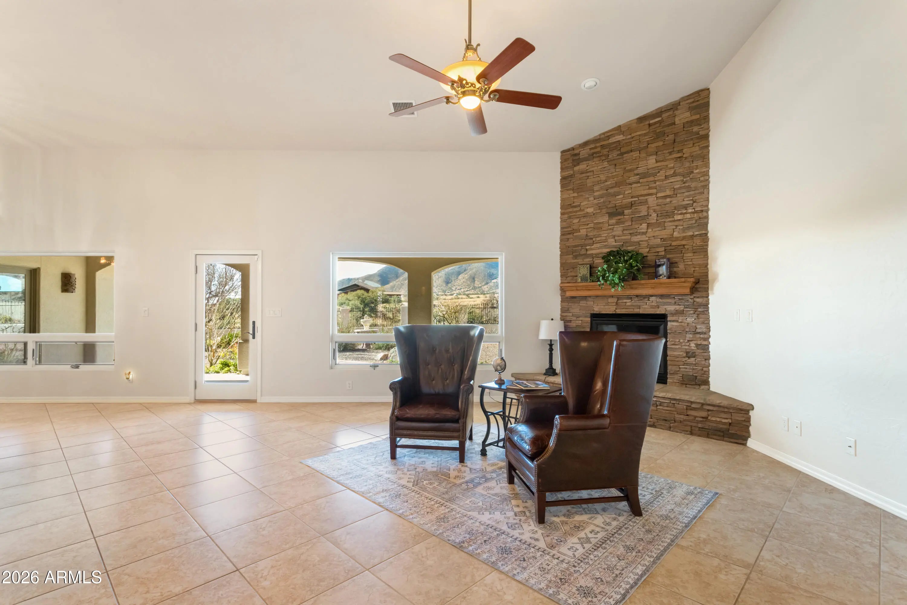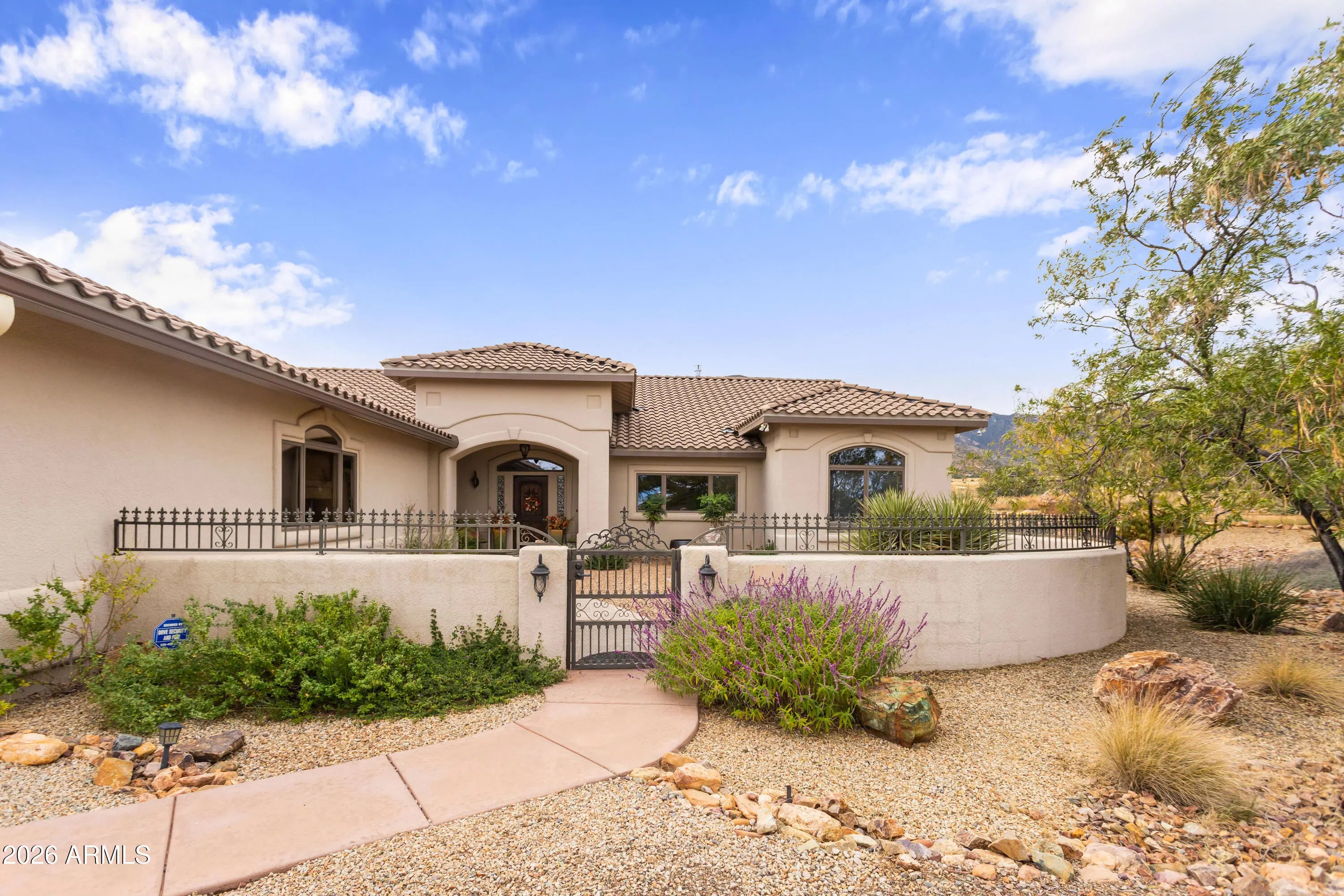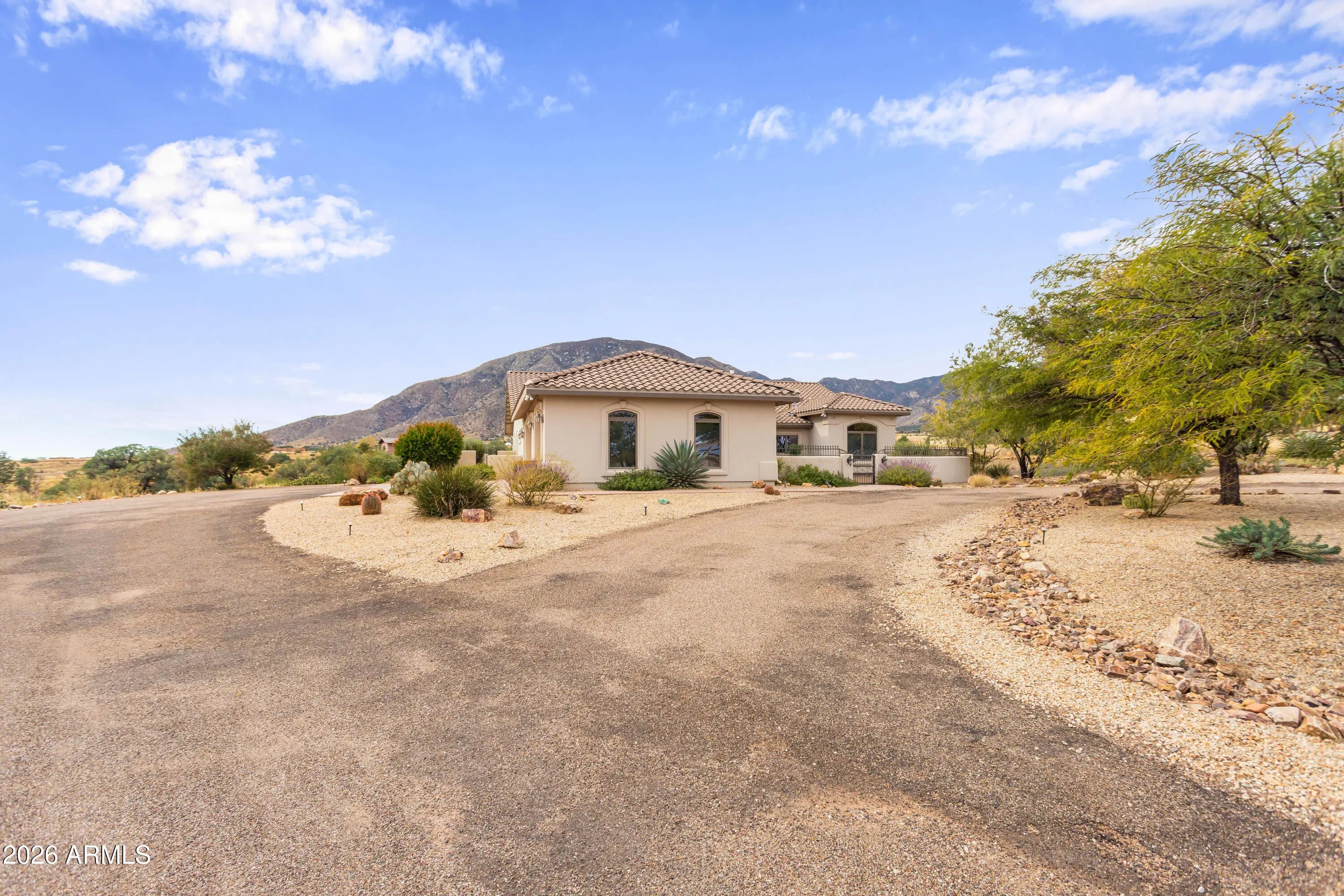 Gorgeous Walston custom home Wild Horse subdivision, perfectly situated on 3.5 acres with breathtaking 360° mountain views of the Huachuca, Mule, and San Jose ranges. Professional landscaping enhances the horseshoe driveway and private courtyards with custom iron gates. Inside, enjoy Anderson windows, vaulted ceilings, granite countertops, a breakfast bar, downdraft cooktop, and custom Alderwood cabinetry with roll-out shelves. The living room features a dramatic floor-to-ceiling stone propane fireplace. The fenced backyard offers privacy, custom desert landscaping, and expansive views. Both bathrooms include granite and Alderwood finishes; primary bath featuring a snail shower, and semi-private toilet. Primary suite includes a versatile bonus room ideal for an office, gym, or retreat.