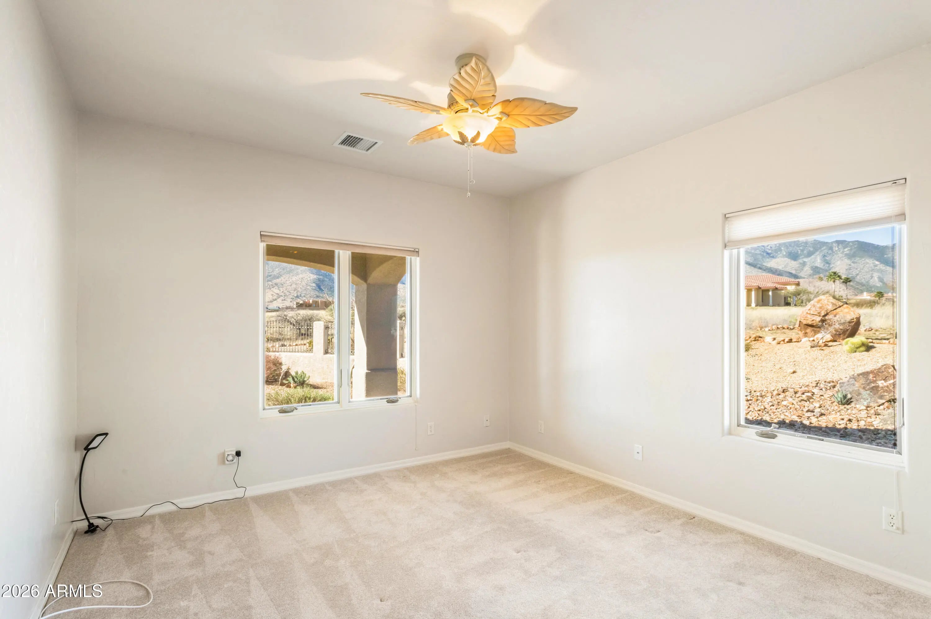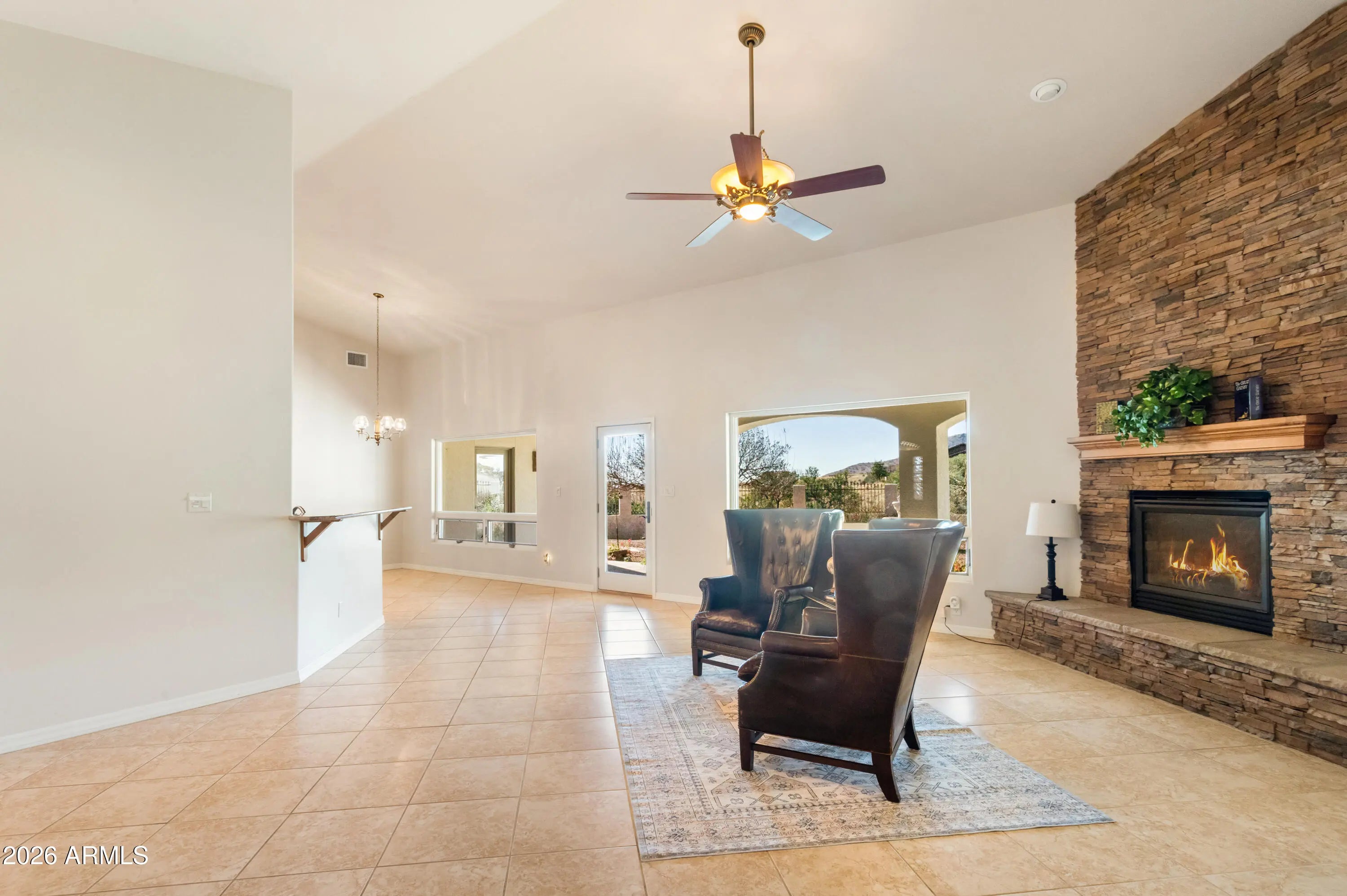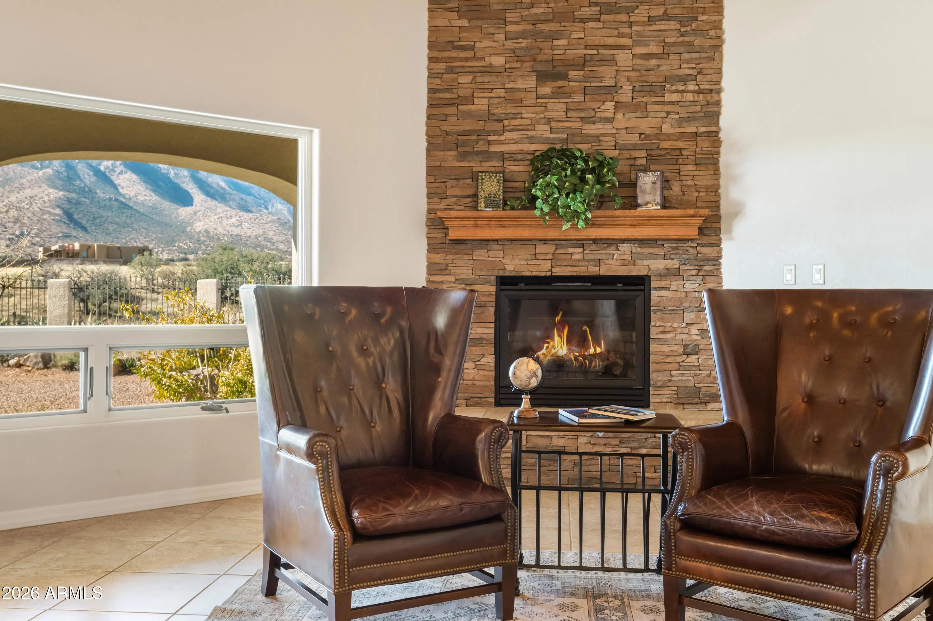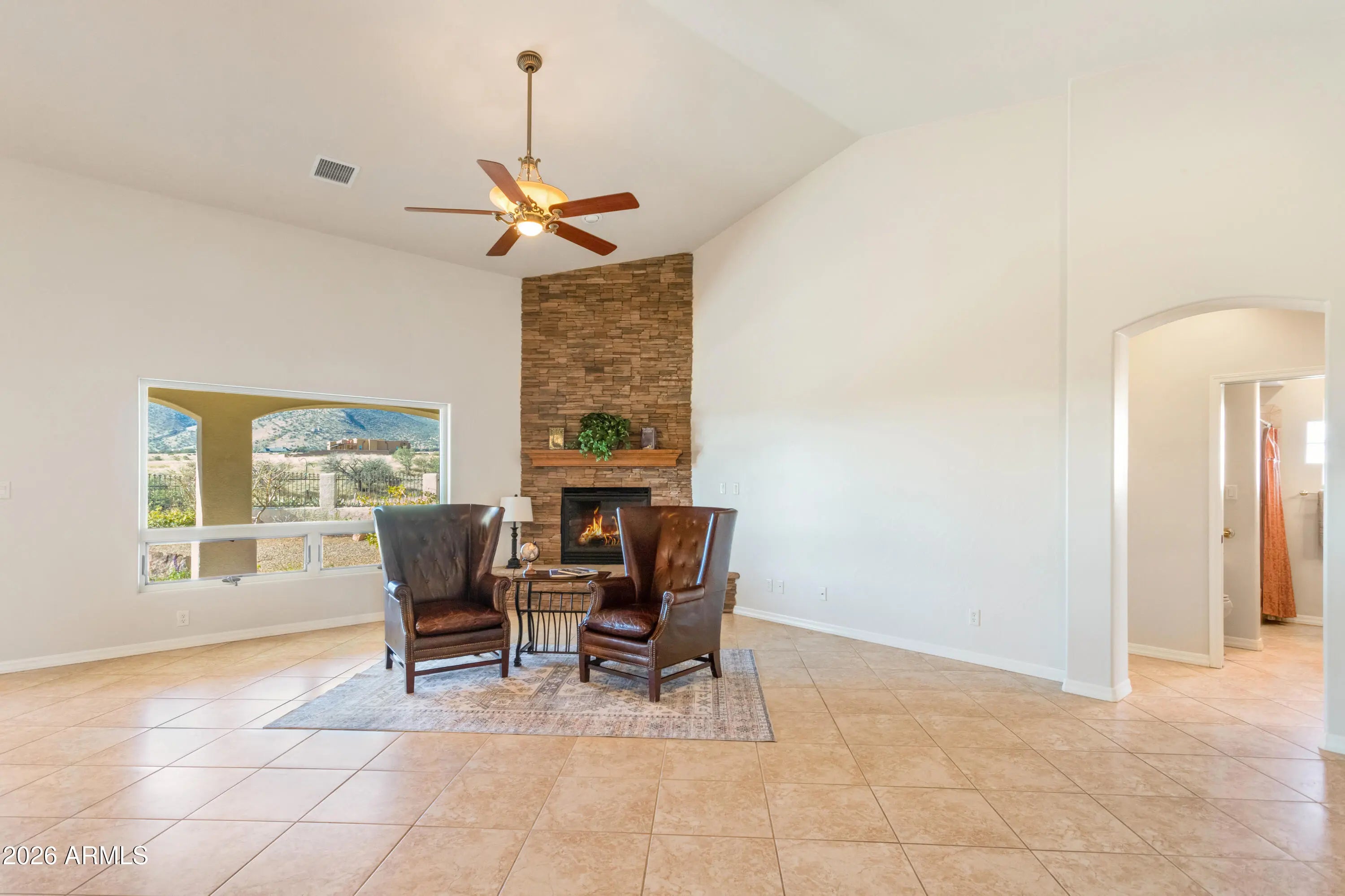 Gorgeous Walston custom home Wild Horse subdivision, perfectly situated on 3.5 acres with breathtaking 360° mountain views of the Huachuca, Mule, and San Jose ranges. Professional landscaping enhances the horseshoe driveway and private courtyards with custom iron gates. Inside, enjoy Anderson windows, vaulted ceilings, granite countertops, a breakfast bar, downdraft cooktop, and custom Alderwood cabinetry with roll-out shelves. The living room features a dramatic floor-to-ceiling stone propane fireplace. The fenced backyard offers privacy, custom desert landscaping, and expansive views. Both bathrooms include granite and Alderwood finishes; primary bath featuring a snail shower, and semi-private toilet. Primary suite includes a versatile bonus room ideal for an office, gym, or retreat.