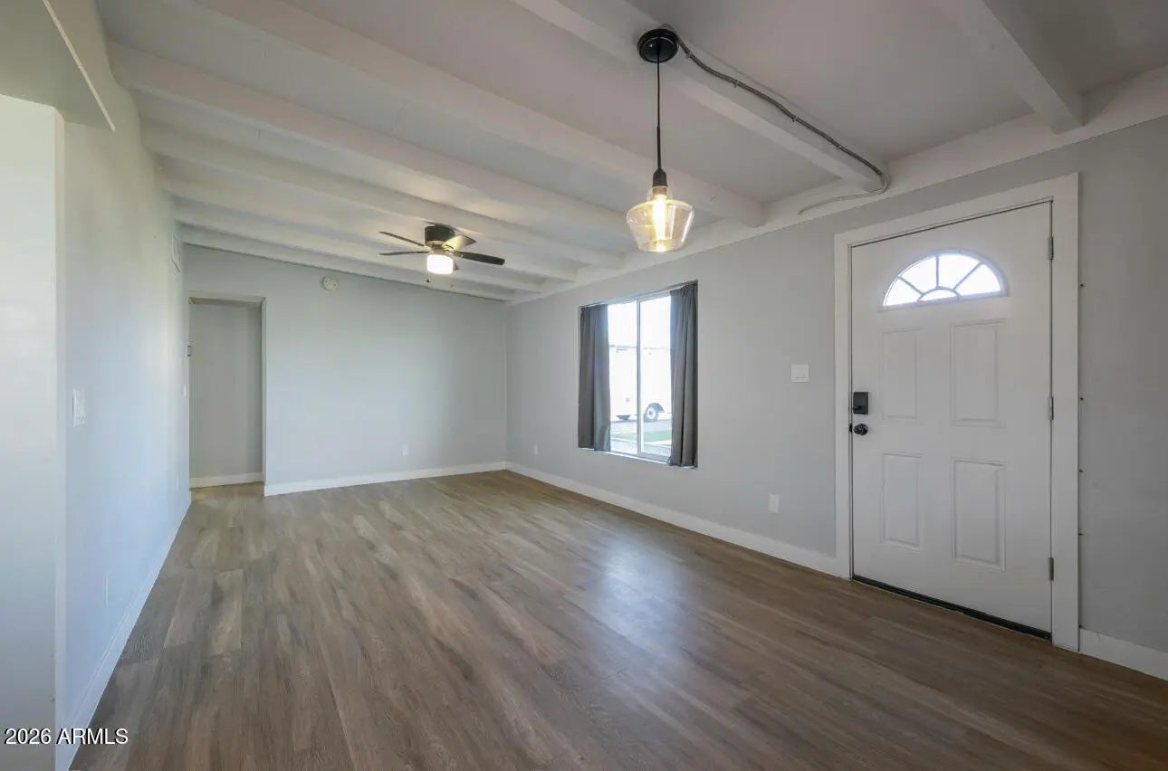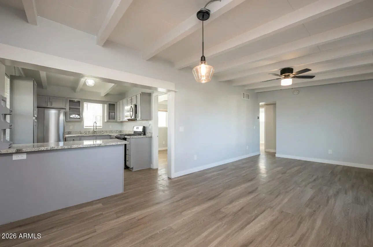 Charming, fully remodeled mid-century block home in a desirable, established Phoenix neighborhood! Ideally located within walking distance to shopping, grocery stores, dining, and schools, with an easy commute to downtown Phoenix, Sky Harbor, and Encanto Golf Course. This single-level home sits on a large lot and features exposed beams, abundant natural light, updated flooring, and fresh neutral paint. The modern kitchen offers sleek cabinetry, granite countertops, stainless steel appliances, and a gas range. Updates include new windows, doors, electrical panels, bathrooms, and interior finishes. Enjoy a spacious backyard with low-maintenance landscaping, turf and rock, a covered patio, extra storage sheds, and a cooled shop with laundry--ideal as a studio, flex space, or primary.