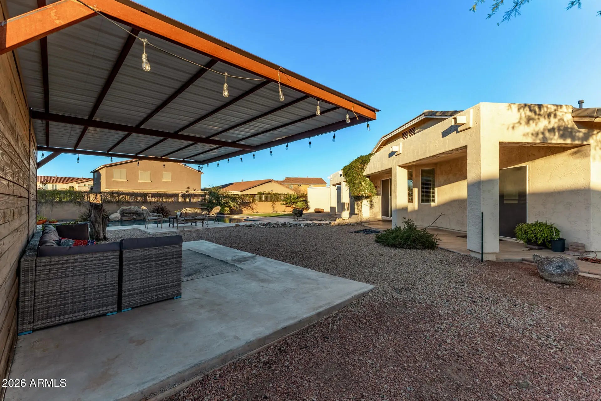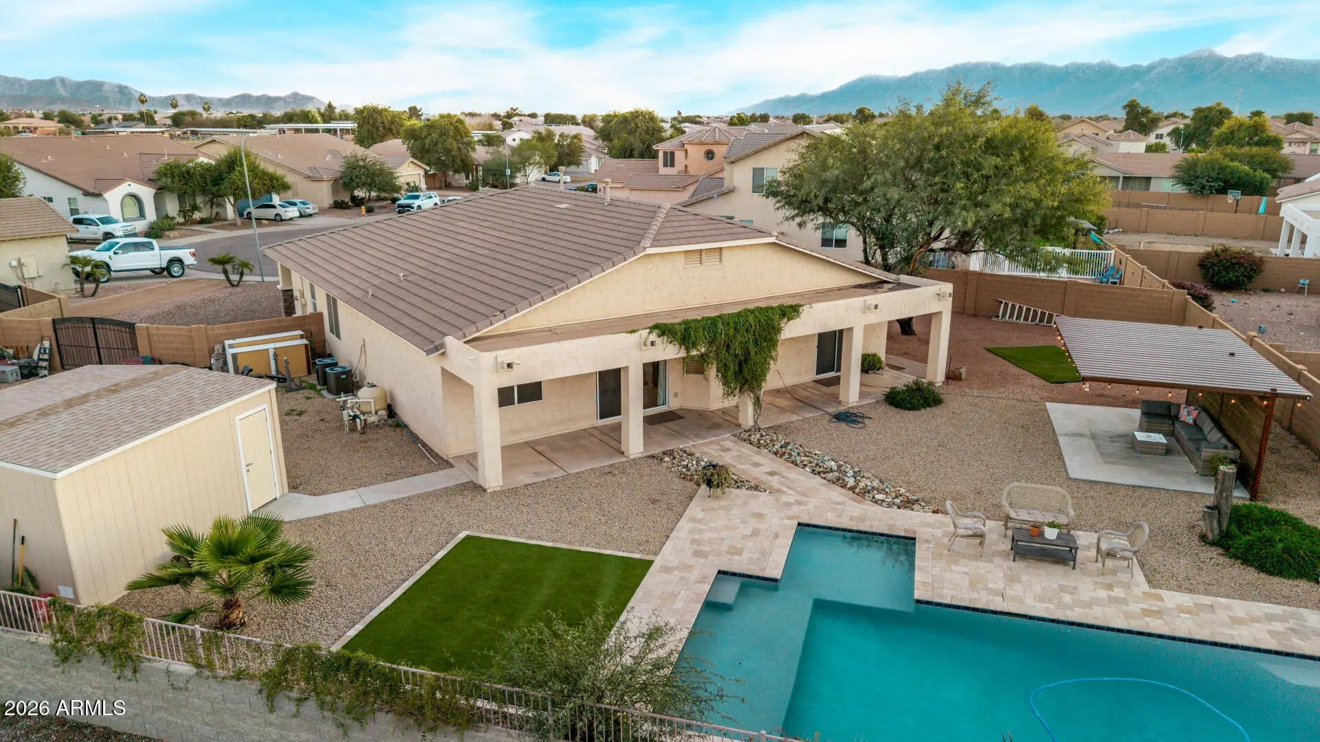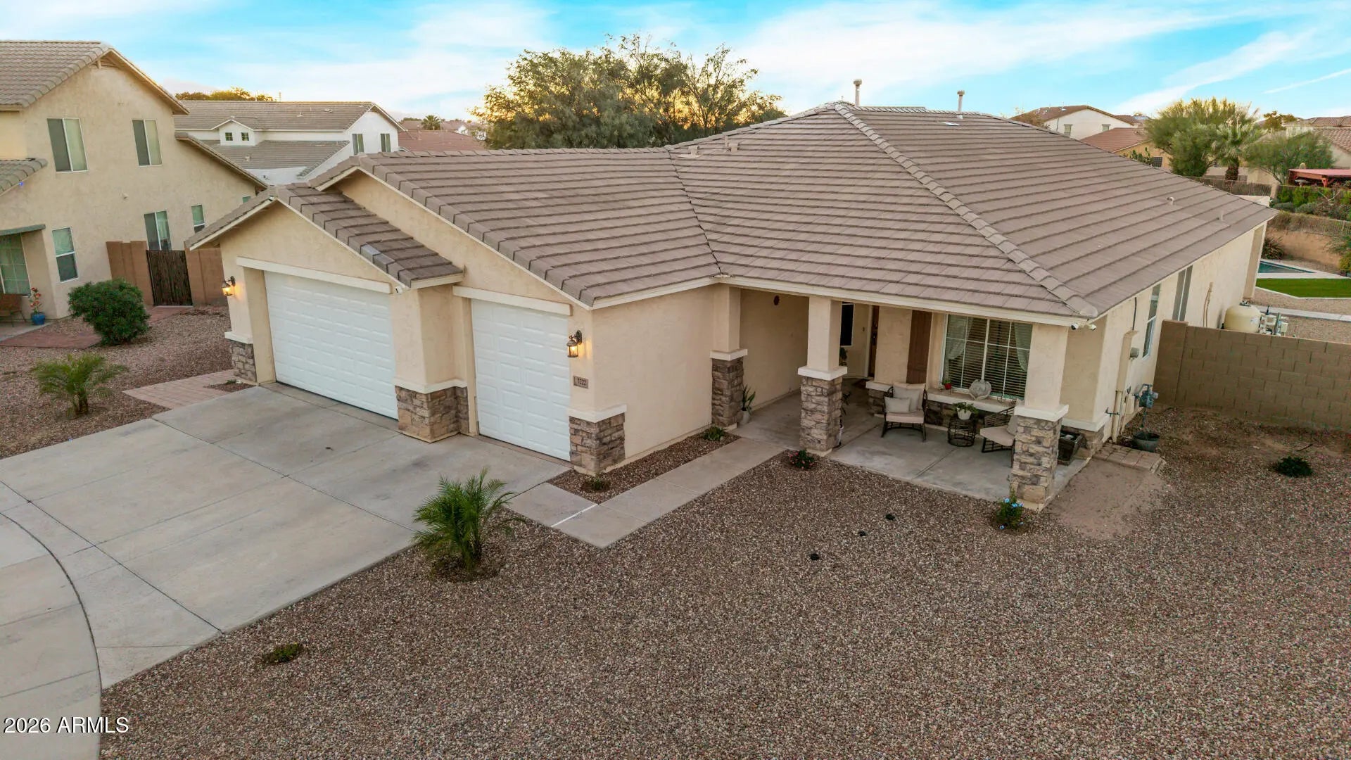 This well-maintained single-story home features an open layout with neutral finishes and a desirable 3-car garage. The kitchen offers white cabinetry, granite countertops, stainless steel appliances, and a breakfast bar that opens to the main living area. The spacious primary bedroom includes a walk-in closet and an en-suite bath with dual sinks, a separate shower, and a soaking tub. The living room provides ample natural light and direct access to a huge backyard with a covered patio, turf, a sparkling pool, and a ramada—ideal for relaxing or entertaining. Additional highlights include low-maintenance desert landscaping and a covered back porch. Conveniently located near shopping, dining, and commuter routes, this move-in ready home offers comfortable everyday living.