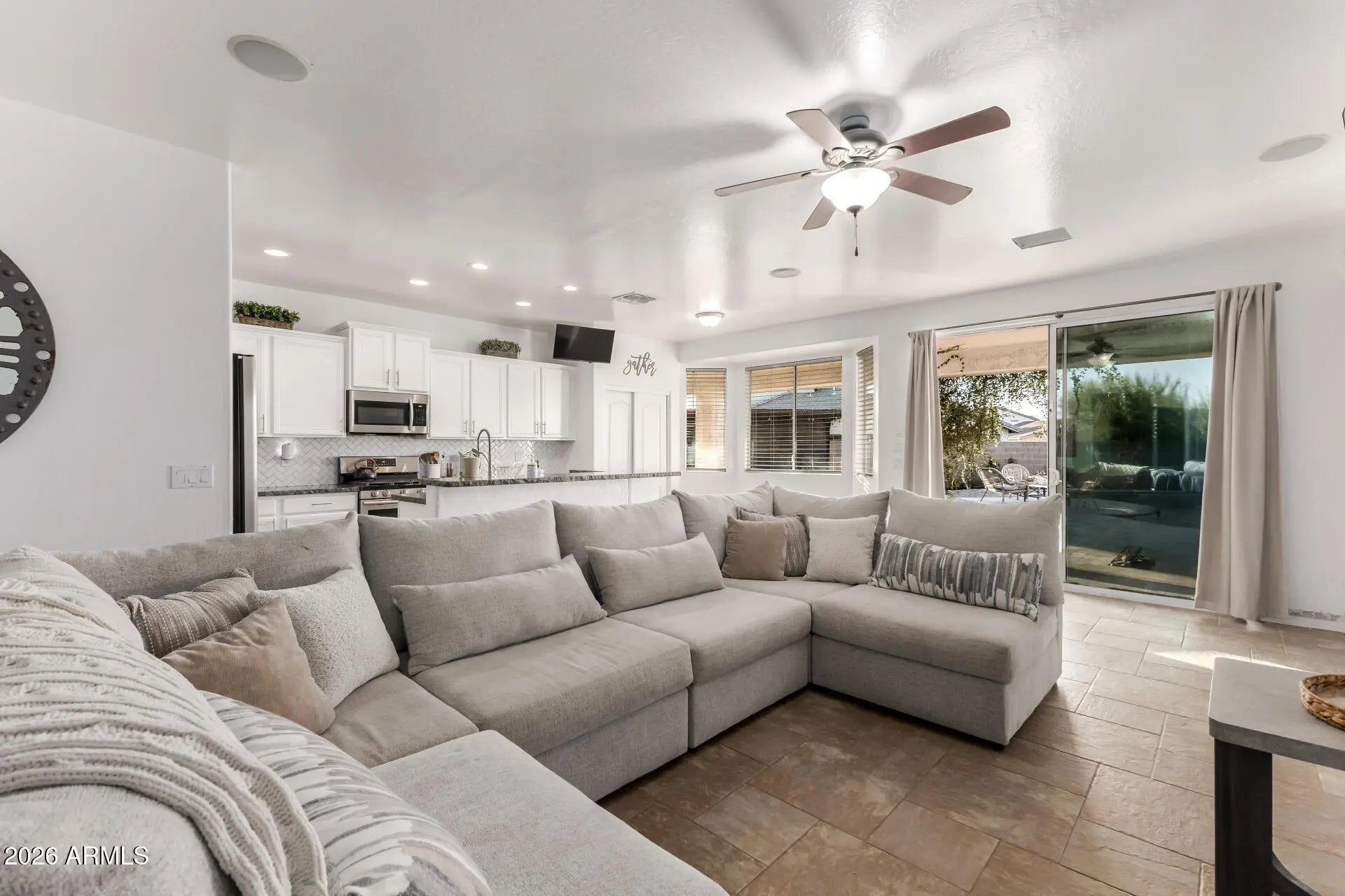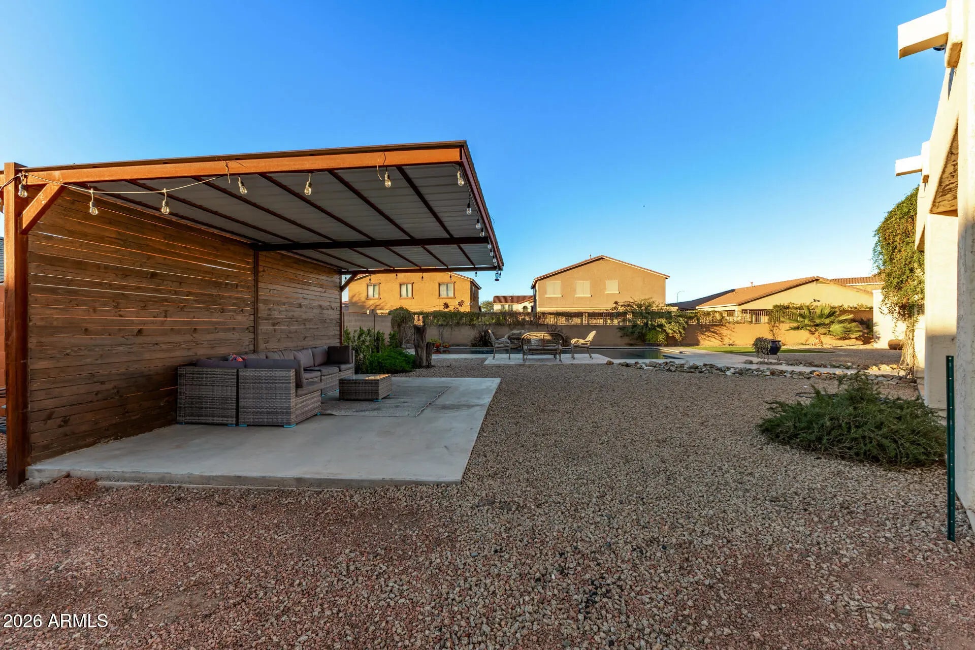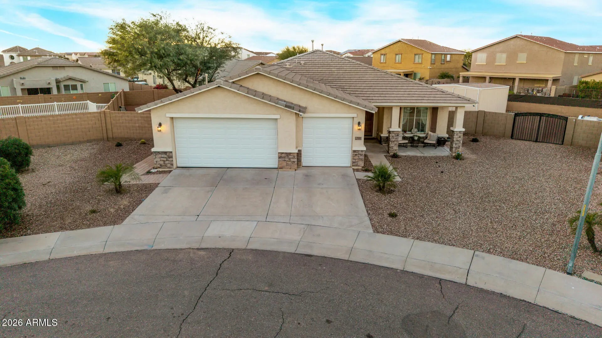 This well-maintained single-story home features an open layout with neutral finishes and a desirable 3-car garage. The kitchen offers white cabinetry, granite countertops, stainless steel appliances, and a breakfast bar that opens to the main living area. The spacious primary bedroom includes a walk-in closet and an en-suite bath with dual sinks, a separate shower, and a soaking tub. The living room provides ample natural light and direct access to a huge backyard with a covered patio, turf, a sparkling pool, and a ramada—ideal for relaxing or entertaining. Additional highlights include low-maintenance desert landscaping and a covered back porch. Conveniently located near shopping, dining, and commuter routes, this move-in ready home offers comfortable everyday living.