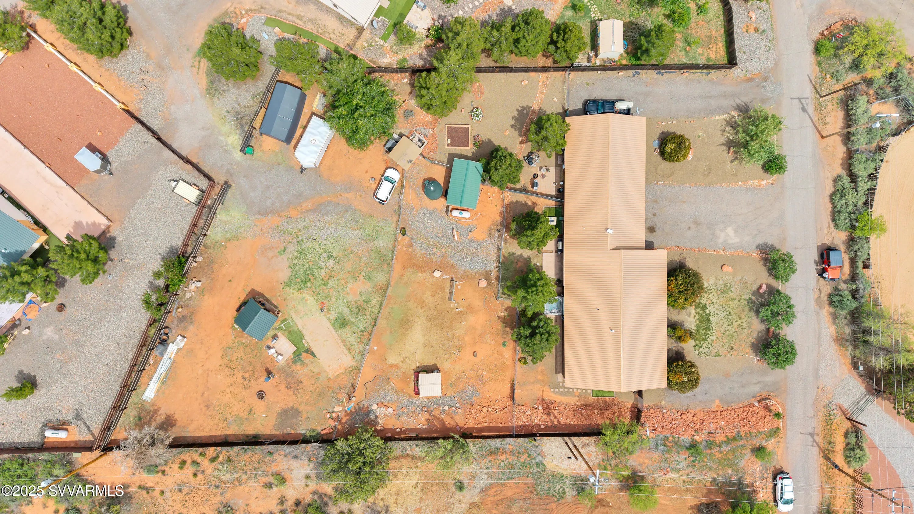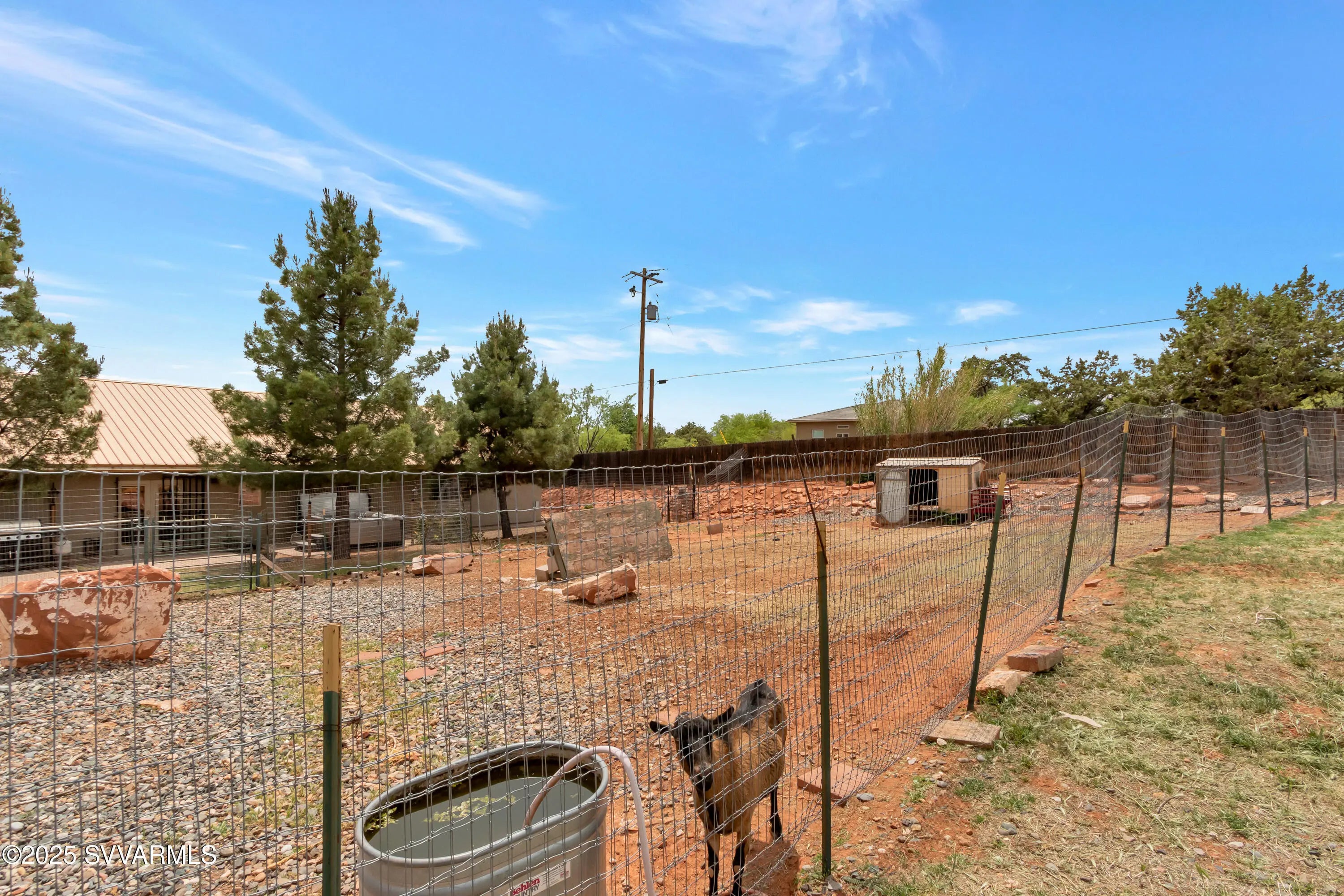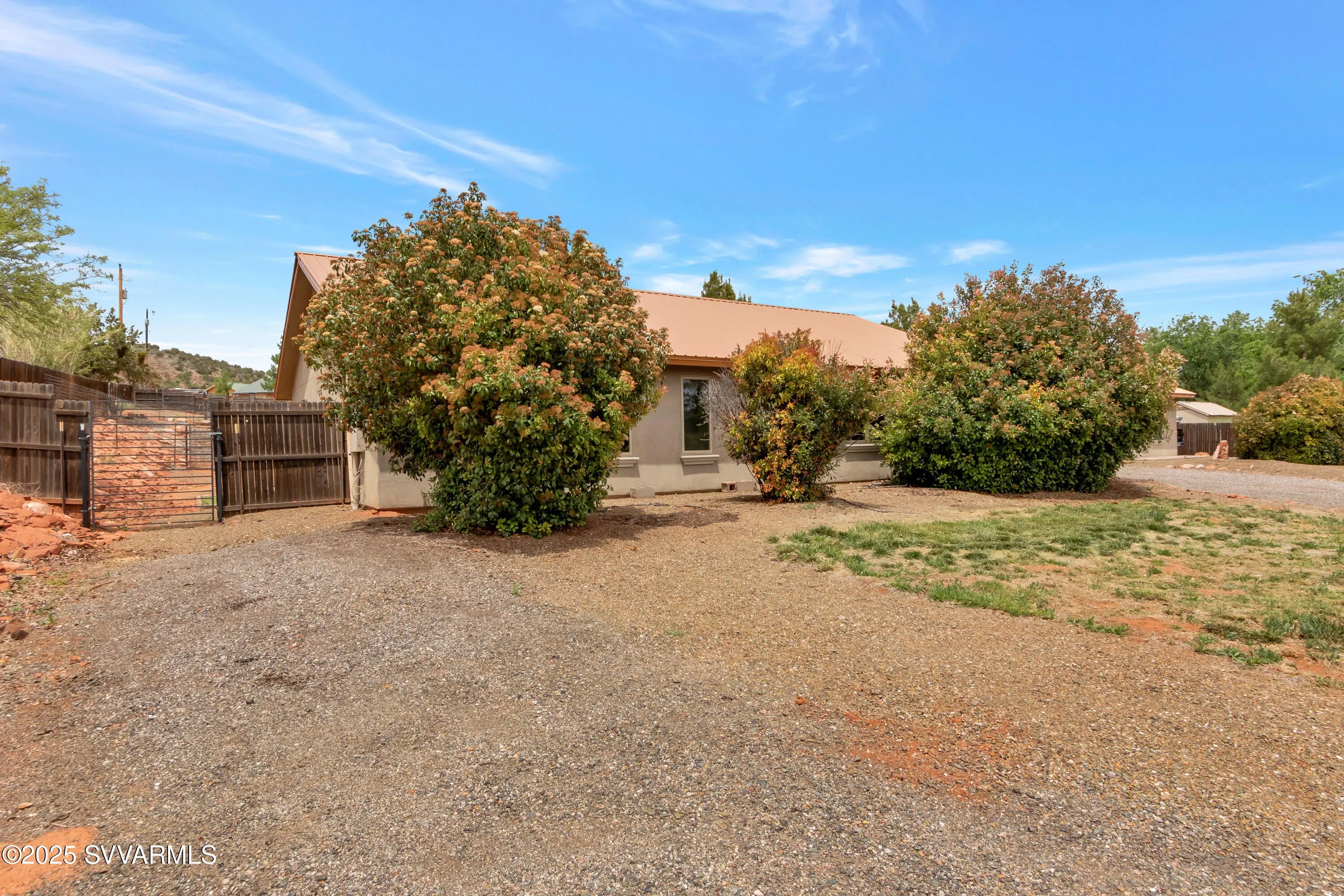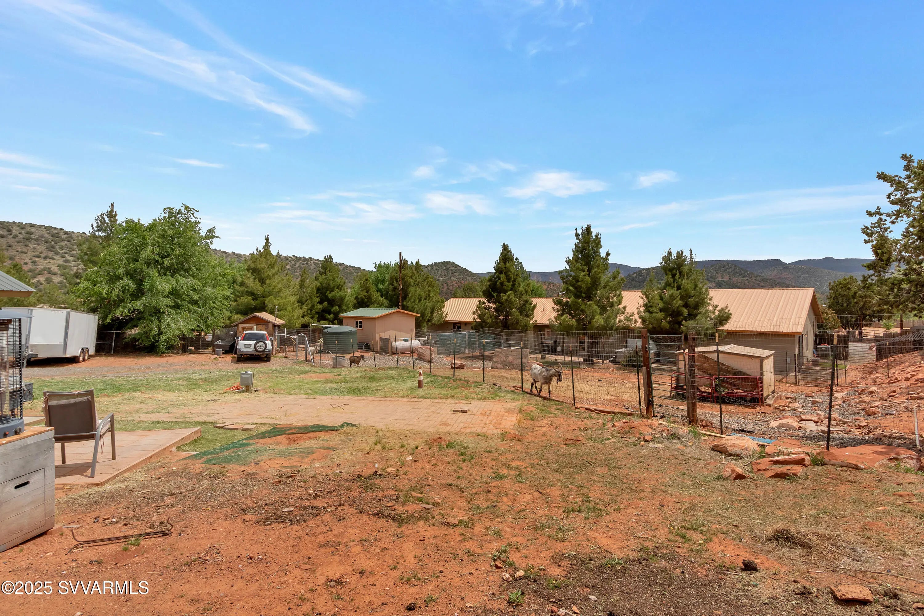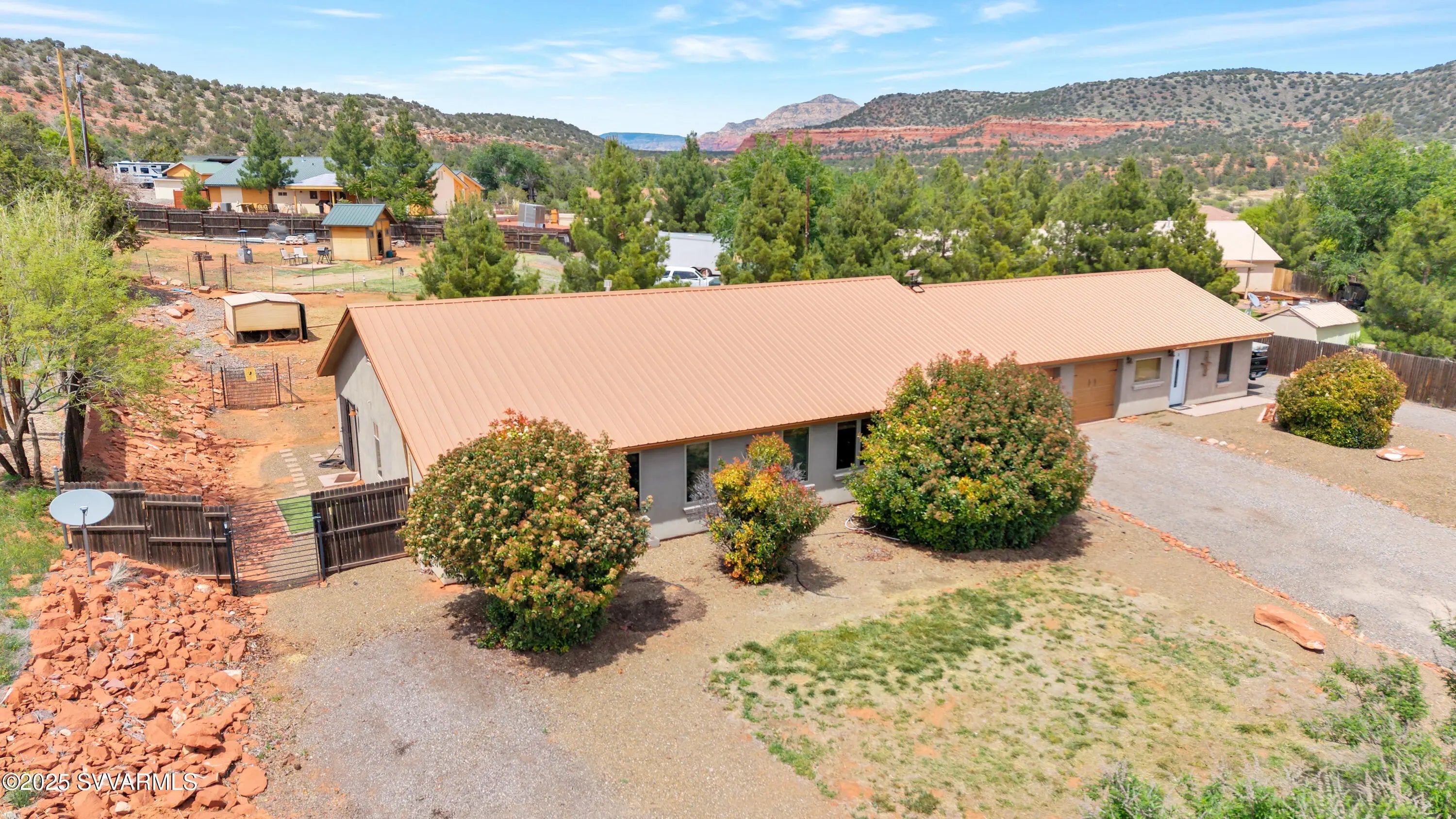 This 2590 sqft, 3-bedroom, 2-bathroom, ranch-style home, with attached 2bed/1bath guest house, offers sweeping panoramic mountain views on a generous 0.8-acre lot, and combines a spacious interior with thoughtful design. The well-appointed kitchen features a gas range, with additional built in double oven, and ample cabinet and counter space. Coupled with the open concept great room it is ideal for entertaining. Step outside to enjoy a concrete patio with a hot tub, surrounded by wonderful views and a fully fenced backyard. For those with an equestrian lifestyle, the property is horse-friendly, allowing up to two horses. It also includes a paved RV parking spot with an electric hookup. Additional highlights of the home include a durable metal roof, an oversized three-car garage and a shared well for water. The property is situated along the scenic Red Rock Loop Road, offering the perfect balance of seclusion and convenience, with easy access to hiking trails, Oak Creek, and the best of Sedona. Adjacent to the garage is an attached guest suite, providing a private and flexible space for visitors, multigenerational living, or rental potential. Door framing in the wall between garage and guest suite was installed during construction to facilitate easy interior access if desired.