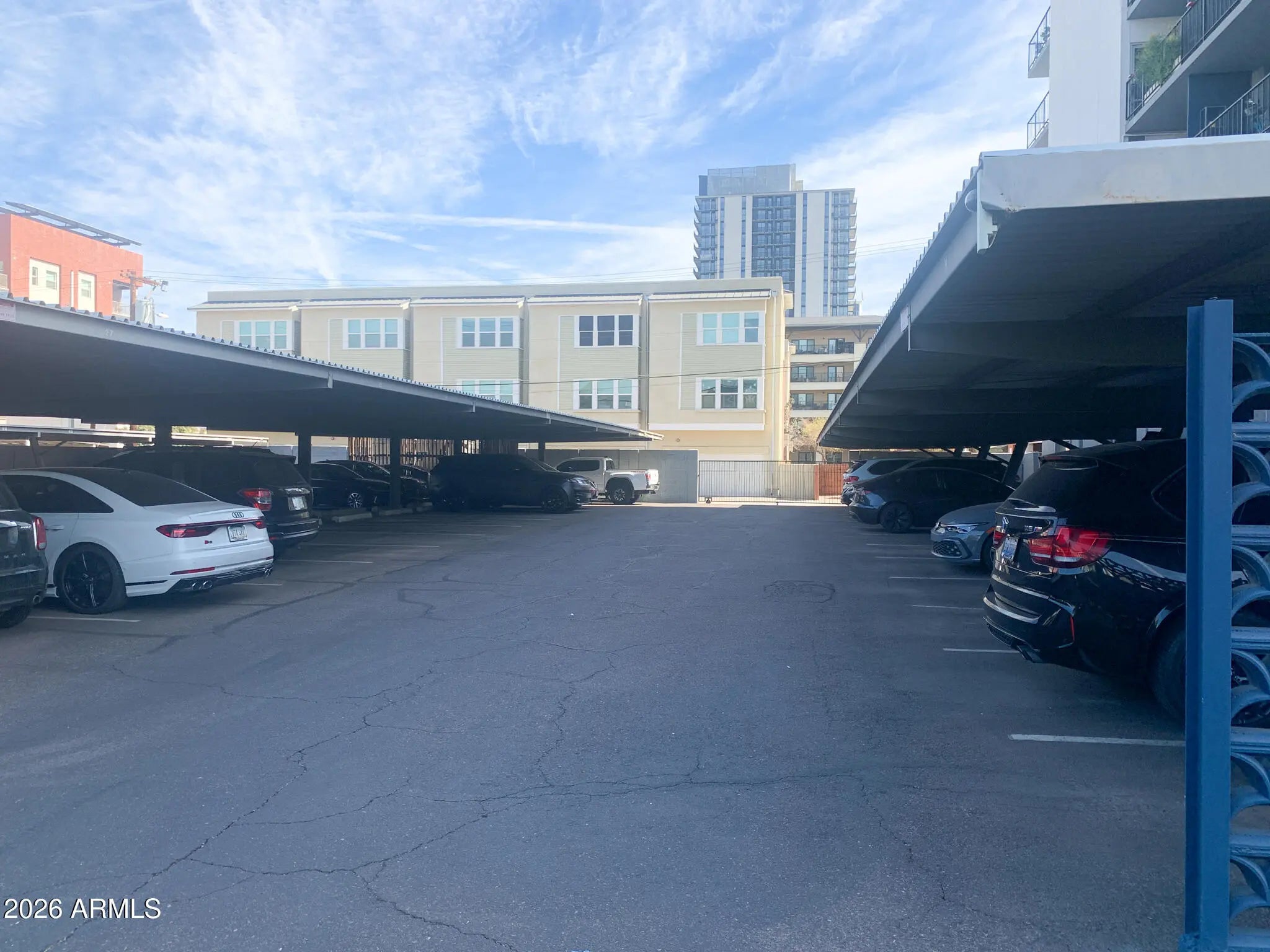 Southwest corner unit with a private balcony overlooking downtown Phoenix. Both the great room and bedroom offer direct balcony access. The great room features track lighting and custom built-in bookshelves. The kitchen includes a pantry, recessed lighting, subway tile backsplash, updated countertops, and stainless steel appliances including microwave, dishwasher, oven/range, and refrigerator. Additional features include tile flooring throughout, updated window coverings, and a bathroom with recessed lighting. The building includes parking, card-only elevator access, and remodeled common areas. Residents have access to a fitness center, a shared meeting and entertainment room with a kitchen area and restrooms, and a third-level pool and sun deck overlooking downtown.