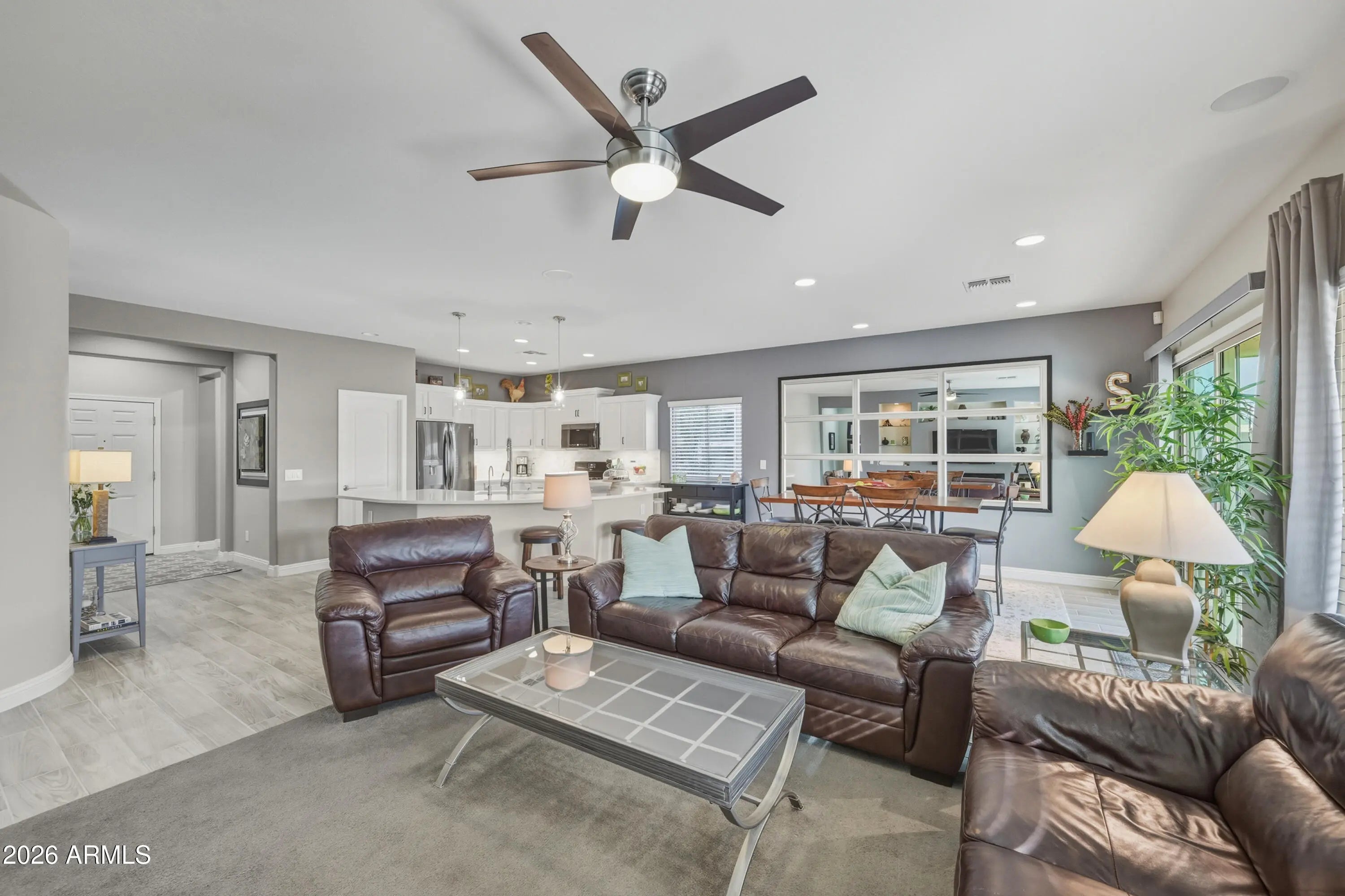 This 2012 Senita model by Pulte in Parkside Anthem at Merrill Ranch offers 3 bedrooms, 2 baths, and a split floor plan with den and built-in Murphy bed. The upgraded kitchen features professionally painted cabinets with new hardware, quartz countertops, stainless steel appliances, newer refrigerator and microwave, gas stove, R/O system, and new gas hot water heater. Open living area includes 9+ flat ceilings, 6 inch baseboards, surround sound, and upgraded electric fireplace in the entertainment center. Primary suite has walk-in closet/dressing room, soaking tub, shower, and double sinks. South facing backyard with covered patio, pavers, gas firepit, built-in outdoor kitchen, spa, and desert landscaping on 6,098 sqft lot bordering preserved land. Live in a resort in Anthem at Merrill Ranch and enjoy the waterpark, lap pool with diving well, workout facility, tennis, golf, pickleball, soccer fields, sand volleyball, softball fields, walking trails, dog park, catch and release fishing, playgrounds, the Anthem Grille Restaurant and much more! HOA fees include common area maintenance, amenities and resident golf rates.