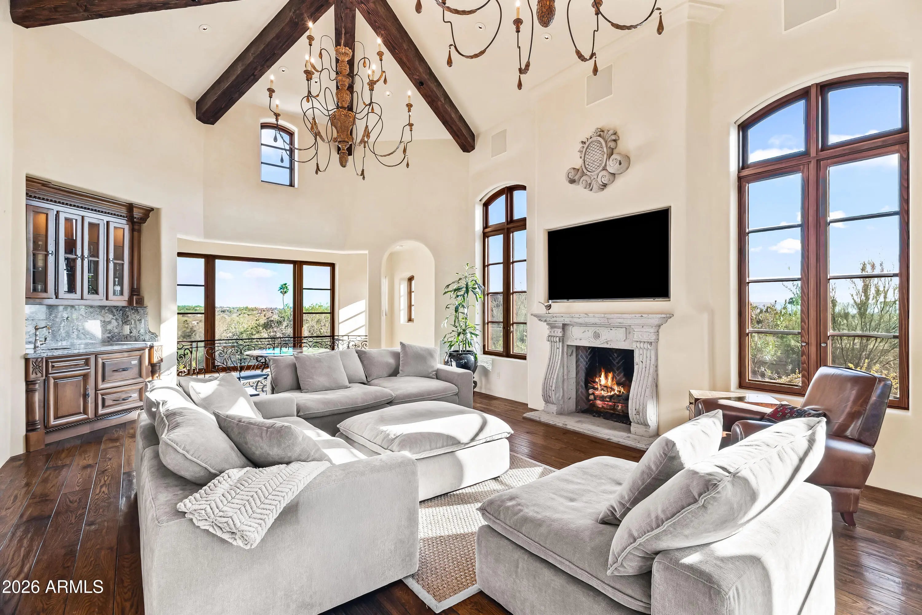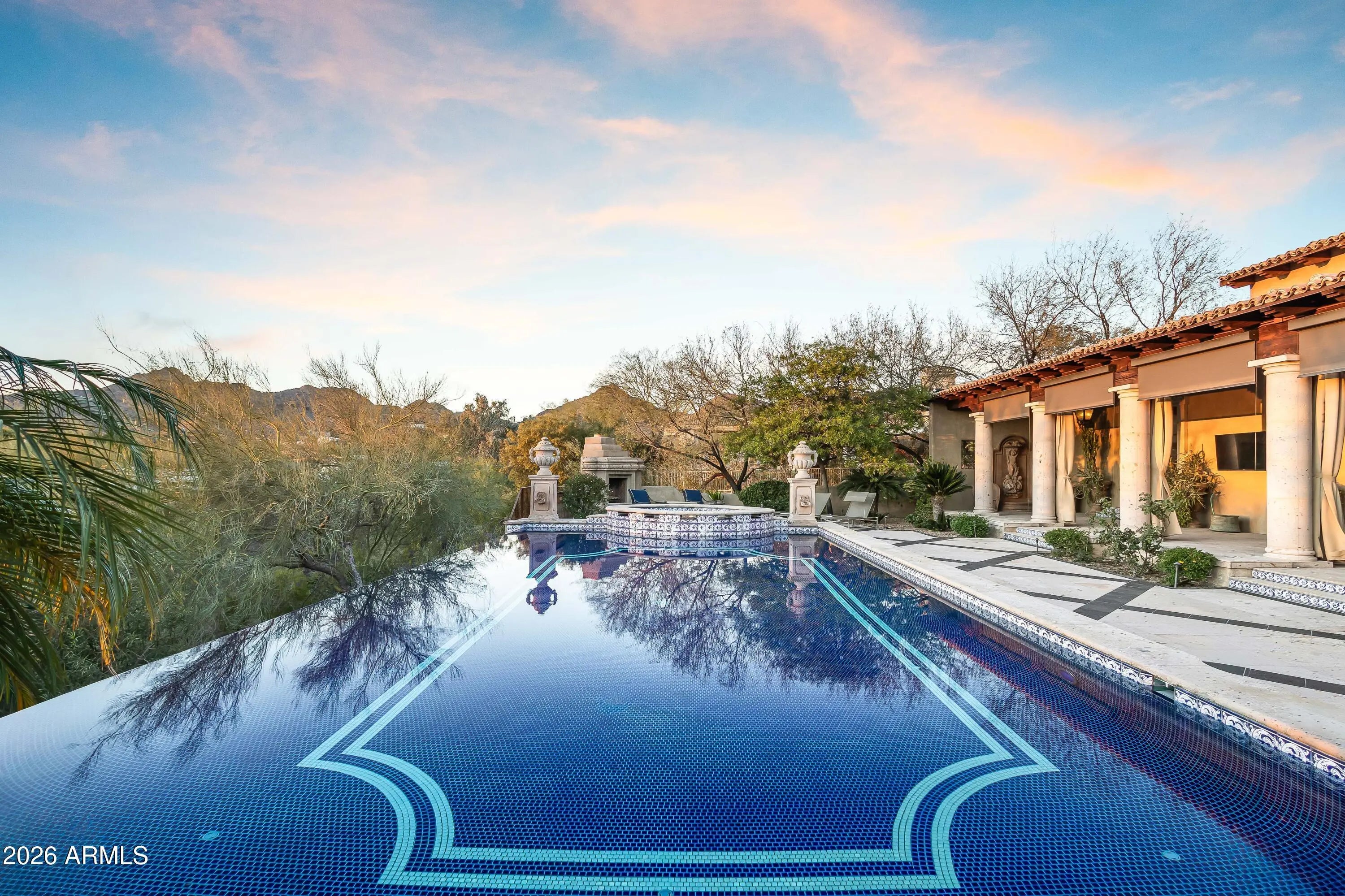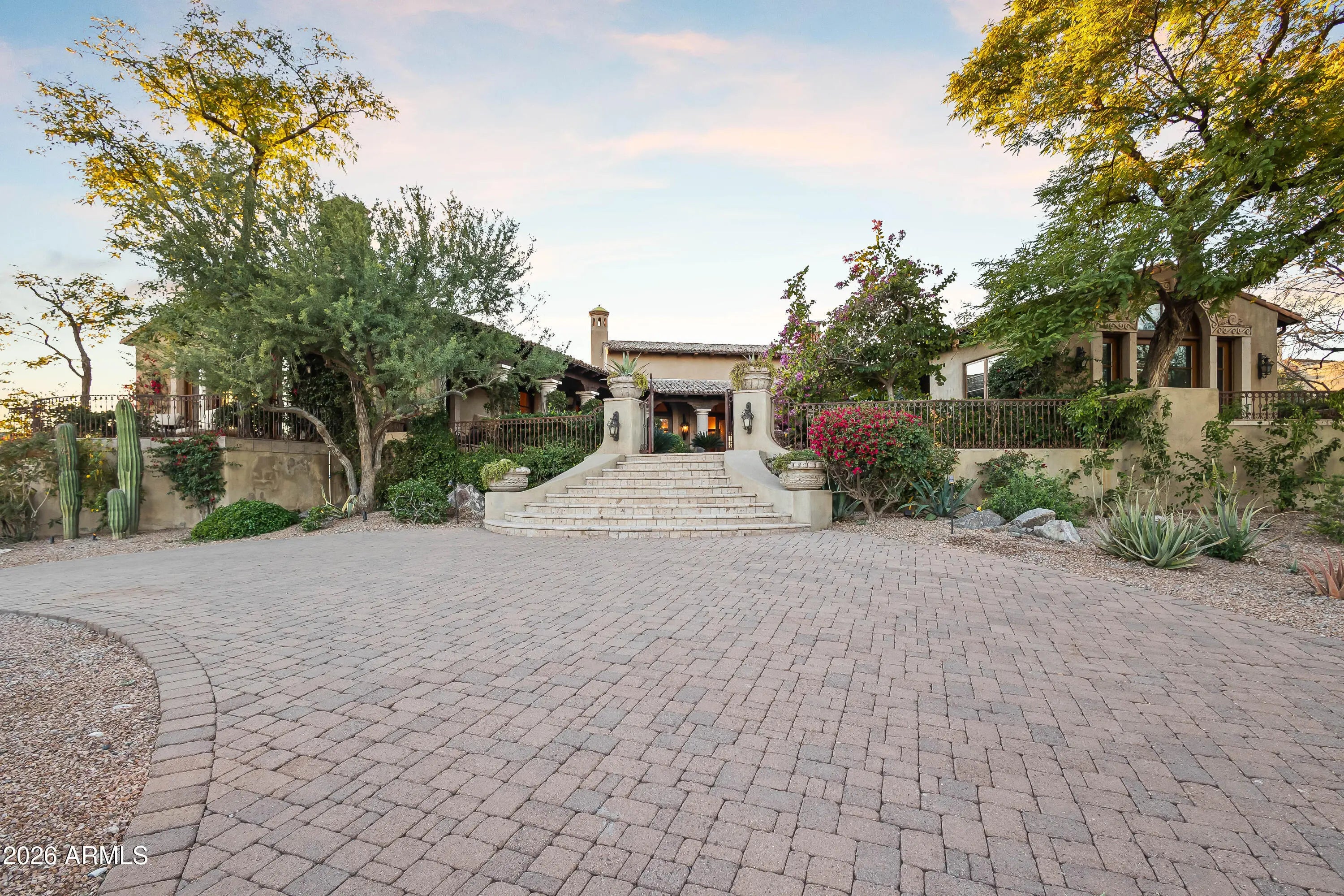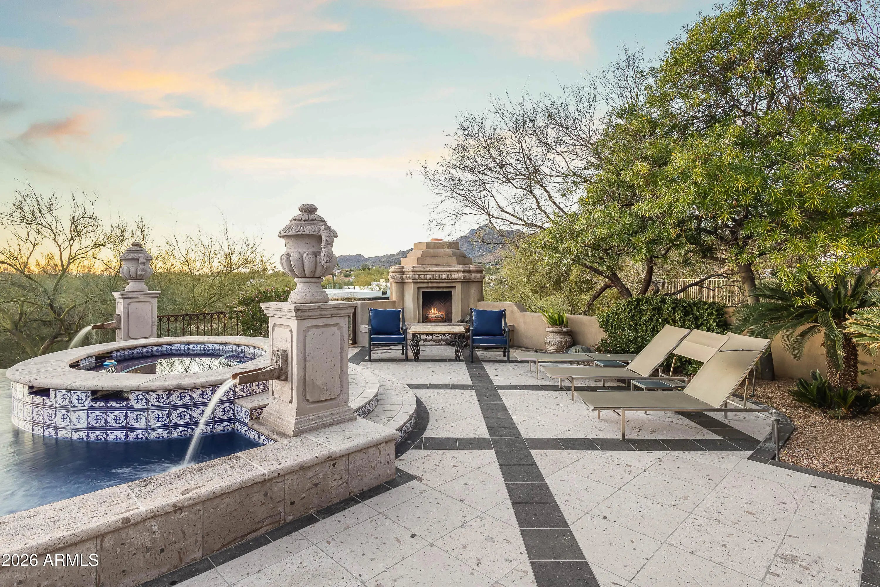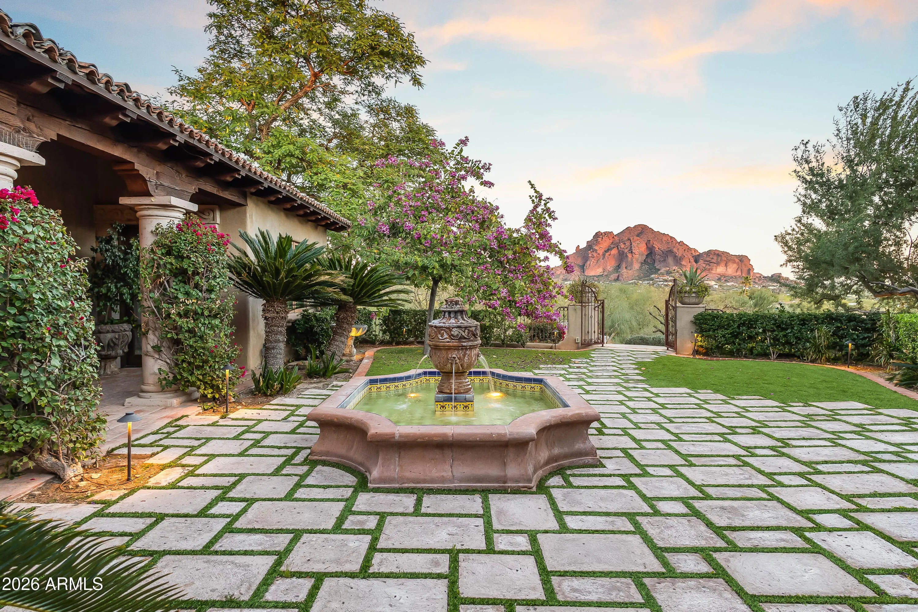 Gated Paradise Valley estate crafted by Nance Construction, offering exceptional architectural integrity, elevated finishes, and sweeping 350-degree mountain views. Privately positioned behind gates and framed by mature desert landscaping, this remarkable residence makes an immediate impression with dramatic arched entryways, soaring ceilings, exposed wood beams, paneled brick ceiling details, and hand-finished plaster walls. French doors and expansive windows flood the home with natural light, while timeless chandeliers, designer sconces, and multiple concrete gas fireplaces create warmth and sophistication throughout. The open-concept floor plan seamlessly connects the formal living room with wet bar, formal dining, and chef's kitchen—designed for effortless entertaining. The kitchen features high-end appliances, an oversized island, and its own fireplace, blending function with ambiance. Each space offers seamless indoor-outdoor living with direct backyard access and stunning mountain views. The primary suite is a serene retreat, showcasing breathtaking vistas, a private patio, fireplace, and a spa-inspired bath complete with dual vanities, a soaking tub, separate shower, enclosed water closet, and custom walk-in closet. The resort-style backyard embodies elevated Arizona living with covered patios, multiple outdoor fireplaces and fountains, and a ramada with built-in BBQ ideal for entertaining. The custom pool and spa feature ornate cement water elements and an expanded deck, all set against panoramic mountain backdrops. Additional highlights include three guest ensuite bedrooms, a nearly 1,300 sq ft finished basement with wine storage, and a three-car garage. A rare opportunity to own a timeless Paradise Valley estate where craftsmanship, privacy, and breathtaking scenery define the lifestyle.