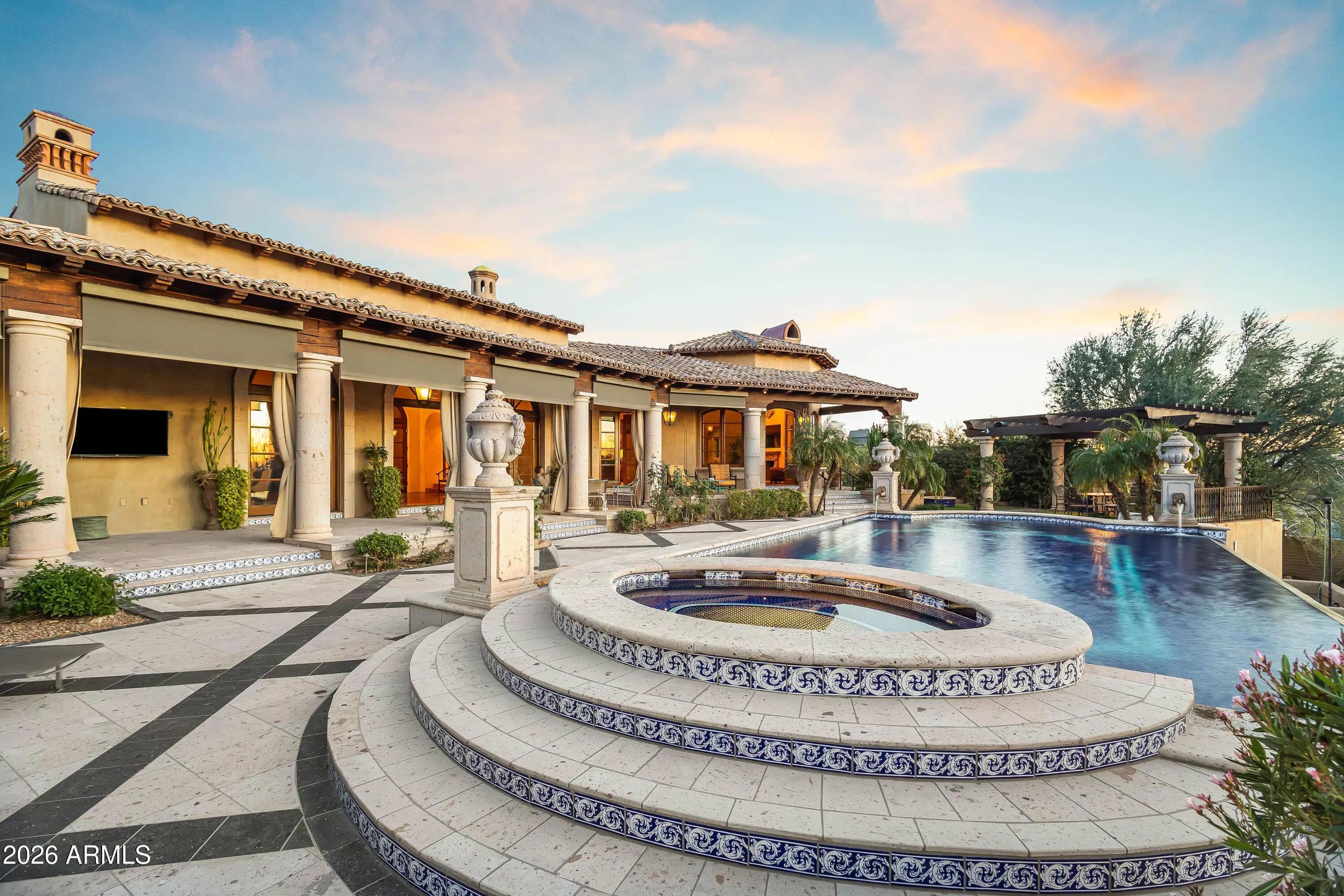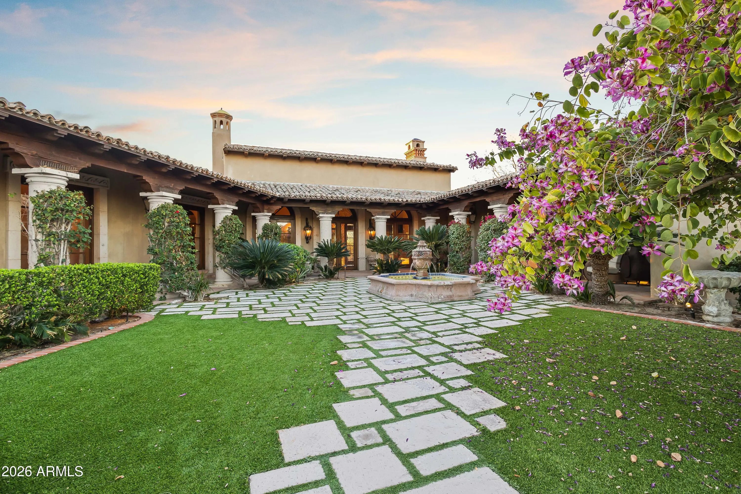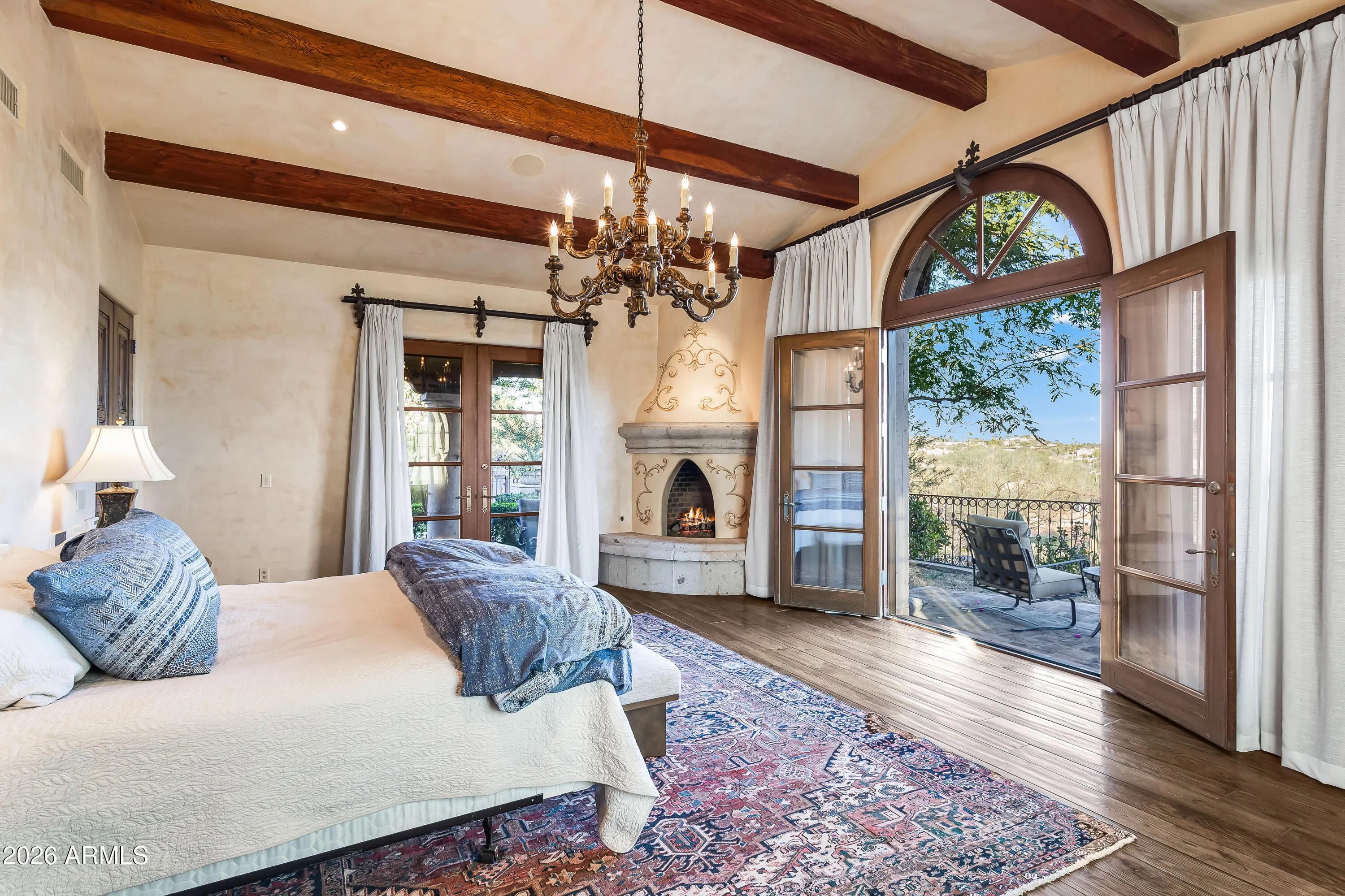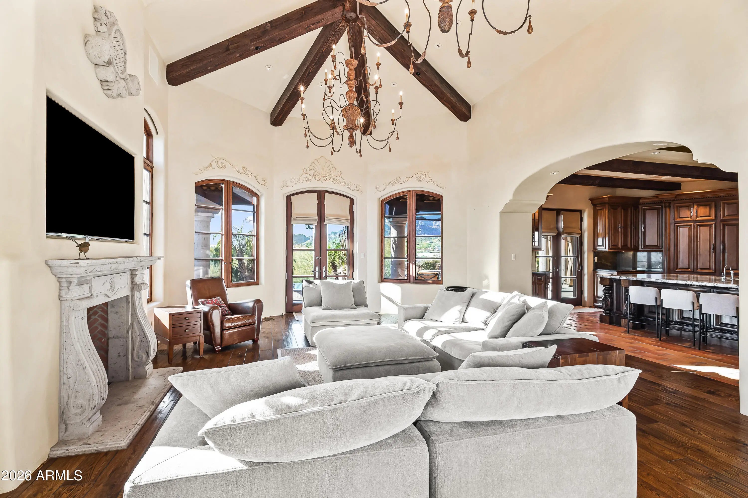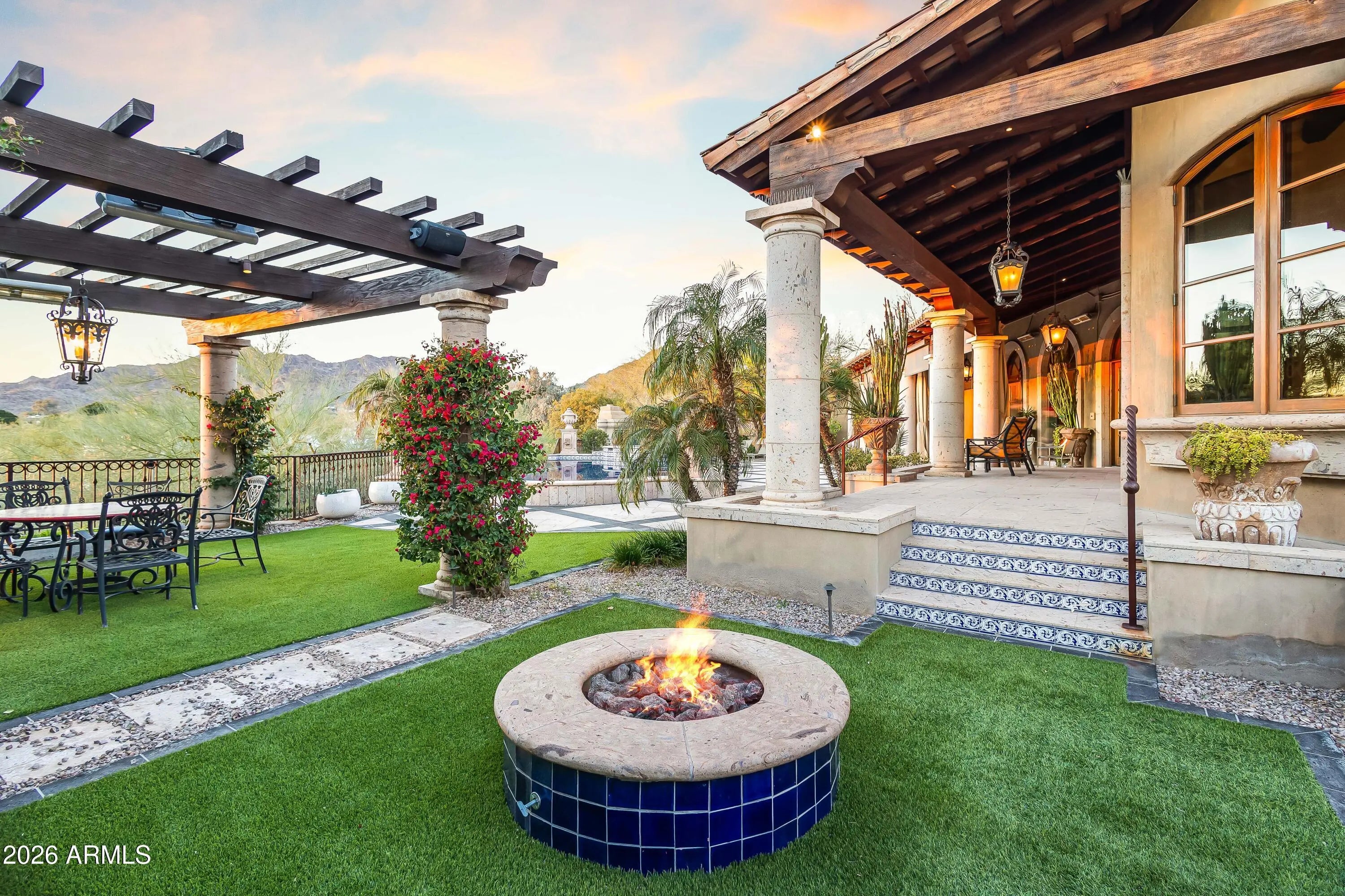 Gated Paradise Valley estate crafted by Nance Construction, offering exceptional architectural integrity, elevated finishes, and sweeping 350-degree mountain views. Privately positioned behind gates and framed by mature desert landscaping, this remarkable residence makes an immediate impression with dramatic arched entryways, soaring ceilings, exposed wood beams, paneled brick ceiling details, and hand-finished plaster walls. French doors and expansive windows flood the home with natural light, while timeless chandeliers, designer sconces, and multiple concrete gas fireplaces create warmth and sophistication throughout. The open-concept floor plan seamlessly connects the formal living room with wet bar, formal dining, and chef's kitchen—designed for effortless entertaining. The kitchen features high-end appliances, an oversized island, and its own fireplace, blending function with ambiance. Each space offers seamless indoor-outdoor living with direct backyard access and stunning mountain views. The primary suite is a serene retreat, showcasing breathtaking vistas, a private patio, fireplace, and a spa-inspired bath complete with dual vanities, a soaking tub, separate shower, enclosed water closet, and custom walk-in closet. The resort-style backyard embodies elevated Arizona living with covered patios, multiple outdoor fireplaces and fountains, and a ramada with built-in BBQ ideal for entertaining. The custom pool and spa feature ornate cement water elements and an expanded deck, all set against panoramic mountain backdrops. Additional highlights include three guest ensuite bedrooms, a nearly 1,300 sq ft finished basement with wine storage, and a three-car garage. A rare opportunity to own a timeless Paradise Valley estate where craftsmanship, privacy, and breathtaking scenery define the lifestyle.