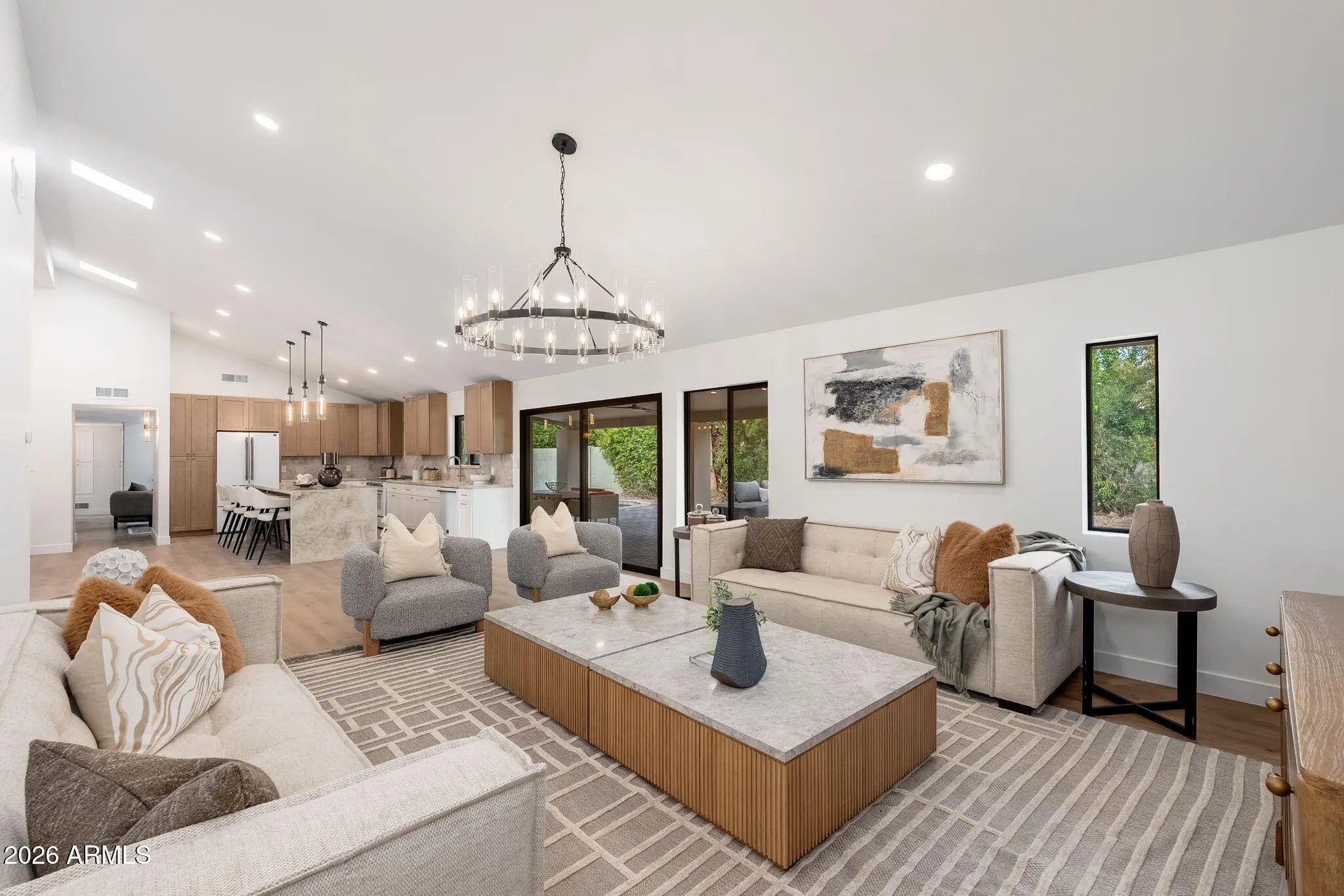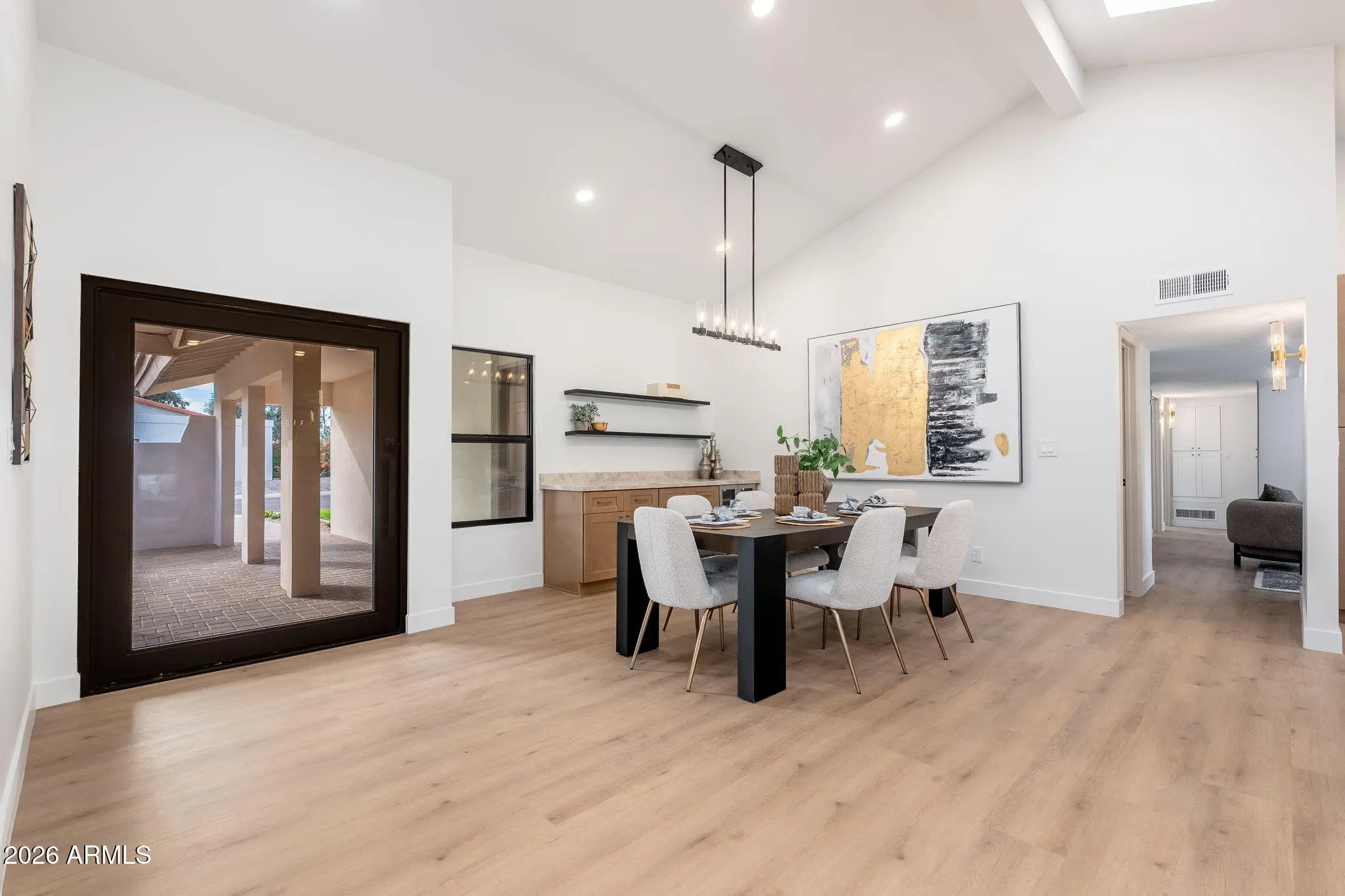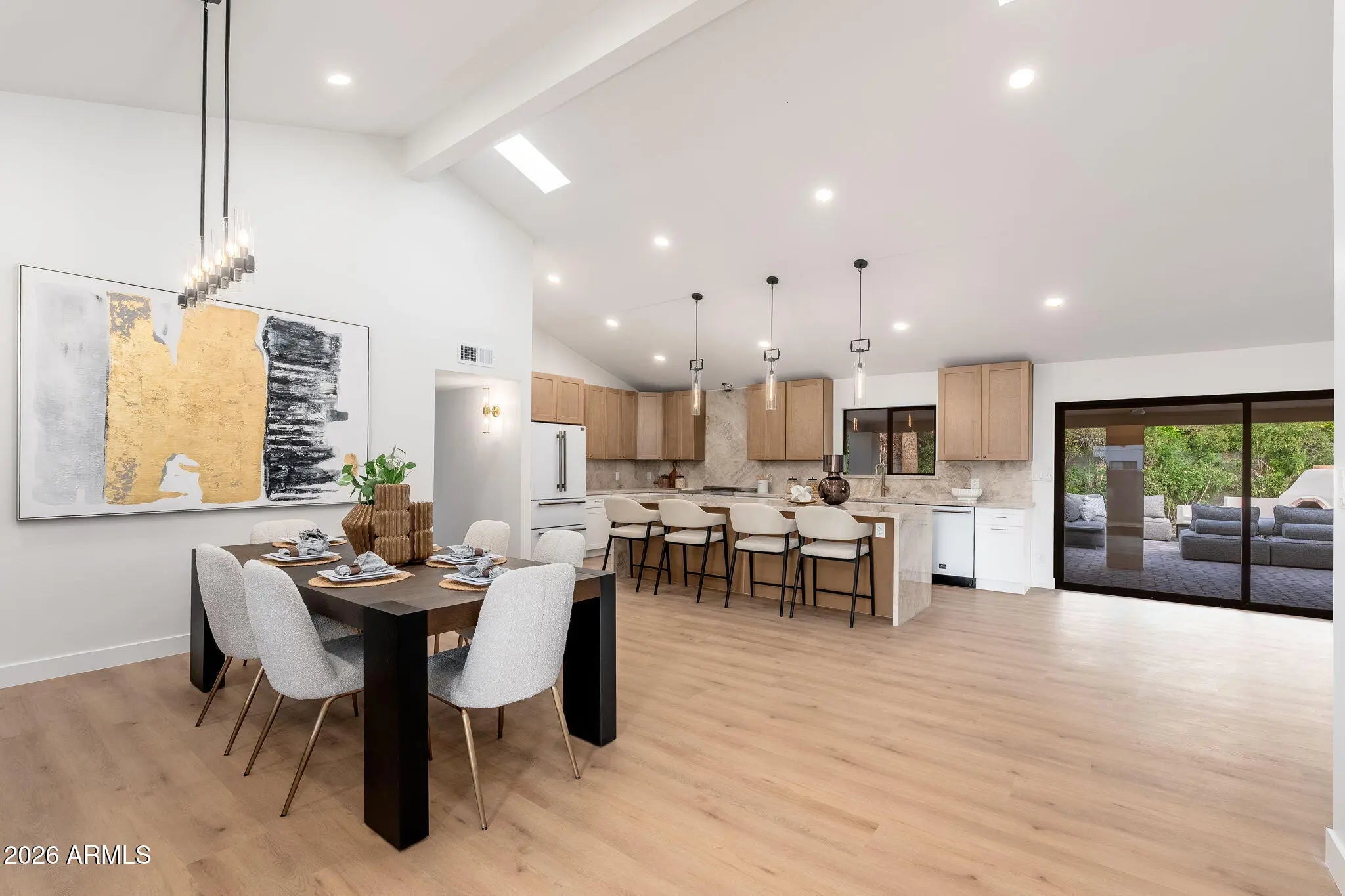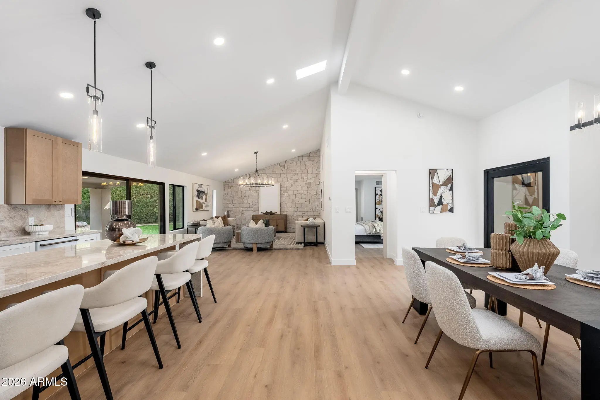 Beautifully remodeled single-story home in the highly sought-after McCormick Ranch community, featuring high-end finishes, contemporary design, and a sparkling swimming pool. The completely upgraded kitchen showcases Forno appliances, two-tone shaker cabinetry, quartz countertops, and a large breakfast bar. Vaulted ceilings, a skylight, recessed lighting, and vinyl wood flooring create a bright, open flow throughout the home. The bathrooms are thoughtfully updated with premium shower systems, custom vanities, framed mirrors, and designer tile niches. Step outside to an expansive covered paver patio with a built-in adobe fireplace and dedicated seating area overlooking the sparkling pool—perfect for enjoying Arizona days and evenings year-round.