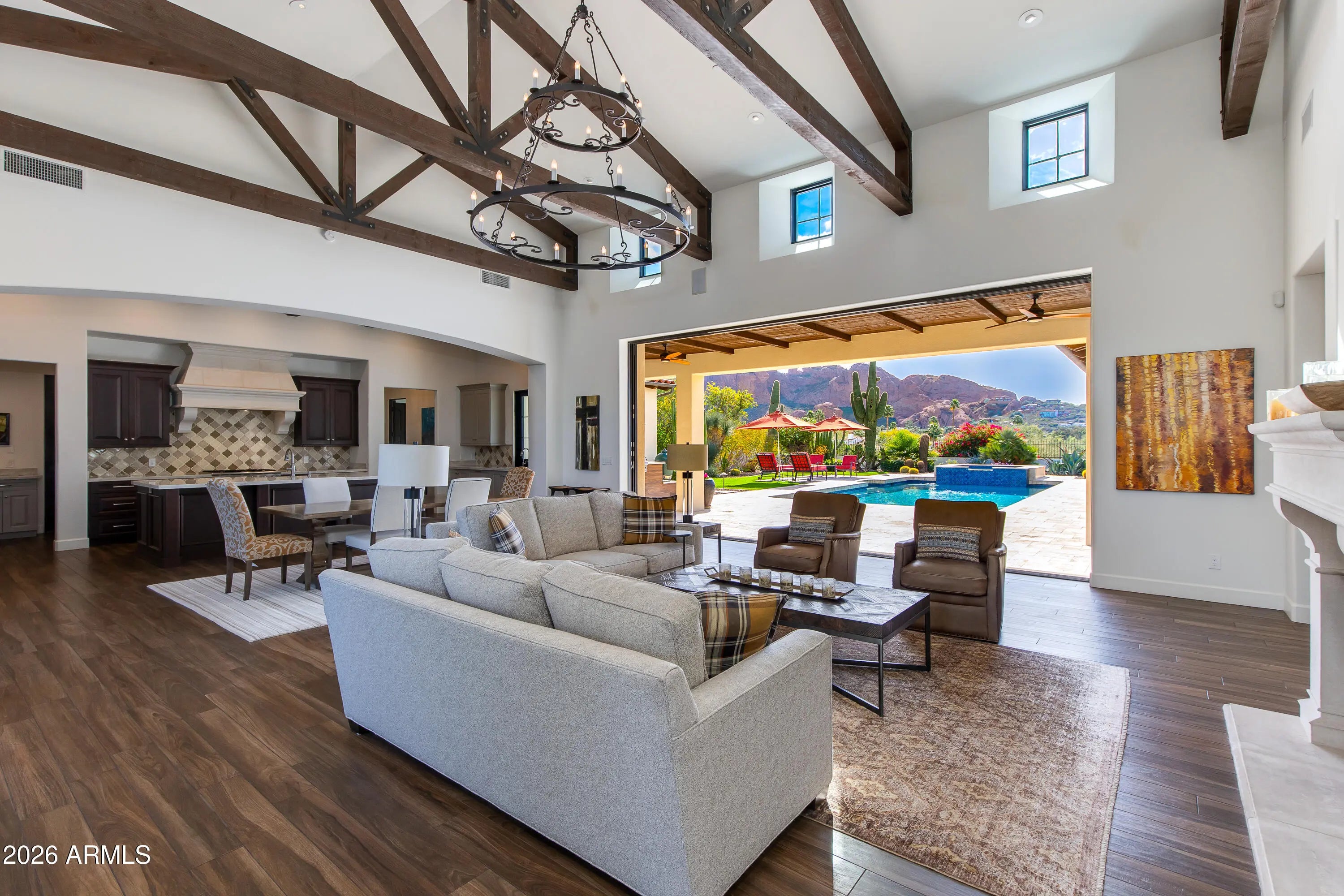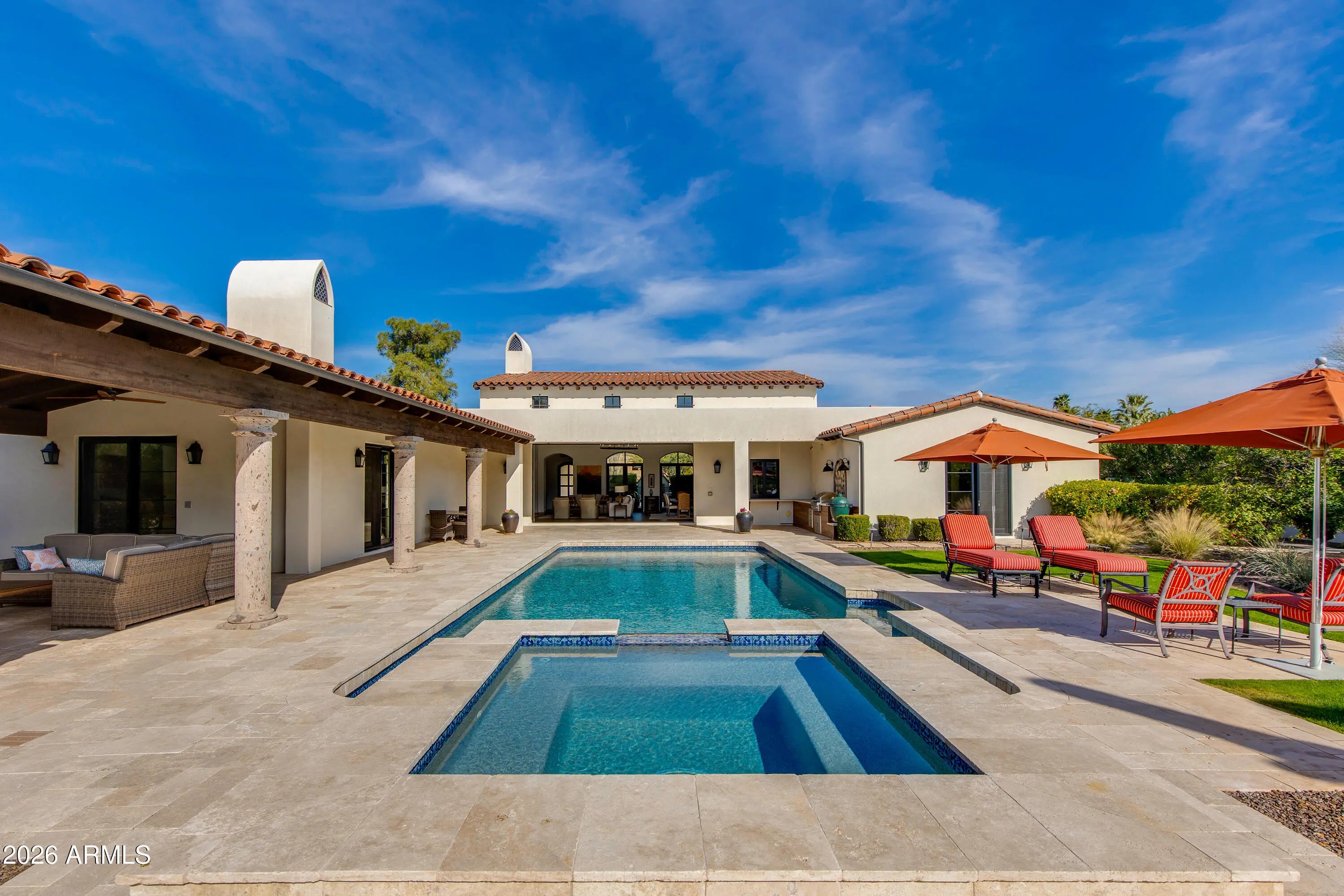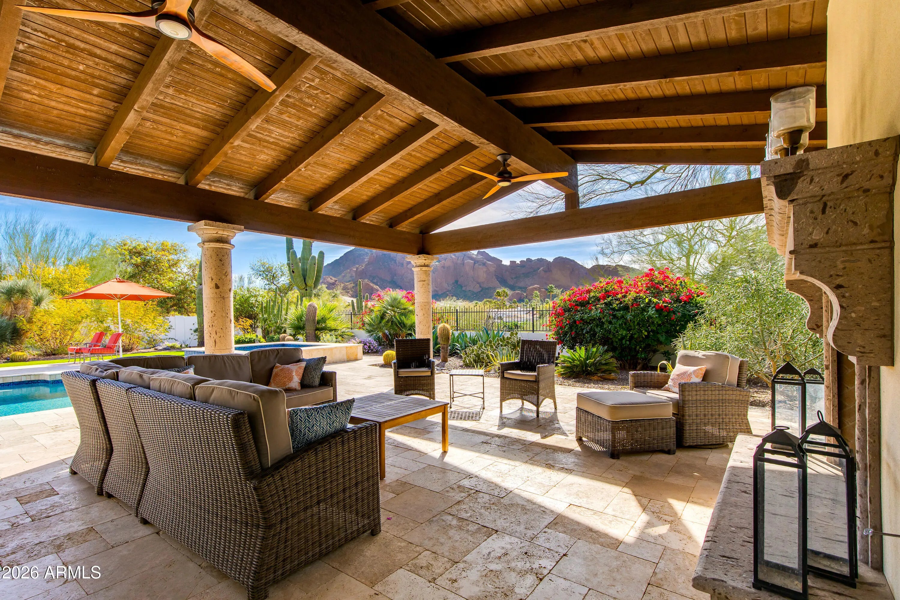 Welcome to this exceptional Spanish inspired home with iconic views and low maintenance lifestyle. This home was taken down to the original slab and thoughtfully rebuilt from the ground up. Every major system and finish has been transformed, delivering modern living without compromise. From the framing and roof to the electrical, plumbing, HVAC, insulation, windows, and drywall -- everything has been redone with quality craftsmanship and attention to detail. Upon arrival you will be ushered from the circular drive into the home where dramatic views of Camelback Mountain and a resort backyard await. Soaring wood beamed ceilings and an iron chandelier sit above an open concept kitchen filled with rich cabinetry and large entertaining island. Walls of glass fully disappear for seamless indoor/outdoor flow. Outdoors, enjoy wide covered patios, manicured desert landscaping, and a heated pool with elevated spa, all set against stunning mountain views. Multiple lounging and dining spaces offer year-round enjoyment of Arizona's sunsets. The thoughtful single-level layout features three ensuite bedrooms with patio access. The primary suite is a true retreat with a fireplace, a spacious walk-in shower, and a soaking tub. This Paradise Valley jewel box offers the elevated lifestyle everyone dreams of, but without all of the hassle.