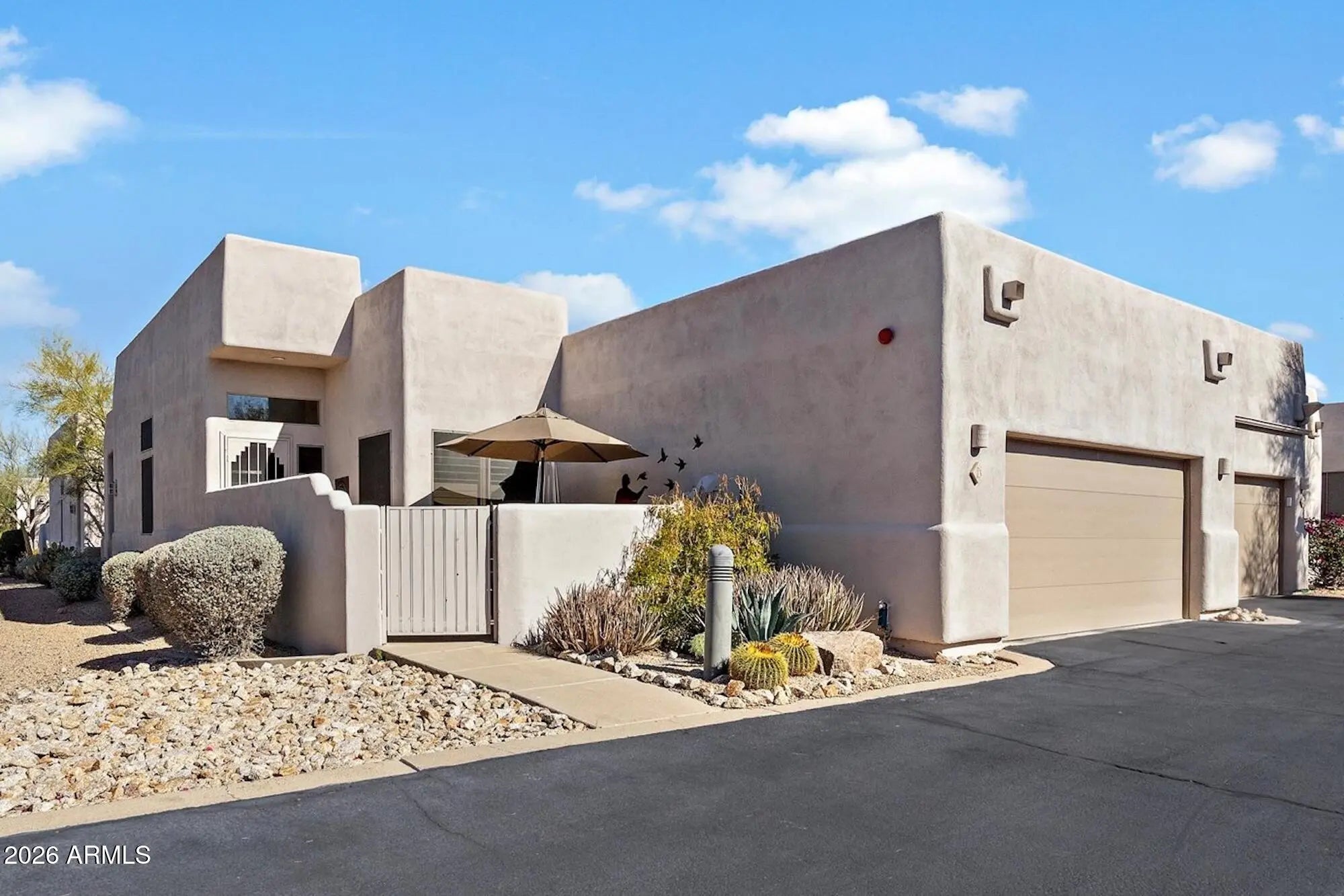 Welcome home to Arroyo Montana - a well maintained subdivision within close proximity to the heart of downtown Carefree. This turnkey single-level end unit is being offered furnished. Access the entrance through a southwest facing private courtyard patio. The interior features two large bedrooms, tall ceilings with fans, plantation shutters and sunscreens, an open floor plan, a kitchen with breakfast bar and separate dining area, two beautifully remodeled bathrooms, and a two-car garage. Enjoy the north-facing covered patio off the living room which even features a mountain view. The community is gated and also offers a heated pool and spa. The unit exterior was repainted in 2025, and the roof was re-coated that same year as well. A perfect place for all year or seasonal living.