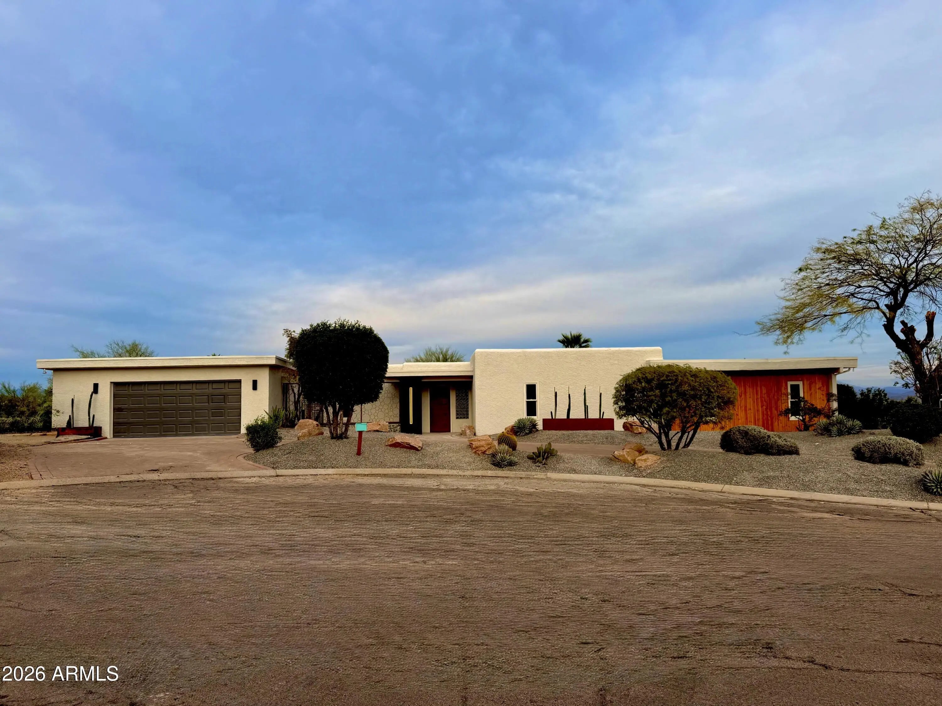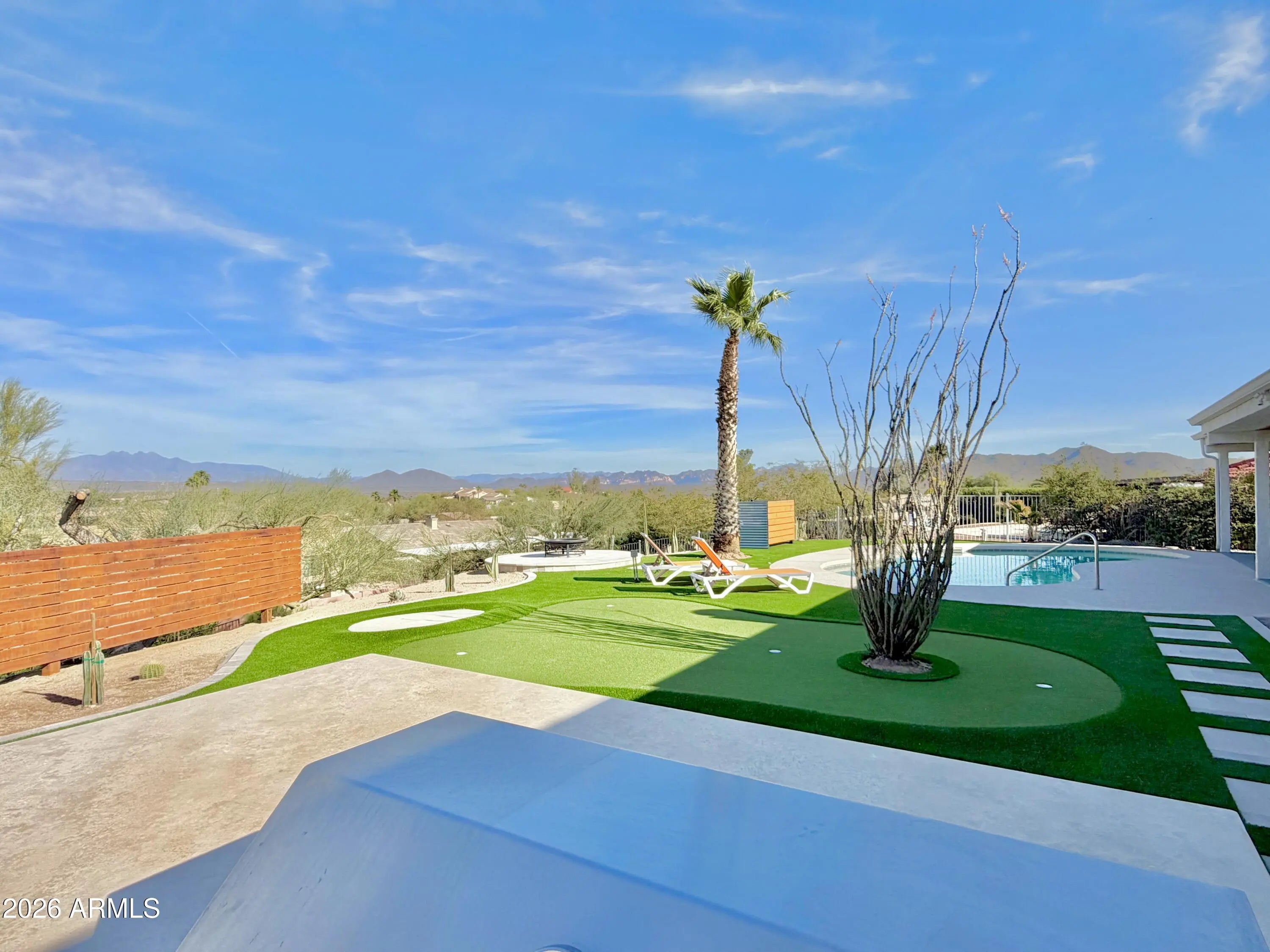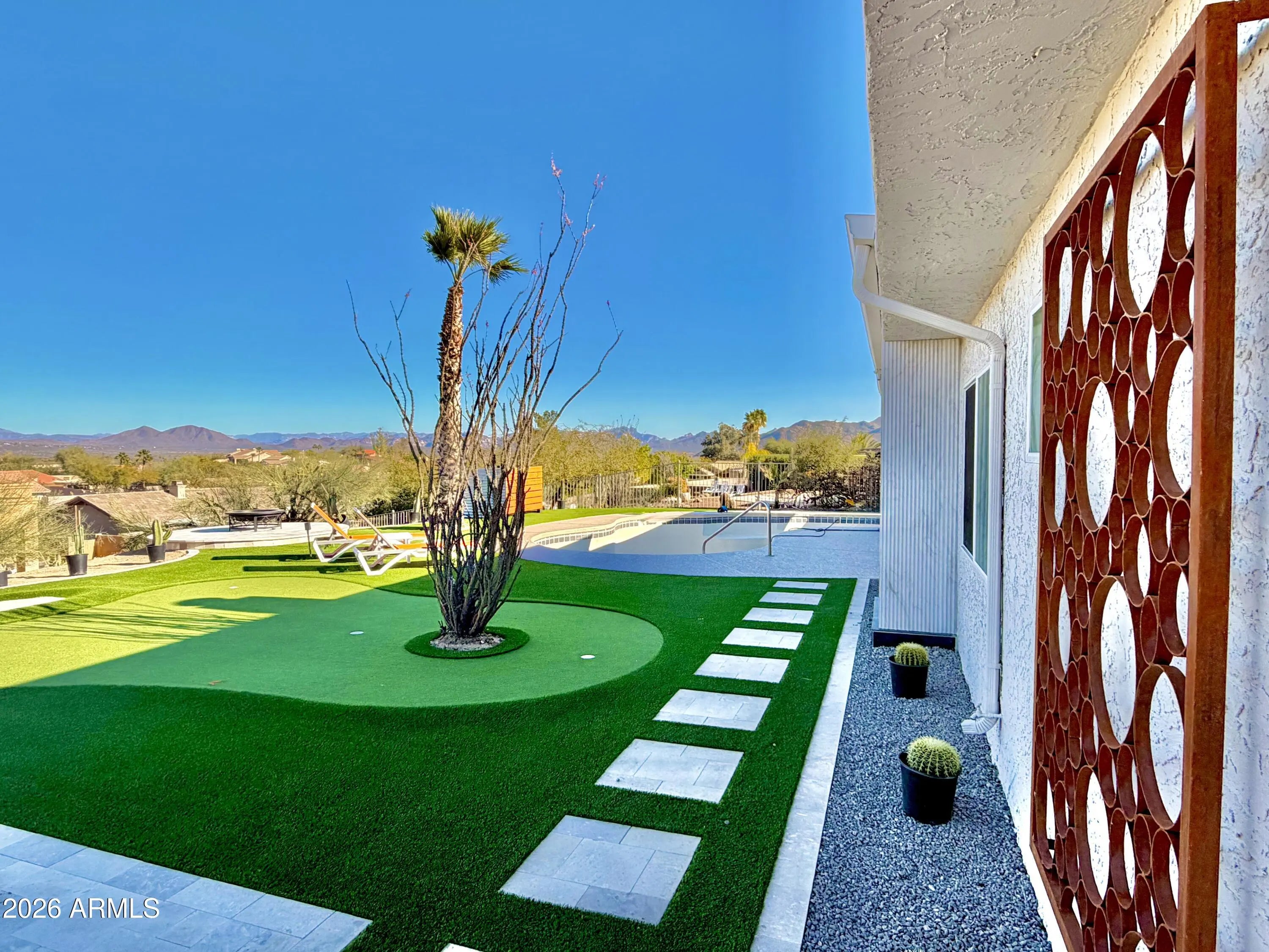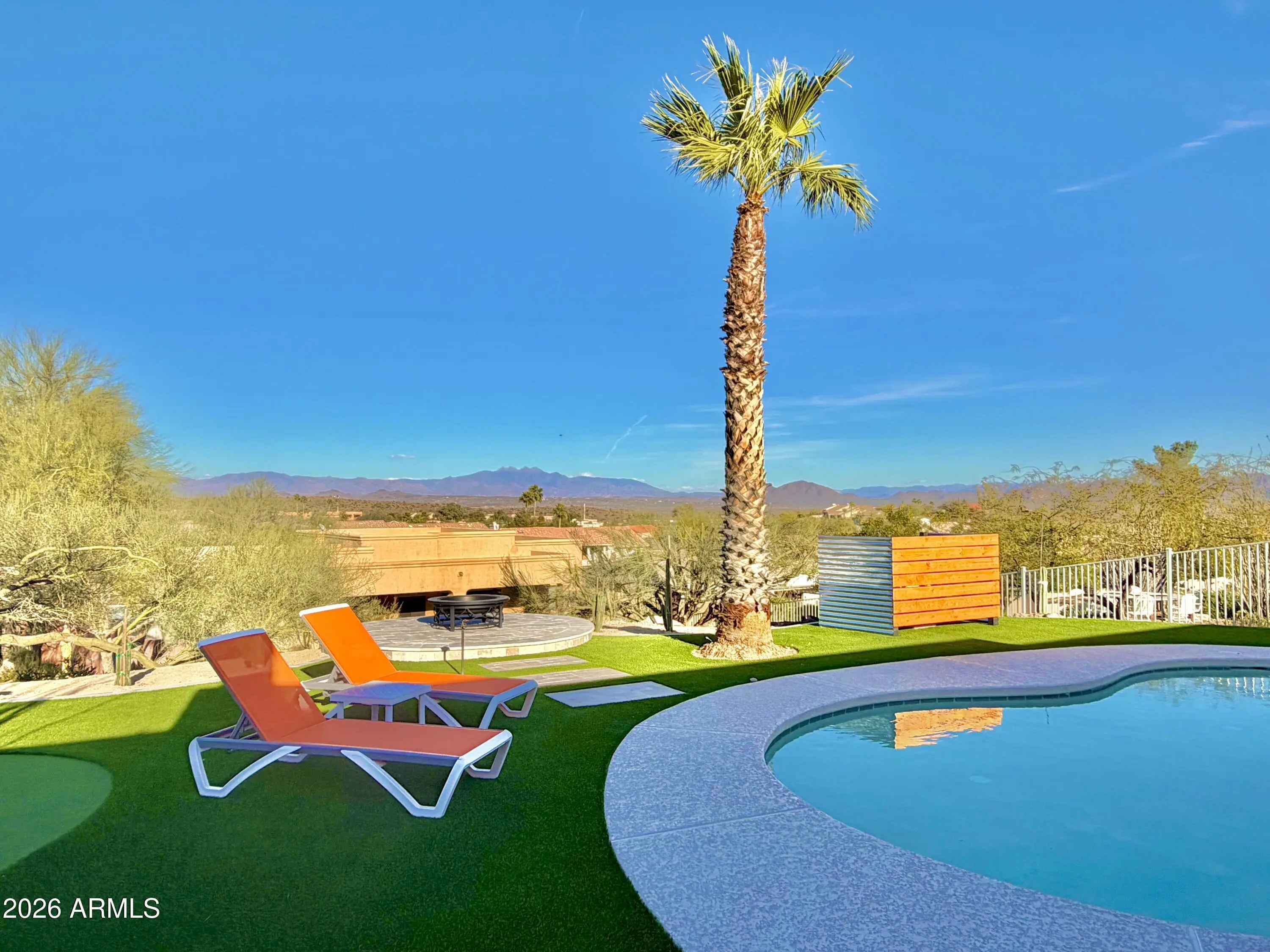 Experience living desert art in this re imagined single level, hilltop residence. An architectural statement piece perfectly positioned to capture the most coveted views in Fountain Hills. From this rare, oversized cul-de-sac lot, you'll enjoy unobstructed panoramas of Four Peaks, Red Mountain (including the highly sought-after split view), the Superstitions glowing pink at sunset, and of course, the world famous Fountain. Prime Location: One of the community's original premier lots, this property offers the ideal blend of privacy and convenience. Its central location allows you to walk to restaurants, shopping, and Fountain Park, all while enjoying complete serenity with no road noise and a fully usable lot. Something exceptionally hard to find in Fountain Hills. A True Single Level With Full Views: Unlike many hillside properties, this home offers zero interior steps, no walkout basement, and no unusable terrain. Every inch of the lot is functional, accessible, and designed to maximize the views without sacrificing comfort or practicality. Fully Updated & Never Lived In: The entire home has been thoughtfully updated and has not yet been occupied, giving you the fresh, modern feel of a brand new residence. Its mid century modern inspiration shines through in every detail, with purposeful design elements such as custom metal art that casts shifting shadow patterns throughout the day, one of a kind accent walls, and a bespoke dressing room. A hidden room adds an unexpected and delightful surprise. Light, Function & Flow: The open concept layout is oriented to welcome natural light from the perfect direction illuminating the mountains like a living canvas without harsh glare. A circular driveway enhances the estate like presence, while the split floor plan includes a dedicated office with its own separate entrance. Detached 530 SF Multi Use Flex Space: Connected by a breezeway, this insulated, heated, and cooled space includes a full bath and views of Four Peaks and the Fountain. Ideal for car enthusiasts, hobbyists, a game room, studio, or a combination of all three. Additional RV parking and private gated parking behind the flex space add even more versatility. Interior Finishes: * LVP flooring throughout * New paint, doors, and baths * Granite, slate, and Italian porcelain finishes * Hand sanded smooth wall texture * Euro style custom kitchen cabinetry * Sho Sugi Ban accents * Custom lighting and fans * Floating vanities & LED mirrors * And countless additional upgrades Exterior Enhancements: * Fresh exterior paint * Travertine walkways and seating areas * Synthetic grass & putting green * Outdoor kitchen * Custom metal planters & metal art rock * Golden pecan wood accents * Thoughtfully curated desert landscaping Energy Efficiency: * Dual pane windows and doors * Solar flex roof * New AC units (installed just before closing) * Primary bath with its own split unit for temperature and humidity control This home is fun, artful, a little bold and completely unforgettable. Yet even with all its personality, it still plays second to its one of one, unobstructed, world class views.