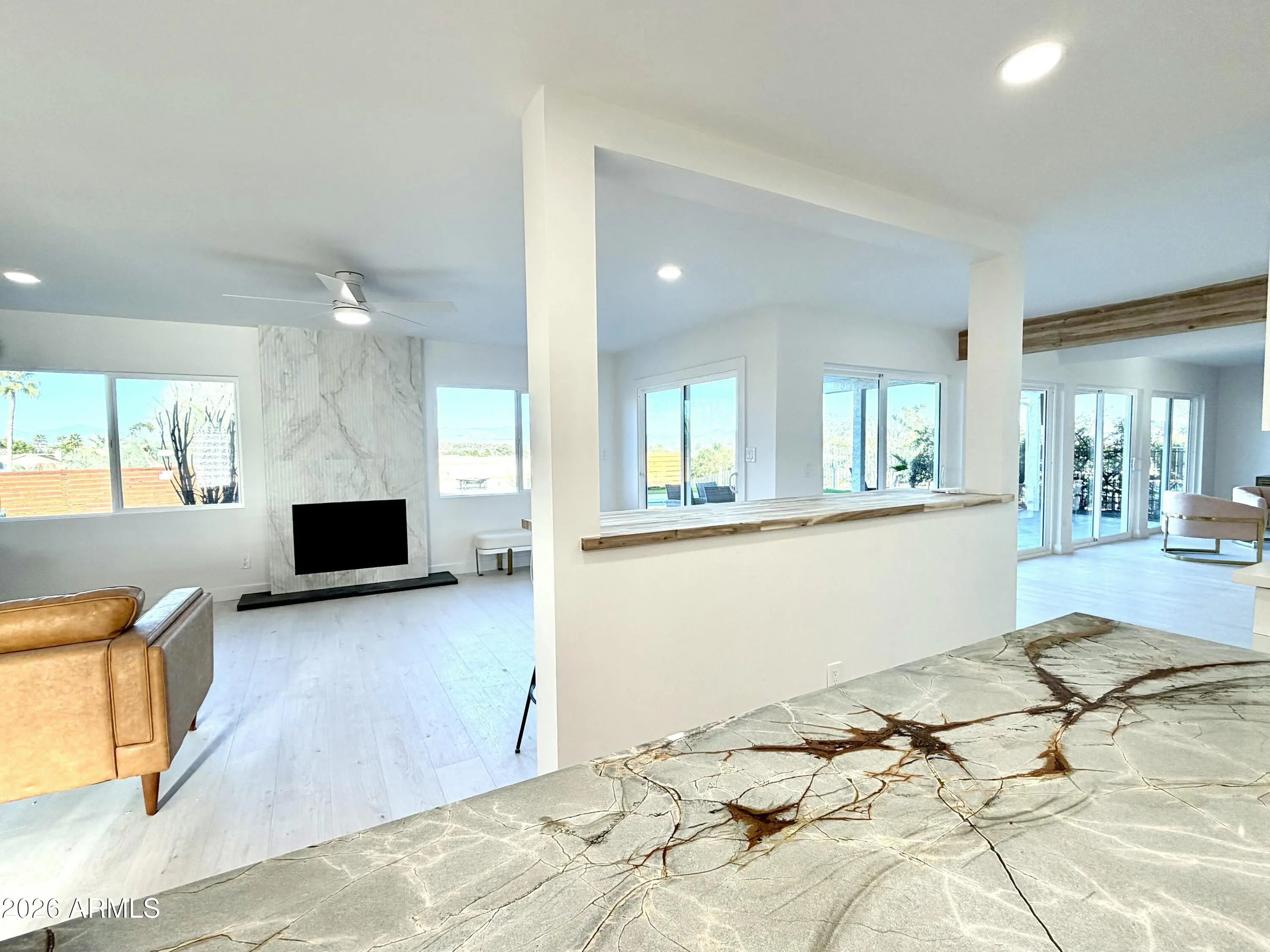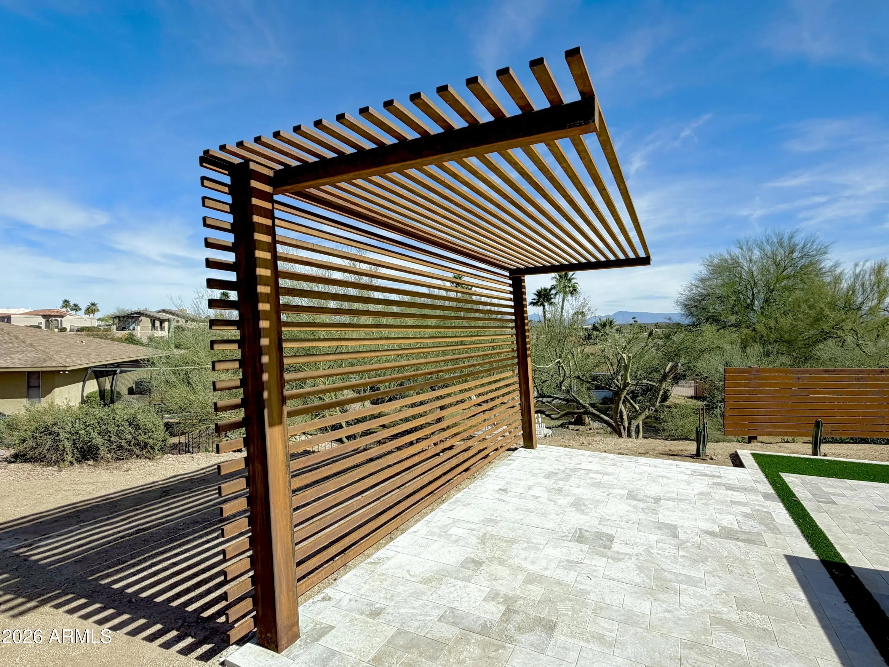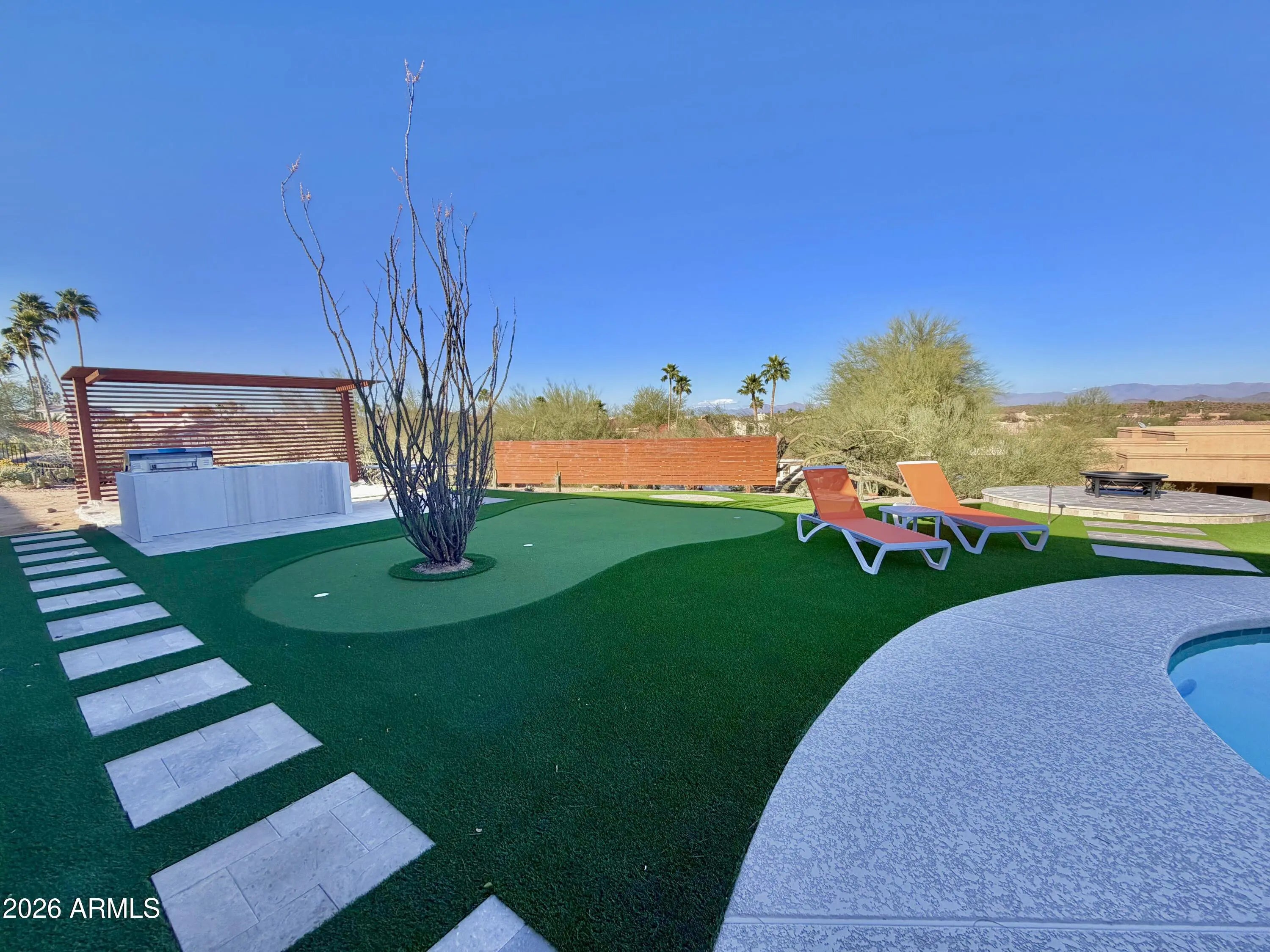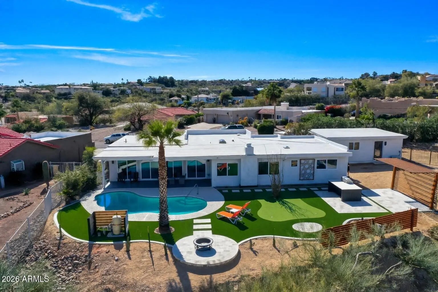 Experience living desert art in this re imagined single level, hilltop residence. An architectural statement piece perfectly positioned to capture the most coveted views in Fountain Hills. From this rare, oversized cul-de-sac lot, you'll enjoy unobstructed panoramas of Four Peaks, Red Mountain (including the highly sought-after split view), the Superstitions glowing pink at sunset, and of course, the world famous Fountain. Prime Location: One of the community's original premier lots, this property offers the ideal blend of privacy and convenience. Its central location allows you to walk to restaurants, shopping, and Fountain Park, all while enjoying complete serenity with no road noise and a fully usable lot. Something exceptionally hard to find in Fountain Hills. A True Single Level With Full Views: Unlike many hillside properties, this home offers zero interior steps, no walkout basement, and no unusable terrain. Every inch of the lot is functional, accessible, and designed to maximize the views without sacrificing comfort or practicality. Fully Updated & Never Lived In: The entire home has been thoughtfully updated and has not yet been occupied, giving you the fresh, modern feel of a brand new residence. Its mid century modern inspiration shines through in every detail, with purposeful design elements such as custom metal art that casts shifting shadow patterns throughout the day, one of a kind accent walls, and a bespoke dressing room. A hidden room adds an unexpected and delightful surprise. Light, Function & Flow: The open concept layout is oriented to welcome natural light from the perfect direction illuminating the mountains like a living canvas without harsh glare. A circular driveway enhances the estate like presence, while the split floor plan includes a dedicated office with its own separate entrance. Detached 530 SF Multi Use Flex Space: Connected by a breezeway, this insulated, heated, and cooled space includes a full bath and views of Four Peaks and the Fountain. Ideal for car enthusiasts, hobbyists, a game room, studio, or a combination of all three. Additional RV parking and private gated parking behind the flex space add even more versatility. Interior Finishes: * LVP flooring throughout * New paint, doors, and baths * Granite, slate, and Italian porcelain finishes * Hand sanded smooth wall texture * Euro style custom kitchen cabinetry * Sho Sugi Ban accents * Custom lighting and fans * Floating vanities & LED mirrors * And countless additional upgrades Exterior Enhancements: * Fresh exterior paint * Travertine walkways and seating areas * Synthetic grass & putting green * Outdoor kitchen * Custom metal planters & metal art rock * Golden pecan wood accents * Thoughtfully curated desert landscaping Energy Efficiency: * Dual pane windows and doors * Solar flex roof * New AC units (installed just before closing) * Primary bath with its own split unit for temperature and humidity control This home is fun, artful, a little bold and completely unforgettable. Yet even with all its personality, it still plays second to its one of one, unobstructed, world class views.