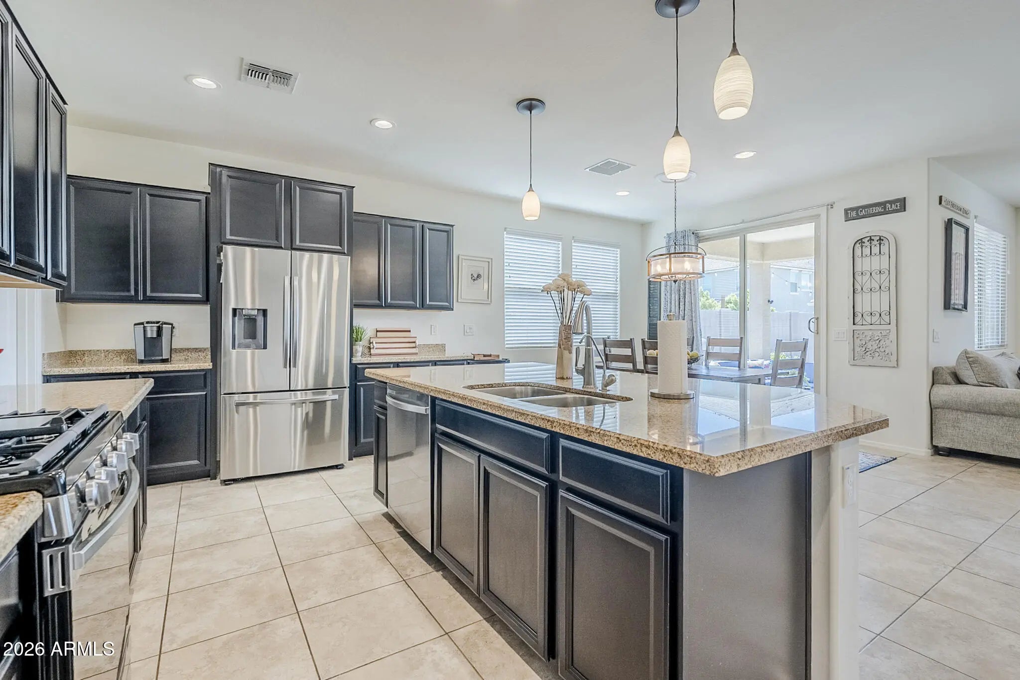 Queen Creek Border Location | 3-Car Tandem Garage | Large Lot with RV Gate | Move-In Ready. Live on the highly desirable Queen Creek/San Tan Valley border in sought-after Morning Sun Farms, offering the perfect blend of convenience, value, and Arizona lifestyle living. This well-maintained, single-story home sits on a spacious lot and features a 3-car tandem garage plus a double gate—ideal for storing toys, trailers, or creating the ultimate workshop space. Inside, you'll find a bright and open split floor plan filled with natural light and designed for modern living. The chef-inspired kitchen showcases new stainless-steel appliances, granite countertops, a large center island with breakfast bar seating, and an oversized walk-in pantry—perfect for entertaining and everyday functionality. The private primary suite offers a relaxing retreat with a soaking tub, walk-in shower, dual vanities, and an oversized walk-in closet. Two secondary bedrooms share a convenient dual entry bath, and a separate powder room provides added comfort for guests. Step outside to your low-maintenance backyard oasis featuring pavers, artificial turf, mature landscaping, and a tranquil water feature. The pet-friendly landscaping and RV gate make this outdoor space both beautiful and practical. Located just minutes from dining, shopping, parks, top-rated schools, and commuter routes, this move-in-ready home offers the space, flexibility, and lifestyle buyers are searching for in Queen Creek and San Tan Valley, AZ.