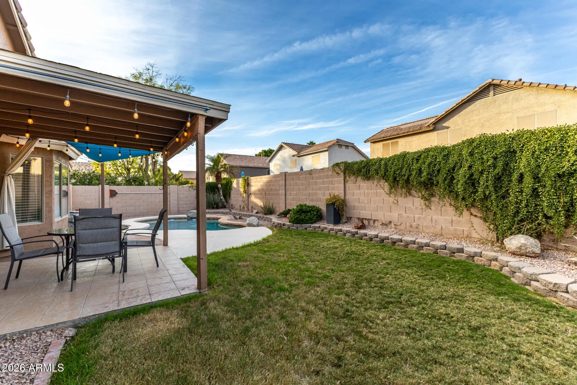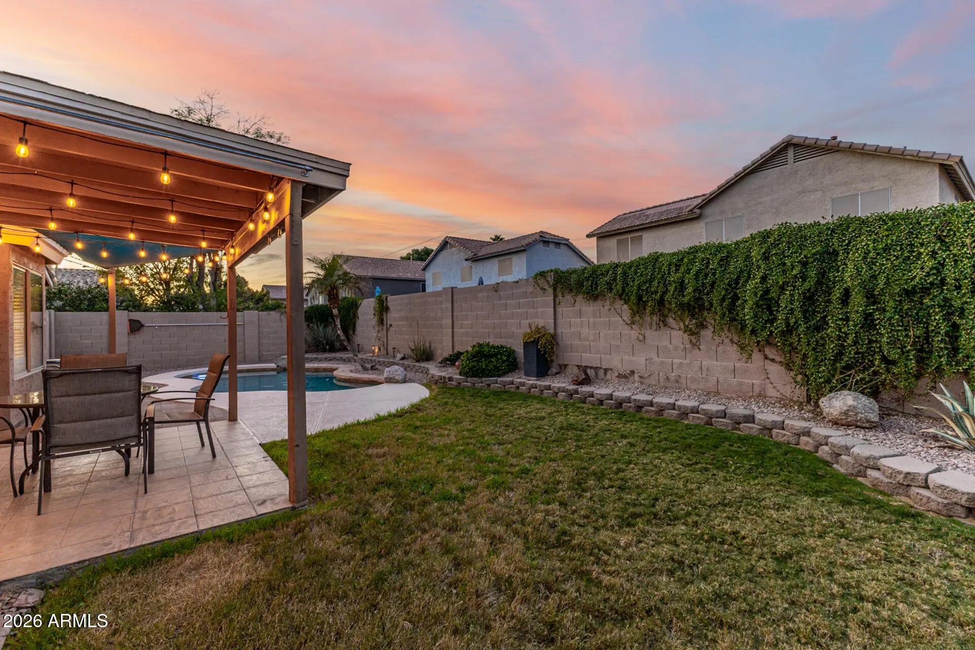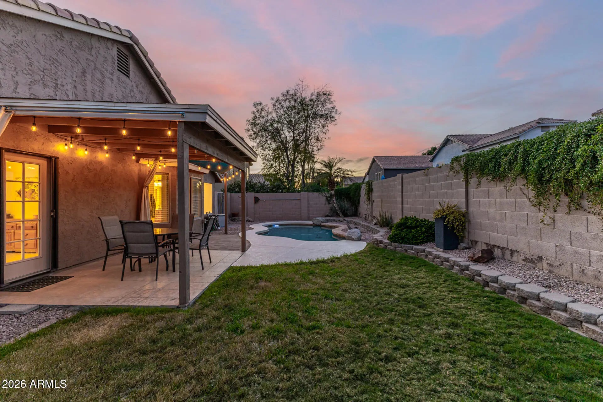 **BEAUTIFUL SINGLE STORY**Sparkling Pool**Granite Counters**Fresh Paint** New Carpet** Be impressed with the gorgeous street appeal - updated landscaping, paver lined drive & turf front yard. Entertain in the living/dining room that opens to the spacious kitchen and family room. Granite counters, stainless appliances & pendant lighting gives a warm welcome. The owner's suite features a bay window, garden tub, dual vanity & walk-in closet with custom shelves. Dig your toes into the new carpet and admire the fresh paint throughout. The oasis backyard features a refreshing play pool, covered patio with Edison lights. There is even a wood burning pizza oven! Let the party begin!! Added insulation and new thermostat provides energy efficiency. High speed Google fiber means you're always.... connected, great for work and gaming. Walking distance to the elementary school, junior high and playground. Tour today and make this amazing house your new home.