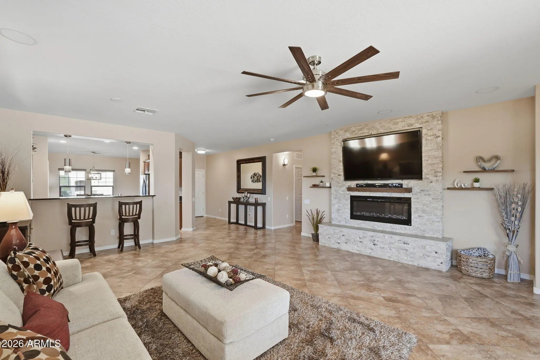 Nestled in Bella Via, this home flows effortlessly and is ideal as a move-in-ready home or a lock-and-leave vacation retreat. The main living area is anchored by a striking stone feature wall with an electric fireplace—perfect for gathering, relaxing, or entertaining friends and family. The primary suite serves as a private sanctuary, featuring a beautifully remodeled walk-in shower for ultimate comfort, while the bedrooms provide flexible space that can easily function as a home office or guest rooms. Outside, a custom heated pool with gas fire pots, a tranquil water feature, and a travertine deck create a low-maintenance, resort-style escape. Neighboring a greenbelt, the property offers rare privacy and a serene backdrop, perfect for taking in beautiful Arizona sunsets.