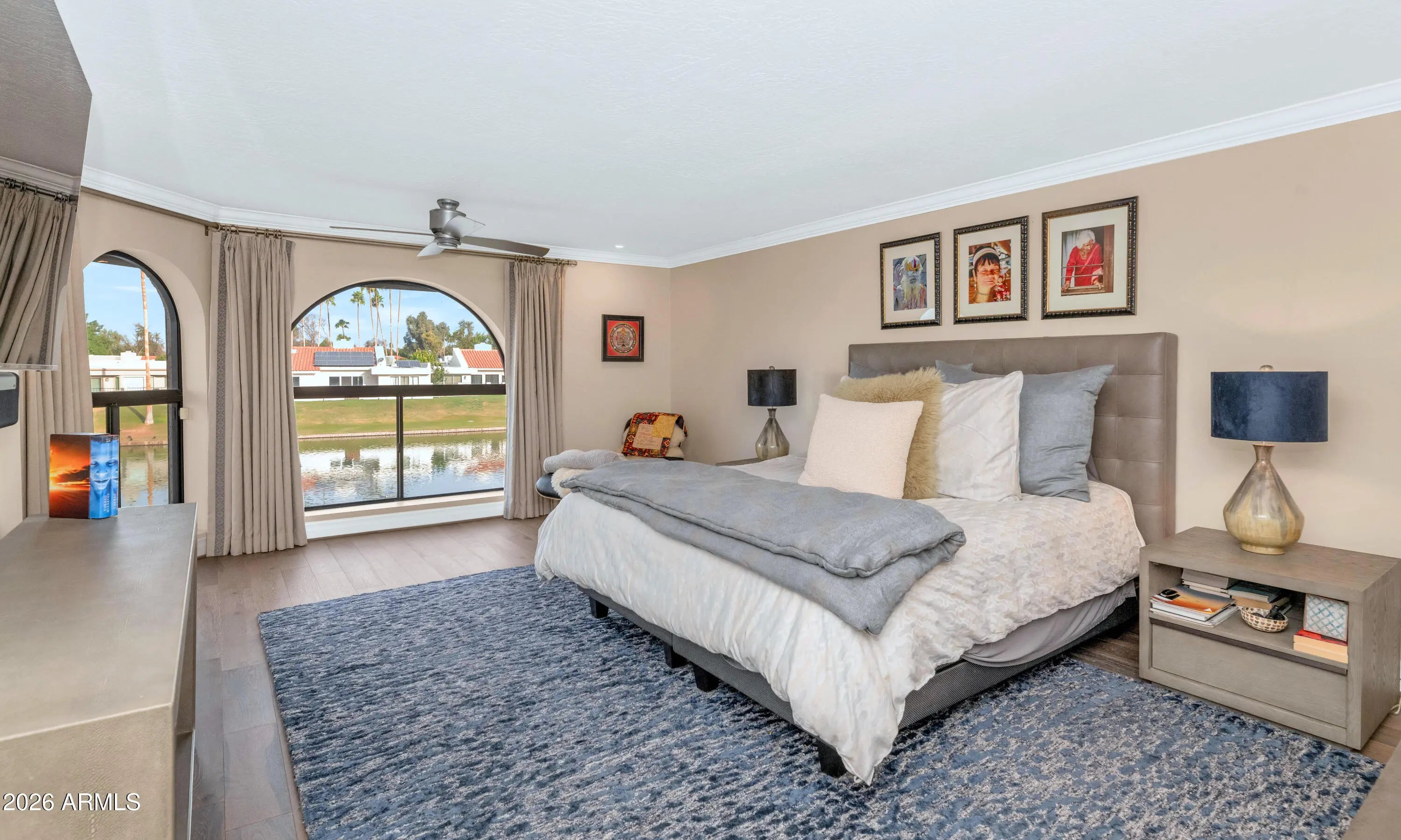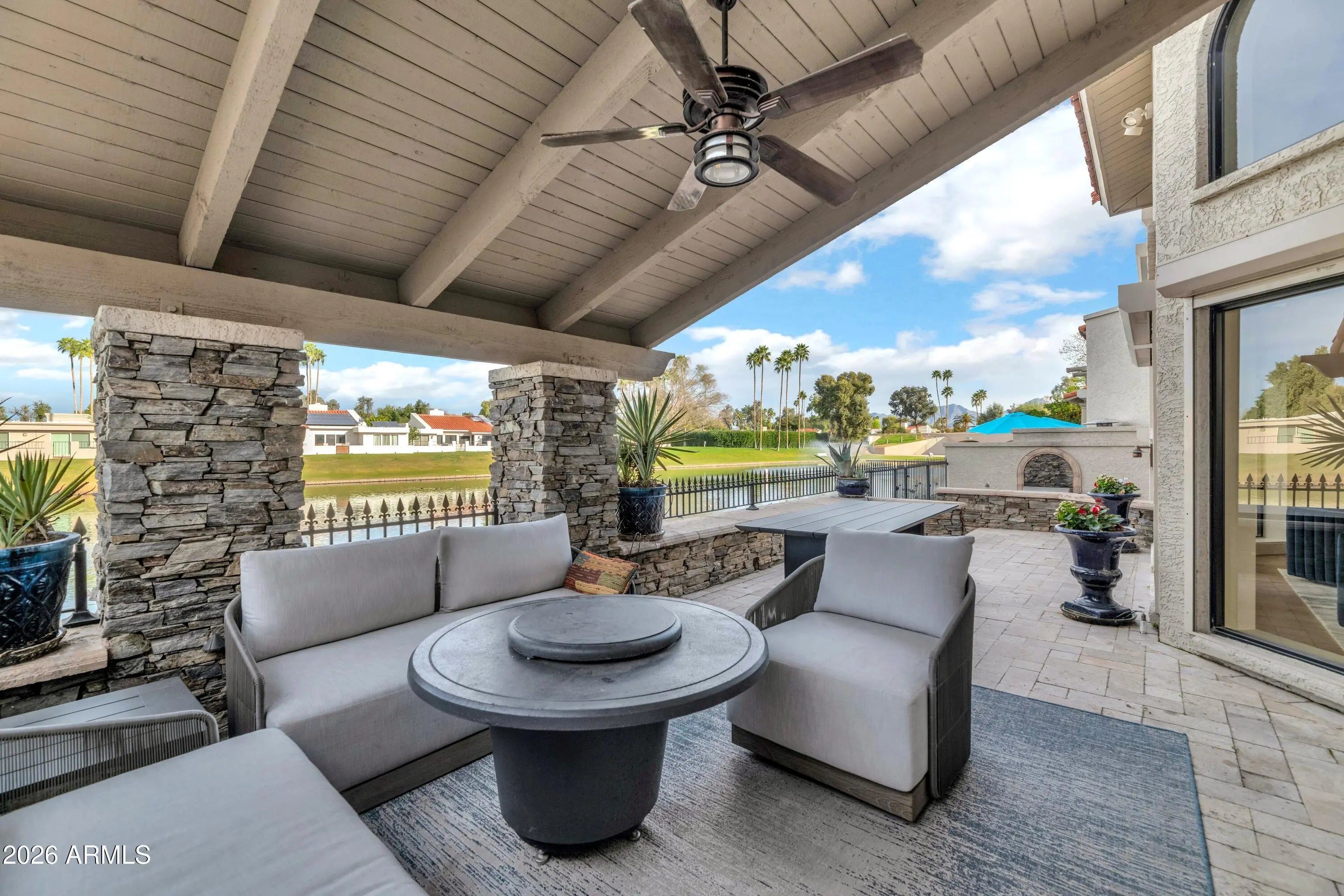 Set along the shores of Lake Angela, this exceptional waterfront residence is nestled within the highly sought-after, gated community of Las Palomas. A dramatic arched entry framed by expansive windows welcomes you inside, highlighting a sculptural curved iron staircase, statement chandeliers, and beautiful tongue-and-groove ceilings. Beautiful wood flooring flows throughout the home, creating warmth and continuity in every space. The main living area is both elegant and inviting, featuring exposed wood beams, a striking stone fireplace, and a wall of windows capturing serene lake views. Designed for effortless entertaining, the home offers both formal and casual gathering spaces that flow seamlessly together. The designer kitchen is a true centerpiece, showcasing leathered Taj Mahal and granite stone countertops, barstool seating, an induction cooktop, and a Sub-Zero refrigerator with custom cabinet paneling. Additional highlights include a built-in microwave, dishwasher, walk-in pantry, and a light-filled eat-in kitchen area perfect for everyday dining. Adjacent, the custom bar area is equipped with illuminated glass cabinetry, a dedicated ice maker, and wine refrigeration ideal for entertaining. An elegant formal dining room makes a bold statement with its dramatic paver-stone ceiling inset and courtyard-facing window, offering a refined setting for hosting memorable dinners. The expansive primary suite enjoys breathtaking lake views and unforgettable sunsets. The spa-inspired bathroom features Carrera marble countertops, non-slip tile in shower and floors and a soaking tub with mirrored surround. A massive custom walk-in closet includes a built-in dressing area, glass-front cabinetry, center island with marble top, and chandelier. A rare and highly desirable feature, the downstairs secondary primary suite offers privacy and flexibility ideal for guests or multigenerational living. This spacious retreat includes a large walk-in closet and a spa-like en-suite bathroom complete with a private sauna, creating a true wellness-inspired experience on the main level. A spacious office or bedroom with a full en-suite bathroom provides additional flexibility for work-from-home needs or guest accommodations. An oversized laundry room offers exceptional storage and everyday functionality. The covered back patio delivers a true resort atmosphere with travertine pavers, built-in BBQ, native stone accents, and electric security shades perfect for lakeside relaxation and entertaining. Las Palomas offers a premier lifestyle with sparkling pools, spa, pickleball and tennis courts, horseshoes, and shuffleboard. The Scottsdale Greenbelt sits just outside the gates, ideal for walking and biking, while The Mercado on Hayden is moments away with popular dining, shopping, and local favorites. An extraordinary opportunity to experience refined Scottsdale luxury in a private waterfront setting.