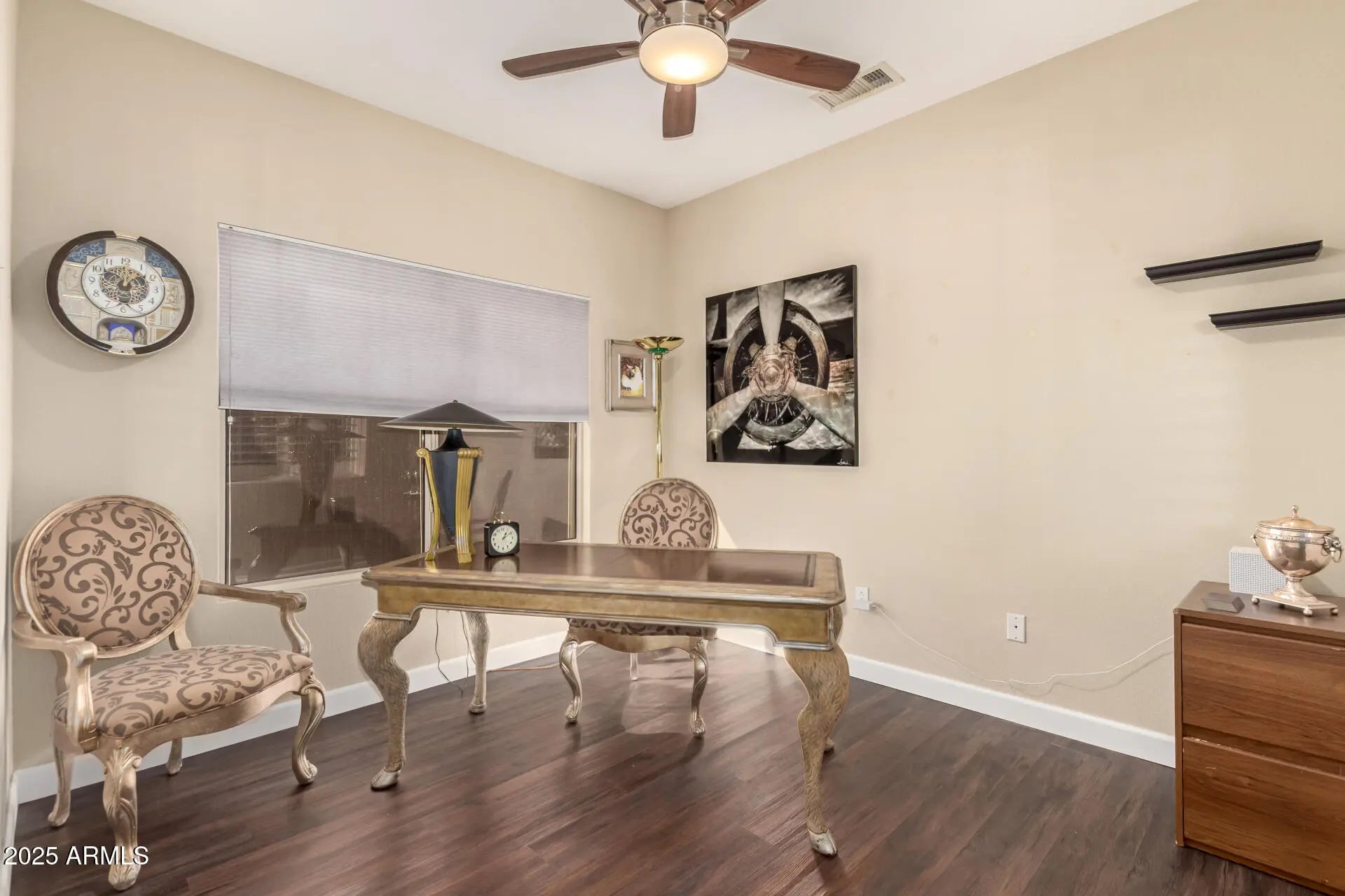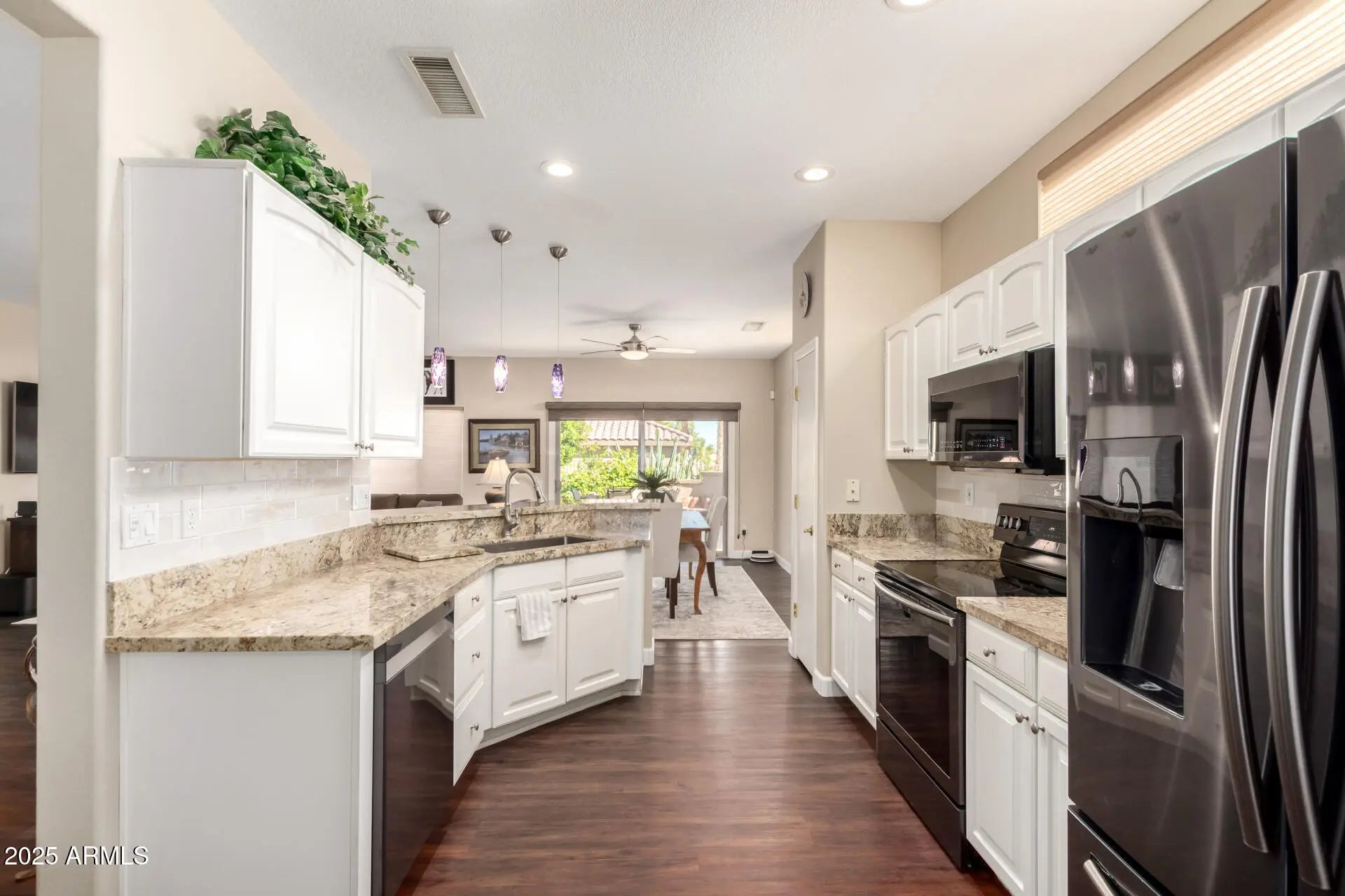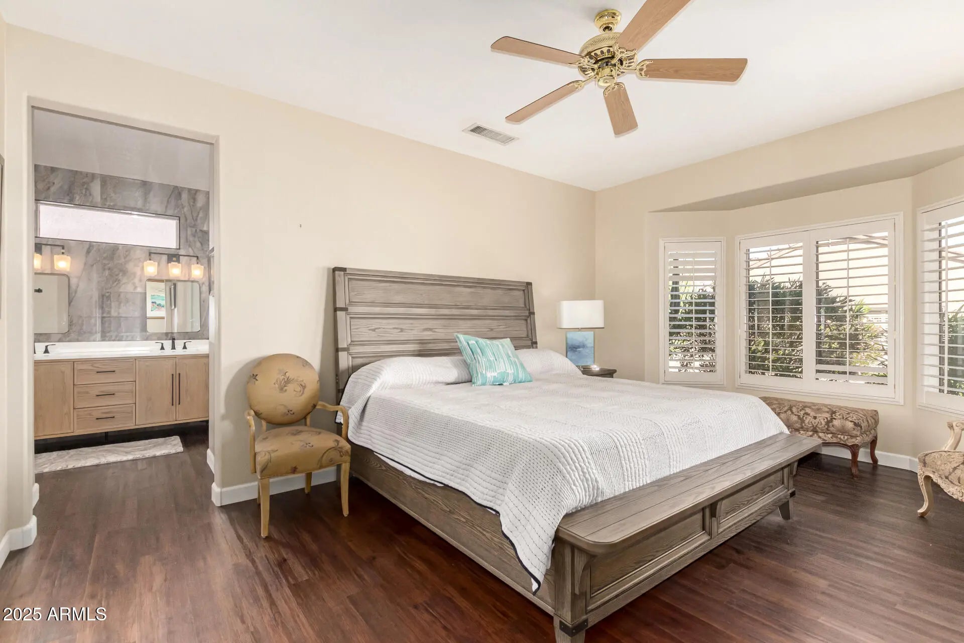 This gorgeous 2-bedroom home, Madera model, is perfectly situated on a desirable corner lot in Sun City Grand. From the beautifully manicured landscaping and 3-car garage to the inviting screened glass-and-iron entry door, every detail impresses. Step inside to discover bright, welcoming living spaces enhanced by wood-look flooring, fresh interior paint, abundant natural light, Roman shades throughout, and elegant plantation shutters in the owner's suite. The immaculate kitchen is ideal for entertaining, featuring spacious cabinetry, granite countertops, tile backsplash, and stainless steel appliances. The primary retreat offers a charming bay window, a custom California Closet walk-in system, and a fully remodeled en-suite bathroom with dual sinks. A versatile den provides the perfect space for a home office or hobby room. Enjoy peaceful mornings and relaxing evenings in the serene backyard, complete with a covered patio and tranquil waterfall ideal setting for weekend grilling or unwinding after a long day. Additional highlights include all-new exterior paint and a 7-year-old Trane HVAC system for comfort and peace of mind. Home may be sold fully furnished if desired. Welcome home!