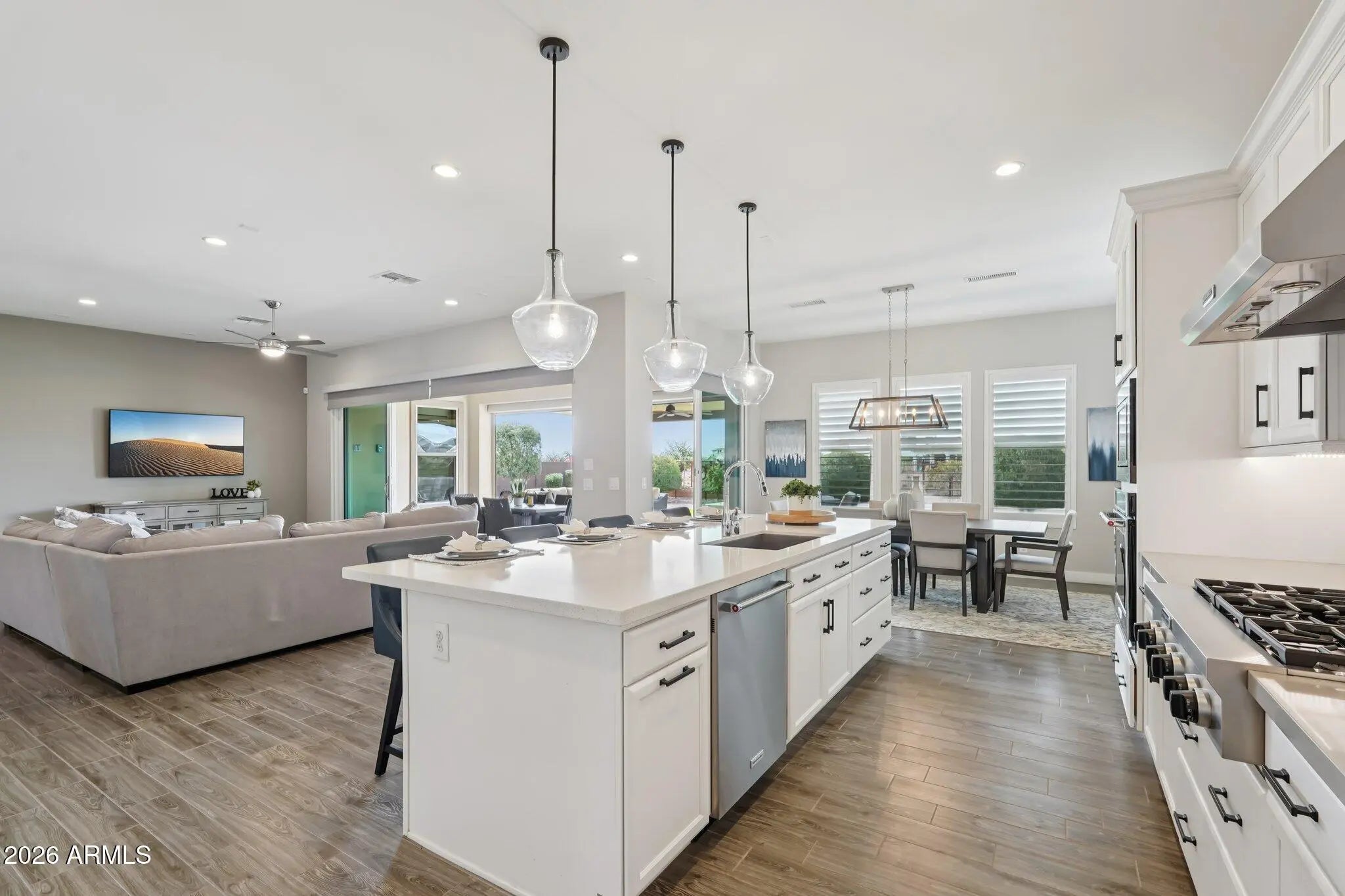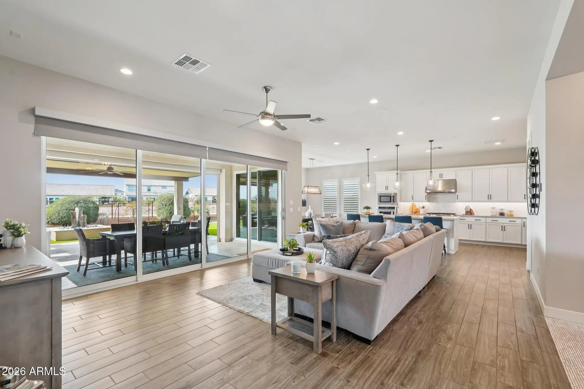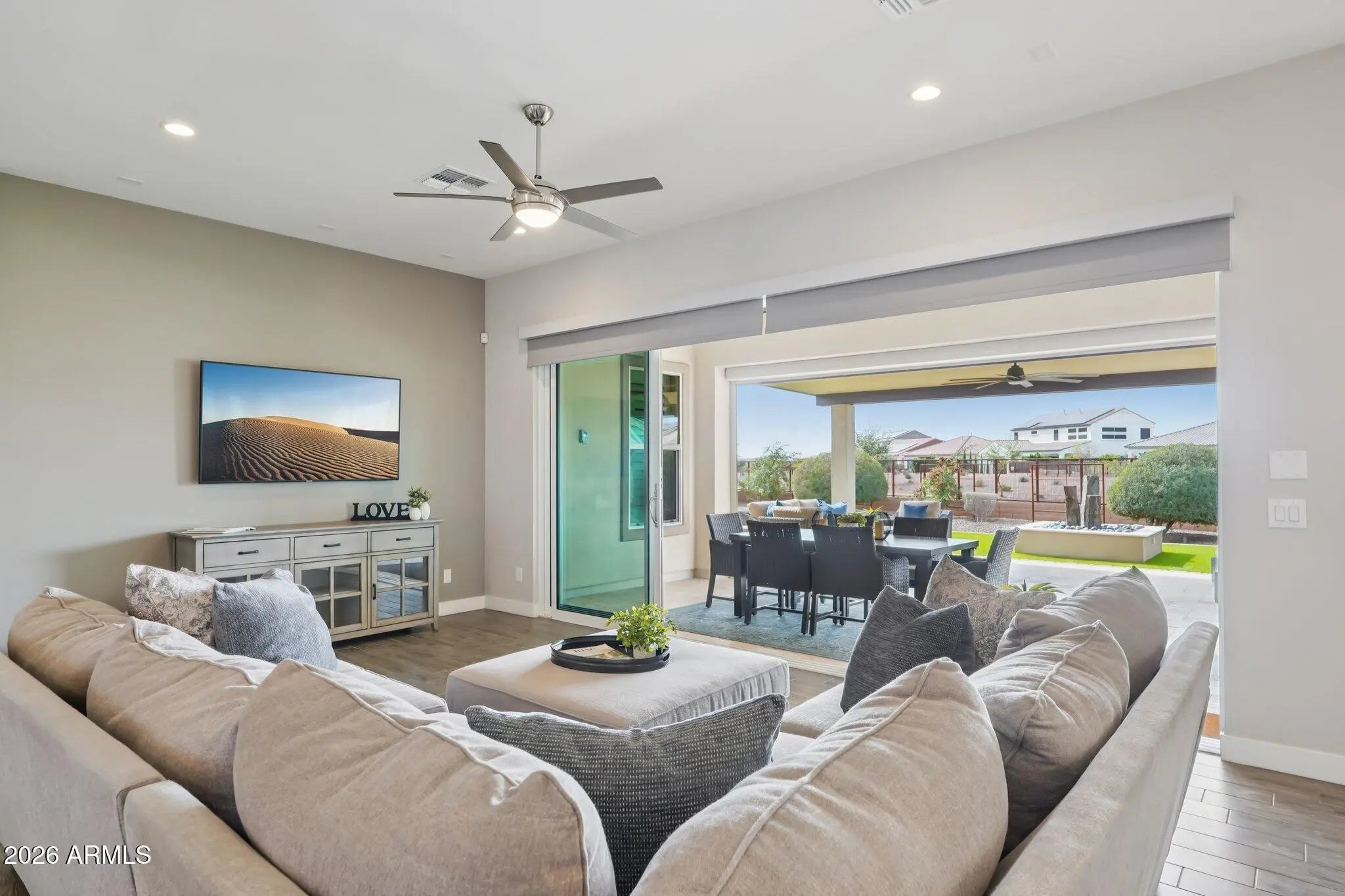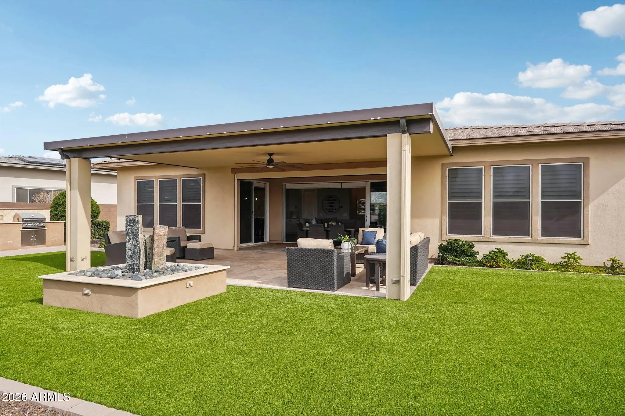 Fall in love with this gorgeous home before you even step inside. The front yard boasts lush synthetic grass, extended paver driveway & walkway. The brick accents & contemporary custom iron door provide an impressive & inviting grand entrance. Step inside to an impeccably maintained home w/pure luxury around every corner. Contemporary design w/wood look tile in all the right areas & upgrade carpet in bedrooms. The chef-inspired gourmet kitchen is a true showstopper - features white cabinets w/42' uppers (roll outs/recycle center & larger crown molding), 6 burner SS gas cooktop w/hood, quartz ctops, huge prep island, designer backsplash, under cabinet/pendant lighting & counter depth built-in look refrigerator. Experience seamless indoor-outdoor living in this stunning home. The heart of the home is a magnificent rolling wall of glass that opens to a 13,137 sf lot, featuring custom interior & exterior power shades that transform the patio into a year-round entertaining suite. Whether hosting or relaxing enjoy the 25' x 15' second travertine patio, complete with a built-in BBQ, cozy firepit & tranquil water feature - all overlooking a greenbelt backdrop. Custom touches t/o include wood planation shutters, larger baseboards, designer lighting & ceiling fans. Retreat to the expansive owner's suite, a true sanctuary featuring a spa-inspired ensuite. Enjoy dual quartz vanities w/framed mirrors, a deep soaking tub & a custom-tiled shower w/floor-to-ceiling detail & a heavy glass frameless door. Complete w/a generous walk-in closet. Excellent split floor plan ensures peace & quiet for the primary suite by placing additional bedrooms on opposite side of the home. The kids wing boasts a flexible teen retreat for gaming or lounging, a quiet office (with half bath across the hall) & 3 bedrooms. One bedroom - functions as a junior suite, making it ideal for guests. Also, don't miss the kids' built-in desk w/an abundance of doors & drawers. The oversized laundry room w/cabinets are perfect for storage - added features second counter depth fridge, sink & washer/dryer. The 3 car tandem garage is a storage dream, outfitted with custom floor-to-ceiling built-in cabinets, overhead rack & garage service door - added features hot water recirculating pump & water softener ensure this home is as functional as it is beautiful. Other Upgrades: new HVAC unit 2025, $90,000 backyard & pre-wired for surround sound in great room, pre-wired for speakers in kitchen, owner's suite & bath. Some rooms have been newly painted inside & garage. Large park steps from the home that has pickleball courts, soccer field, huge playground, ramada & restrooms. The Meadows Community Center is private for residents to enjoy - featuring: Heated pool and spa Splash pad Playgrounds Grassy areas Game room Lighted pickleball ball courts Bocce ball courts Basketball courts Ramadas Top-rated Peoria schools (grade school through high school) just minutes away. Liberty High School is located in The Meadows master-planned community and is highly regarded, A-rated public school known for strong academics and competitive athletics. Candeo and Basis charter schools are a short drive away as well. The Four Corners with a wide variety of dining, shopping, theaters, banking and medical facilities are just 2-3 miles away. Twenty minutes away is Lake Pleasant. Easy access to boating, fishing, hiking - ideal for outdoor enthusiasts & families alike.