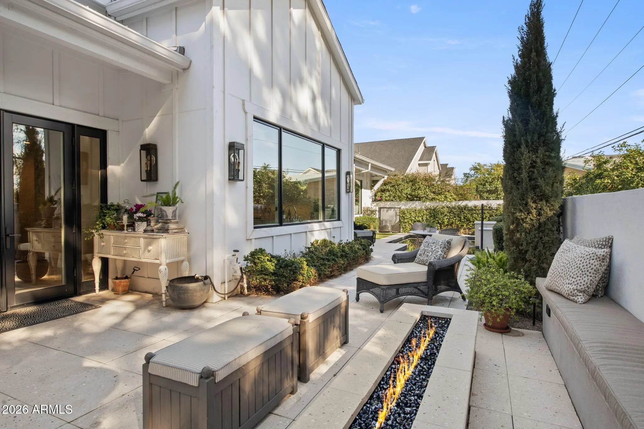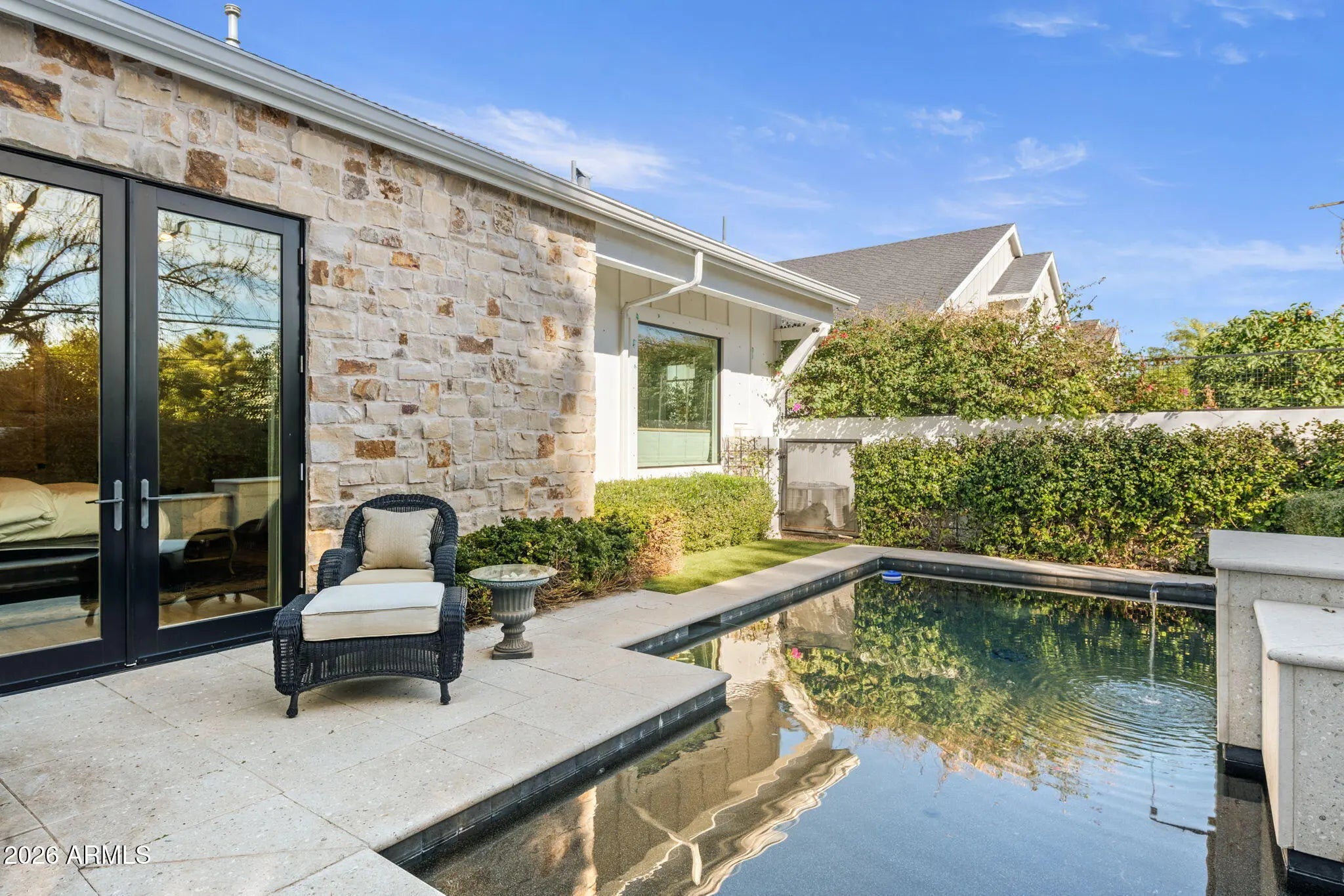 Here's a rare opportunity for a beautifully designed spacious lock 'n leave lifestyle with all the privacy, security, and amenities one would want in the desirable Arcadia area. This stunning, like-new Modern Farmhouse-style home is located on a private interior lot in the exclusive 16-home gated Sycamore community. Beautiful & pristine, this single-level home (one of only four in the community) has an open floor plan & has been customized & designed for sophistication & warmth. Soaring ceilings, Alder crossbeams, gas fireplace, wide-plank French oak floors, additional built-ins & numerous upgrades (see attached list). The light-filled south-facing kitchen features a generous island w/ soapstone & quartz counters, Wolf gas range, Sub Zero refrigerator & beautiful tile work. The primary suite features a bright & spacious bath & generous walk-in closet. The additional 3 bedrooms all have private baths. The professionally designed, low maintenance outdoor spaces include a charming front patio, small pool w/water feature, lovely seating area & fire pit, plus a gracious seating area with drapes for a charming ''outdoor living room'' feel. Spacious 3 car garage w/built ins. Don't miss this truly special home.