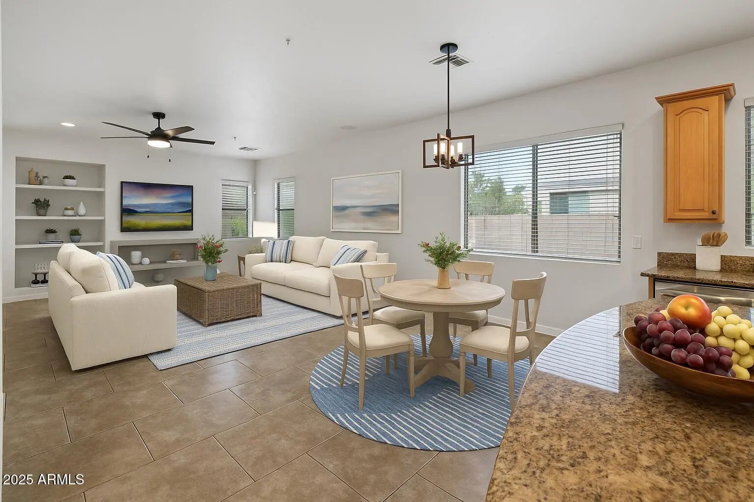 This stunning single-level home offers nearly 3,000 square feet of living space designed for both comfort and style. Fresh neutral carpet, sleek 20-inch tile, modern lighting, ceiling fans, and designer fixtures set the tone, while elegant columns, crown molding, soaring 10-foot ceilings, and 8-foot doors add a touch of sophistication throughout. The chef-inspired kitchen features slab granite countertops with a designer edge, stainless steel appliances, and a large island perfect for entertaining. It flows seamlessly into the oversized family room, complete with built-in shelving, a media niche, and in-ceiling speakers that make it ideal for gatherings of any size. Step outside to a private patio and enjoy beautifully landscaped front and back yards, wide side yards, and... an RV gate that adds convenience for storage or hobbies. The home sits in a desirable neighborhood across from a park and offers close proximity to shopping, dining, entertainment, and freeway access, making it an ideal choice for today's lifestyle. Move-in ready and thoughtfully designed, this property truly stands out as a rare opportunity.