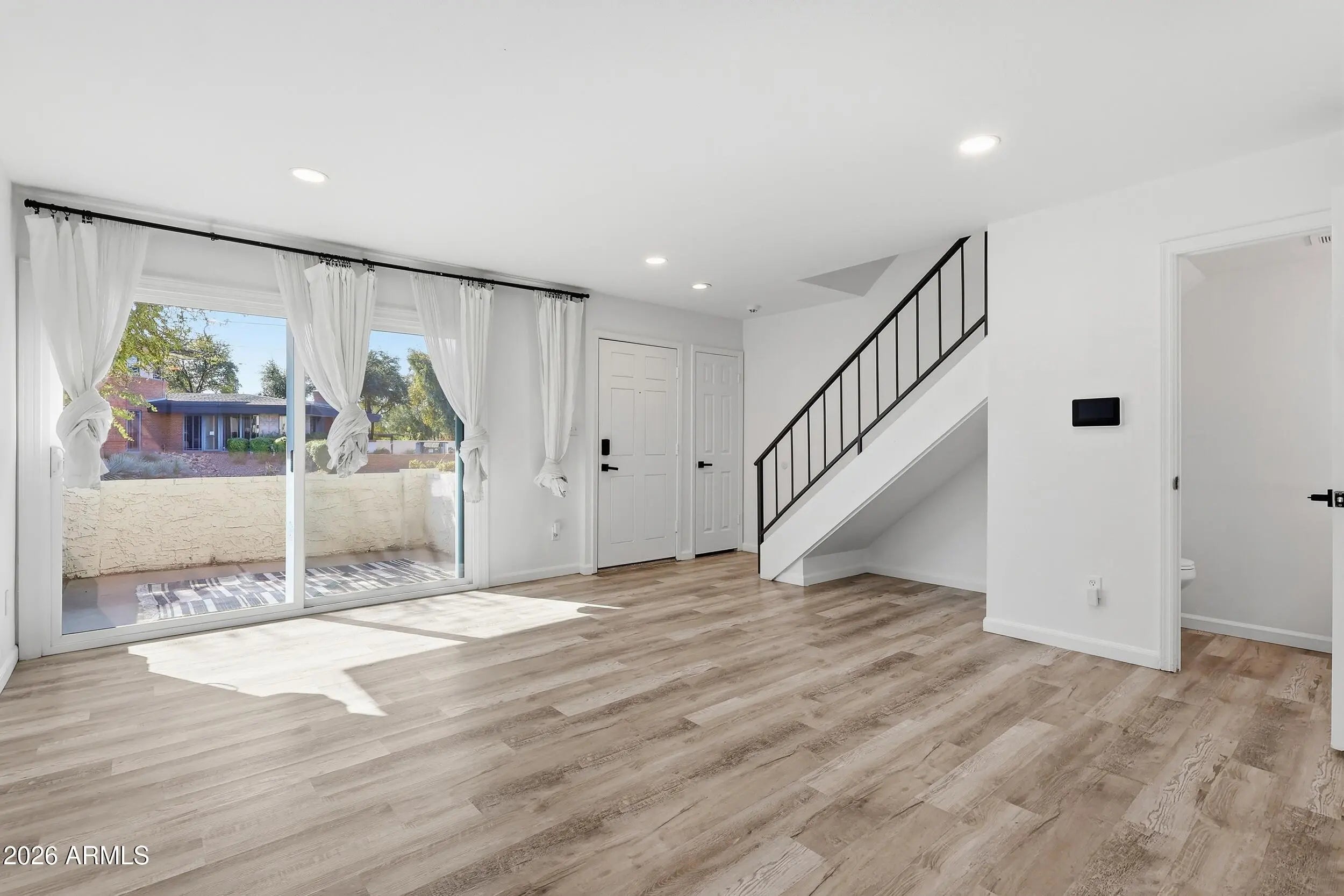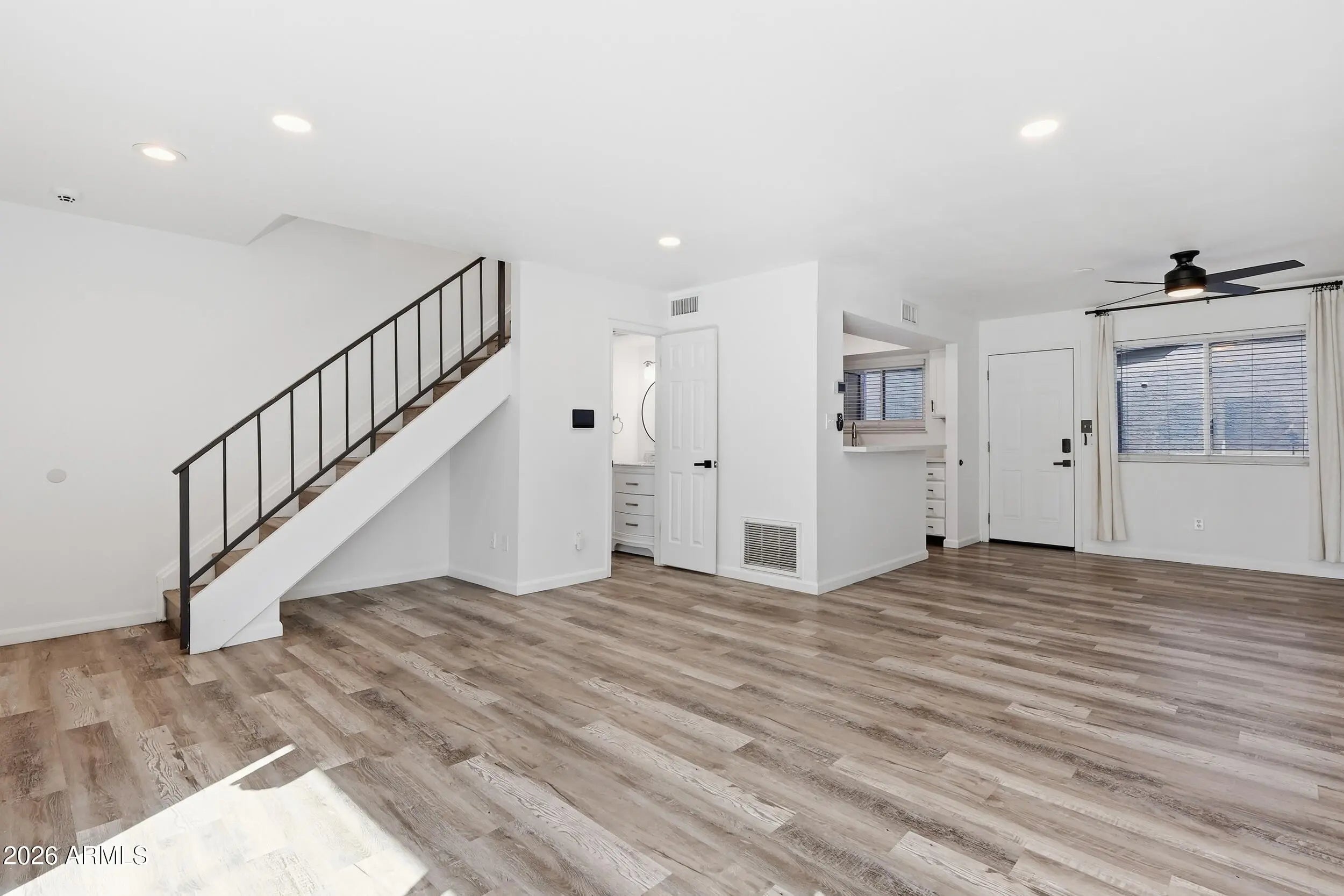 This updated townhome features fresh interior paint and wood-like flooring throughout. Its open floor plan includes a great room and dining area, ideal for entertaining. The kitchen is equipped with stainless steel appliances and quartz countertops. Upstairs, there's a full bathroom and laundry area, while a half bath is conveniently located downstairs. The property includes front and back patios, a two-car garage, and is situated in Midtown, close to Arcadia, Biltmore, and Downtown Phoenix, with easy freeway access and nearby award-winning dining. Additional features include newer windows and an HVAC system.