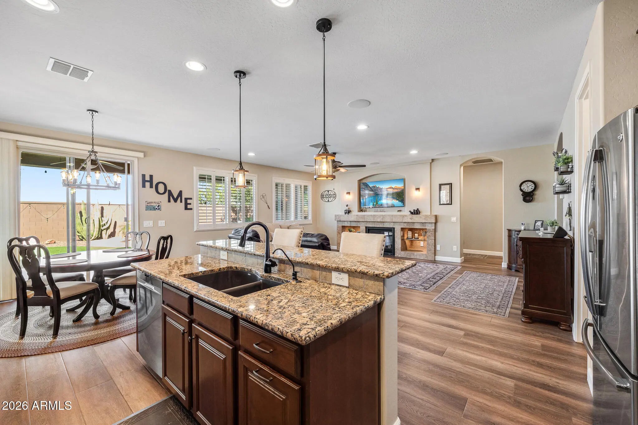 Discover this beautifully maintained home, perfectly situated on a stunning, professionally landscaped lot in one of the area's most sought after neighborhoods. From the moment you arrive, the inviting curb appeal and peaceful surroundings make it clear that this property is truly something special. Inside, you'll find an inviting, open, and welcoming floor plan filled with natural light. The spacious living area flows seamlessly into the dining space and kitchen, creating the perfect setting for everyday living and entertaining. The well appointed kitchen offers ample cabinetry, generous counter space, large pantry, and a comfortable layout ideal for home chefs. The primary suite features a private bath and offers a calm, relaxing atmosphere perfect for unwinding. It includes an impressive, spacious closet and a convenient private entrance to the covered patio. Two additional well sized bedrooms provide flexibility for guests, a home office, or any use that fits your lifestyle. But the real star of this home is the incredible 4 car garage, a rare find! Whether you need space for vehicles, hobbies, storage, or a workshop, this garage provides unmatched versatility and room to grow. Outside, enjoy a meticulously landscaped yard that offers beauty year round. The outdoor space is perfect for morning coffee, weekend barbecues, or simply soaking in the serene surroundings. Located in a scenic community filled with top notch amenities, you'll have access to paths, pools, parks, recreation areas, and more! It's everything you need to enjoy an active, connected lifestyle. Welcome home, this is the one!
