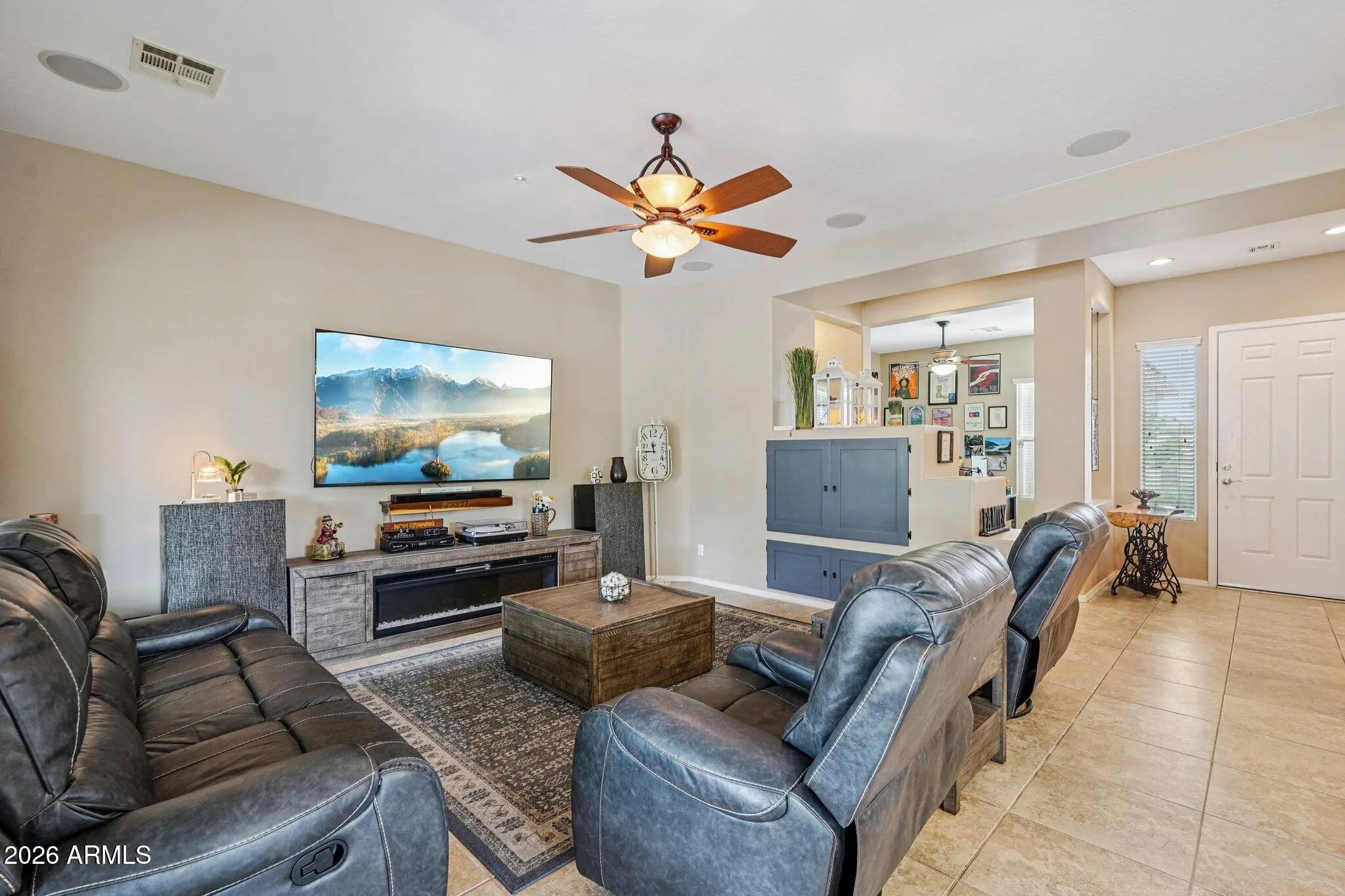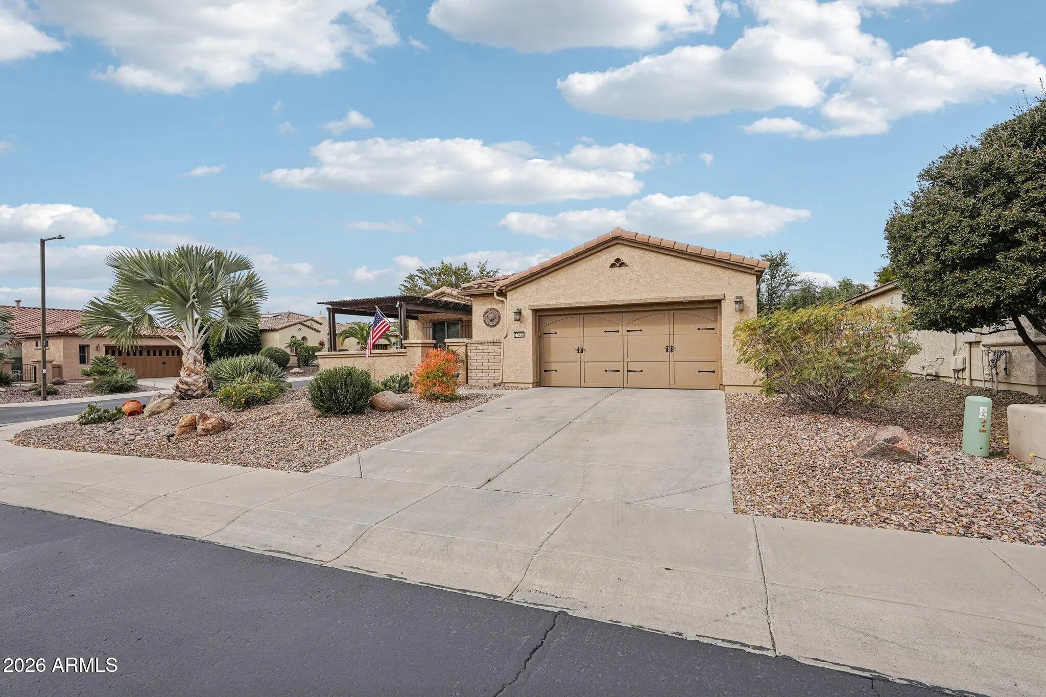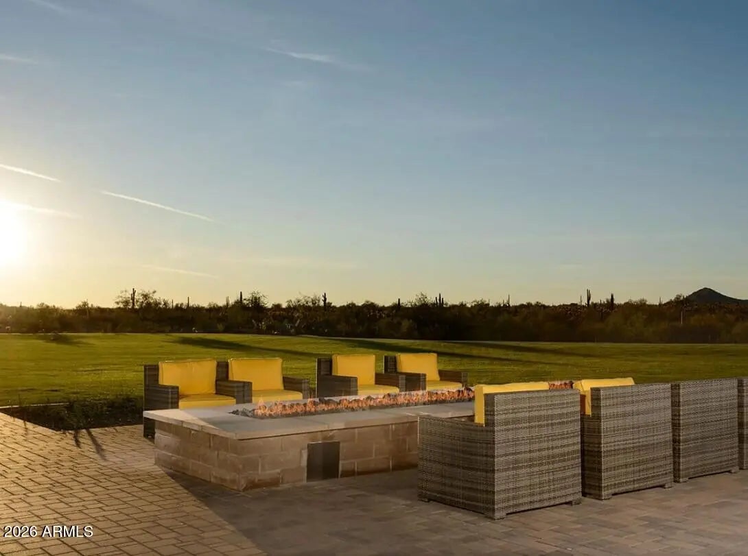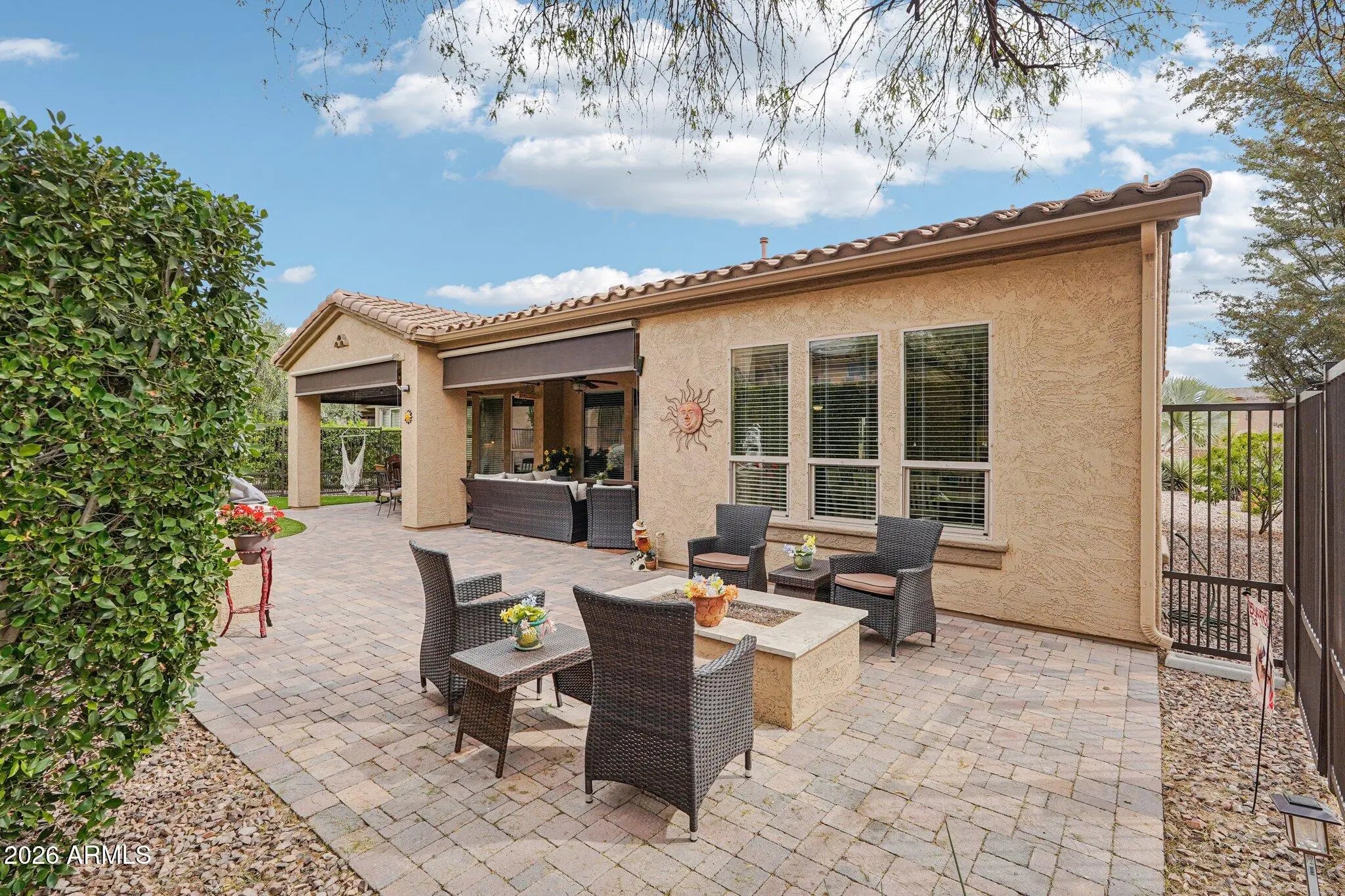 Nestled within the sought after 55+ golf resort community of Trilogy at Vistancia, this beautiful Libertas model home delivers an elevated lifestyle defined by comfort, sophistication and seamless indoor-outdoor living. Offering over 1,870 square feet of thoughtfully designed space, this bright and open floor plan features two bedrooms plus a flex space, two baths and soaring ceilings. A welcoming front courtyard with custom pavers and a pergola-shaded seating area sets the tone, leading into an elegant foyer and beautifully appointed interior. The chef's kitchen is a true centerpiece, showcasing stainless steel appliances, abundant maple cabinetry with roll-out shelving, a custom backsplash, a dedicated dining area and a large island with breakfast bar highlighted by a custom soffit and lighting overhead. The luxurious primary suite is a private retreat with a graceful bay window and a spa-inspired en suite bath featuring dual vanities, a custom-tiled walk-in shower and a spacious walk-in closet. Situated on a premium corner lot, the fully fenced backyard is designed for entertaining and relaxation, complete with synthetic turf, custom fire-pit, built-in BBQ island with seating and power sun shades on the large covered patio. An extended garage provides additional space for a golf cart or storage, while a newer 5-ton HVAC system, soft water system and leased solar enhance comfort and energy efficiency. Residents of Trilogy enjoy access to three distinctive clubs, offering resort-style amenities centered on fitness, dining, golf, relaxation and social connection, creating a vibrant community where members and guests come together to truly enjoy the amazing resort lifestyle!