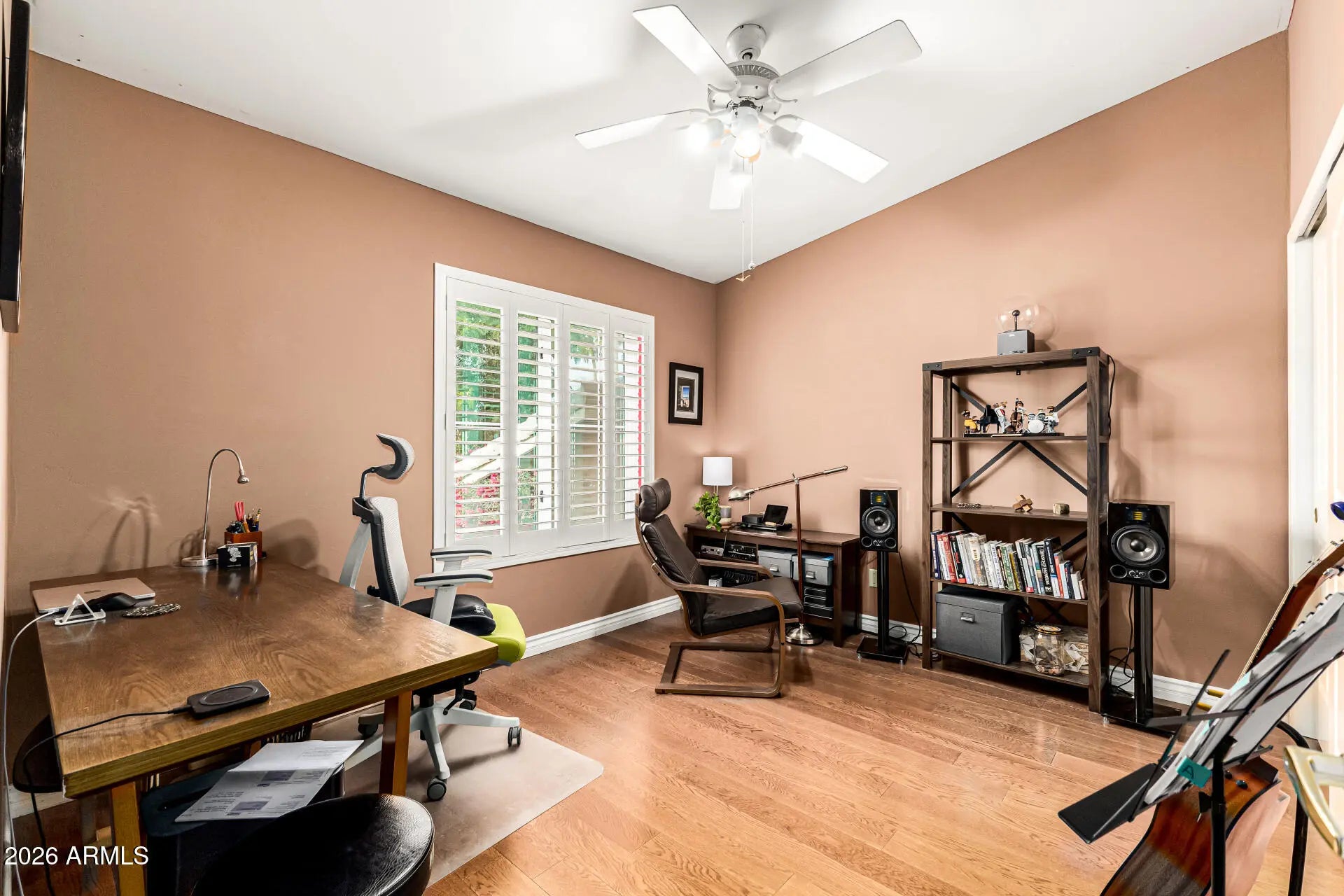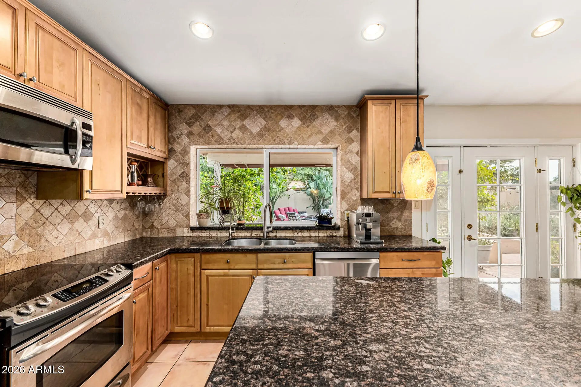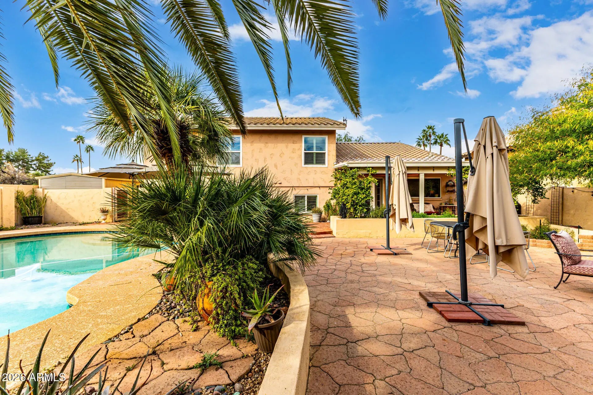 From the moment you arrive, the landscaping makes an impression. The front patio, framed with climbing vines and bursts of color, offer a welcoming entrance with the charm of a private garden. Set on a desirable corner lot, the home features a spacious 3-car garage and a beautifully balanced desert design that blends character with tranquility. Every inch of the outdoor space has been carefully cultivated. From the palo verde tree to the textured palms and surrounding greenery. All wrapping around the patio and pool area to create a peaceful oasis ideal for relaxing or entertaining. Inside, that same warmth and character continues. Rich wood elements and tile flooring throughout add depth while vaulted ceilings, custom wood shutters, and a soft, neutral palette create bright yet comfortable living spaces. The formal dining room is ready for gatherings and celebrations, and the generous family room provides the perfect place to unwind at the end of the day. The heart of the home is the beautifully updated kitchen. Spacious yet comfortable, designed for connection and everyday living. Granite countertops, abundant wood cabinetry with crown molding, a striking stone-tile backsplash, stainless steel appliances, pantry, pendant and recessed lighting, and a large island with breakfast bar make it both functional and stylish. A built-in wine cooler adds an elevated touch. Upstairs bathrooms have been tastefully renovated, and the finished primary suite offers a spa-like escape. The stunning primary shower features gorgeous limestone finishes, creating a refined and relaxing space. Step outside to an expansive patio designed for gatherings of all kinds, from quiet morning coffee to lively celebrations. The generous outdoor living area offers plenty of room to relax, dine, and entertain. The saltwater pool completes the setting, providing a refreshing escape right in your own backyard.