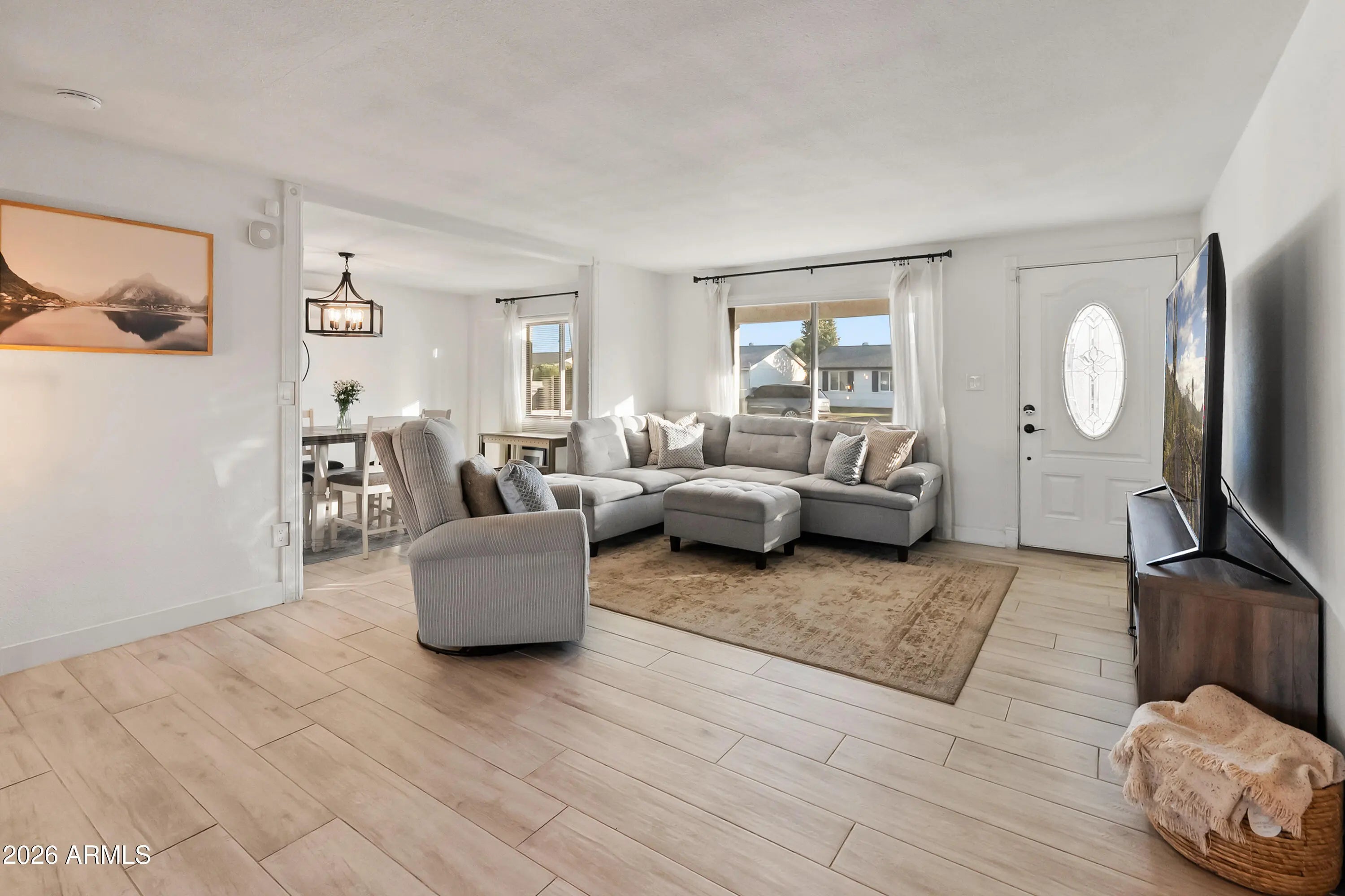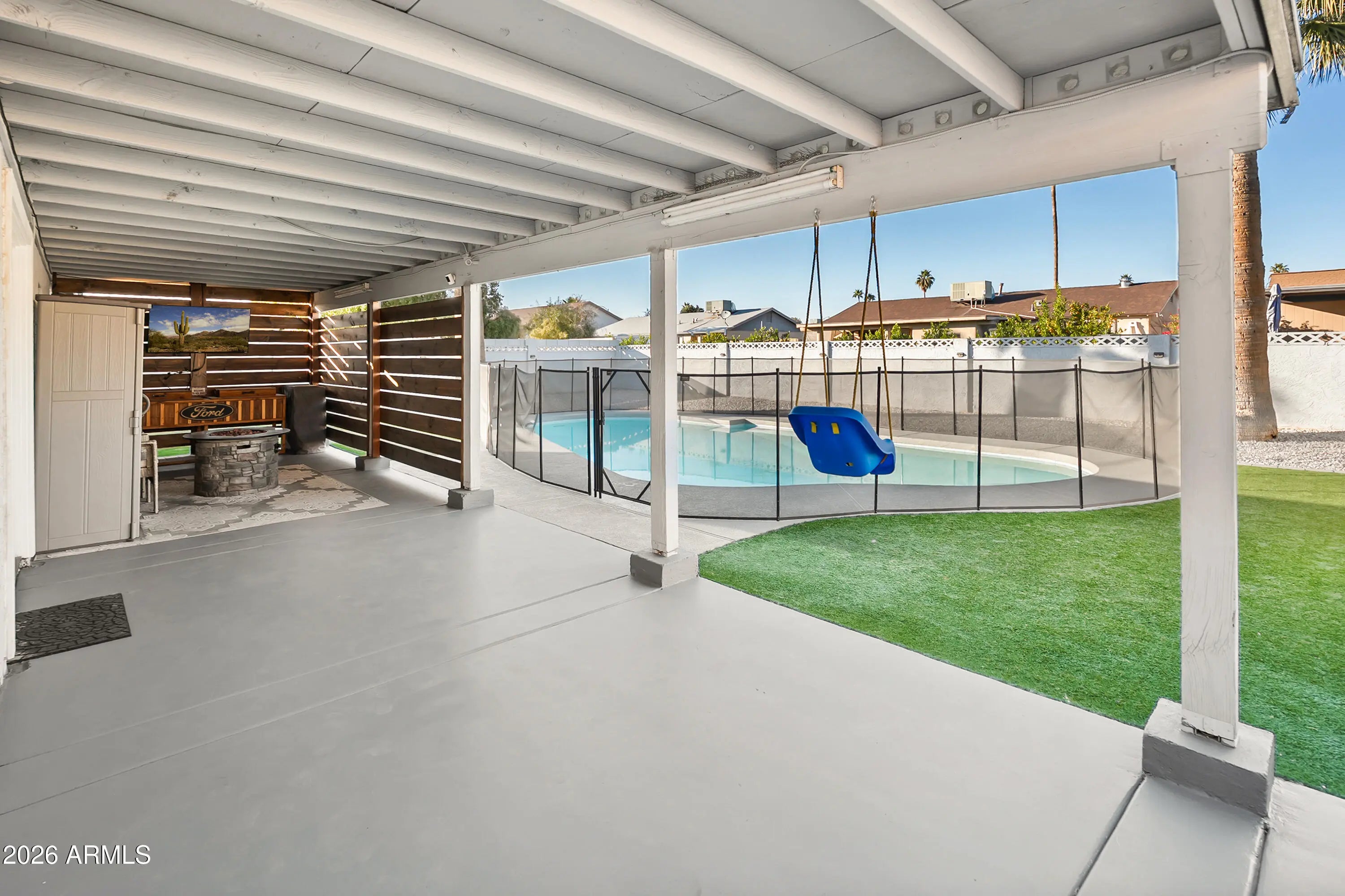 RARE opportunity for a remodeled pool home at an approachable price point! Wood-look tile, LVP flooring & a modern open-concept layout. The updated kitchen anchors the home w/ white cabinetry, granite countertops, SS appliances & breakfast bar seating. A flexible bonus room currently used as a dining area adds versatility for entertaining, a home office or play space. Step outside to your private backyard retreat featuring a sparkling pool w/ a removable safety fence, extended covered patio & low-maintenance turf. This outdoor setup is ideal for summer pool days, family gatherings & year-round Arizona living. Located just minutes from SR-51, the redevelopment of PV Mall, grocery, restaurants & shopping, this home delivers unbeatable access while maintaining a quiet neighborhood feel.