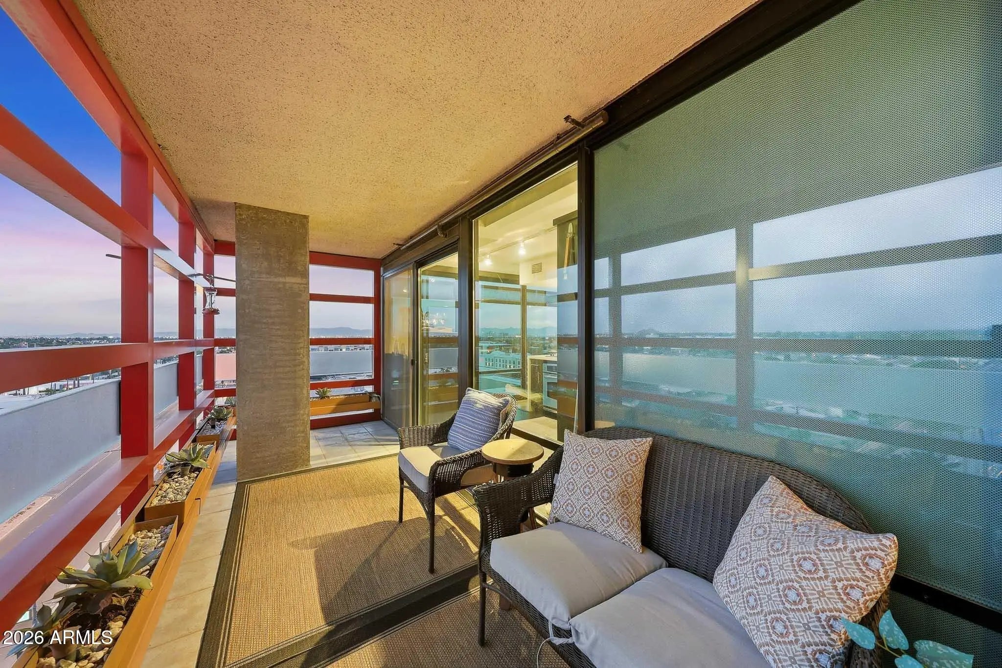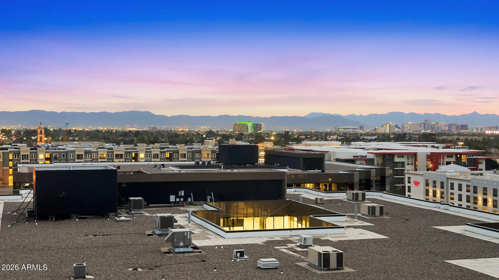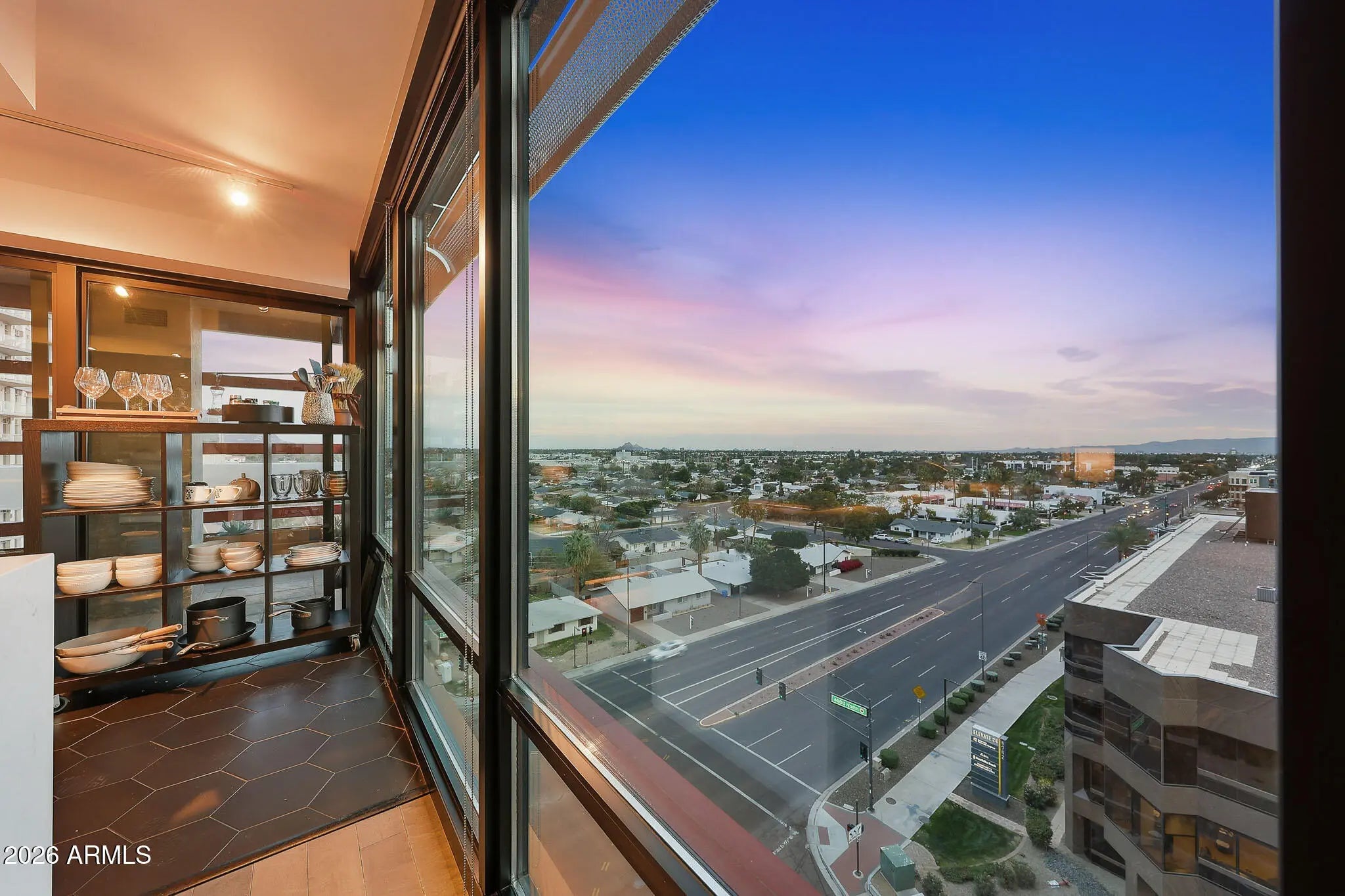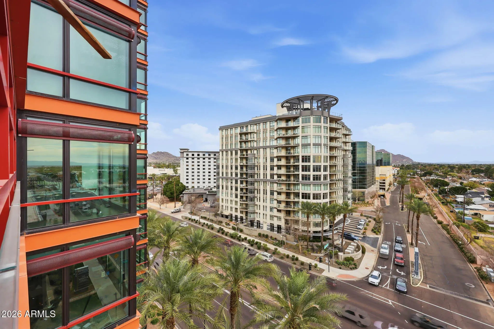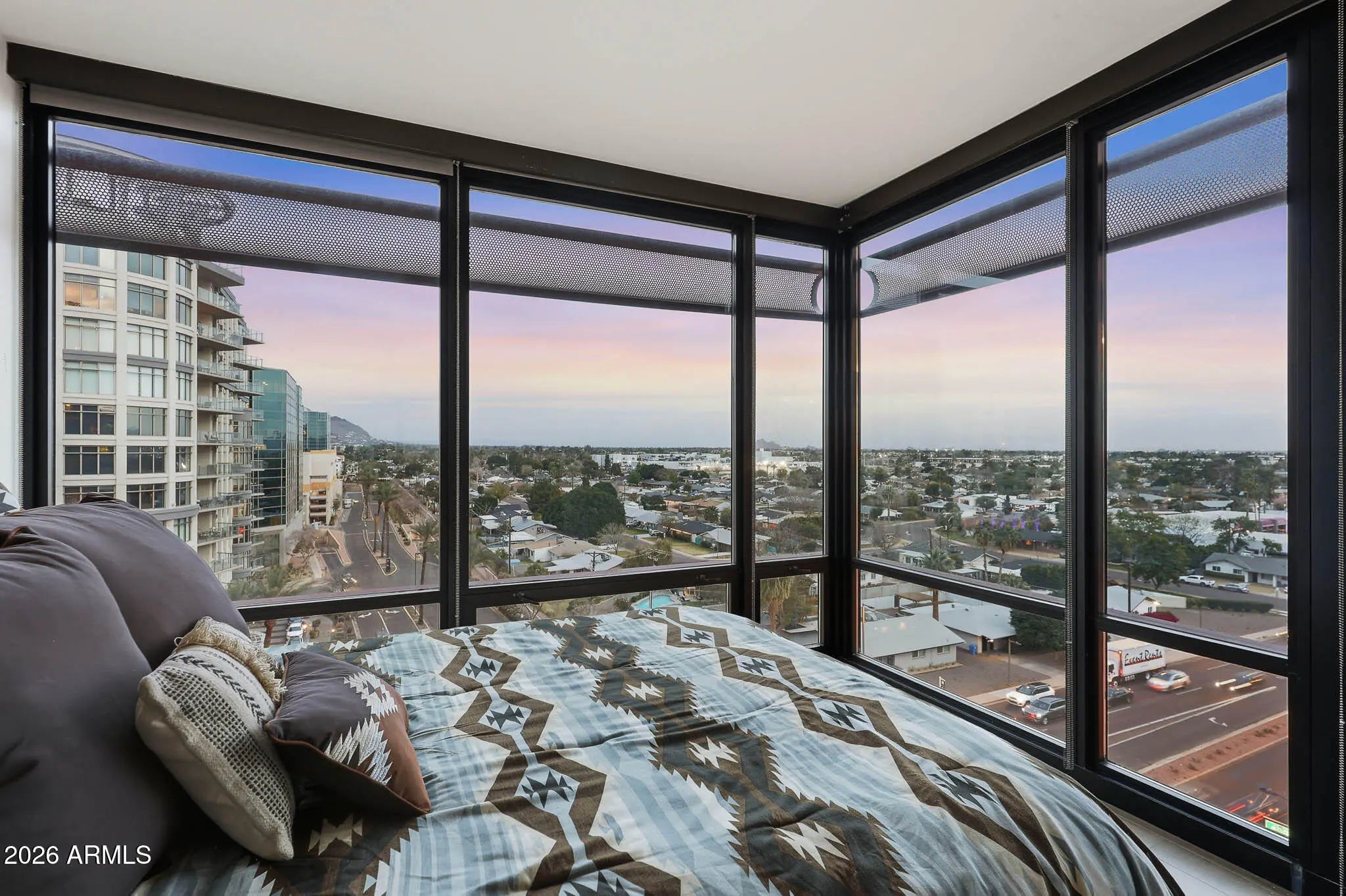 Welcome home to panoramic sunset, mountain, and city light VIEWS in this upgraded 2 BD | 2 BA CORNER UNIT with a SPLIT floor plan on the 9th floor! Filled with natural light, the home showcases wood flooring, a remodeled kitchen with granite countertops, stainless steel appliances, and a gas burner range. Walls of glass frame sweeping city lights, mountain views, and breathtaking Arizona sunsets from multiple areas of this unit, while the private enclosed balcony offers uninterrupted views with no neighboring unit to the right. Start every day with breathtaking skyline vistas from your bedroom. Additional features include updated bathrooms including counters, tile work and cabinets, washer and dryer in the unit and a generous primary walk-in closet. New AC too! Do not forget about a secured reserved parking space with storage space. Residents enjoy resort-style amenities including a rooftop deck with NEW pool and spa (renovation almost complete!!), BBQ areas, panoramic seating spaces, club room, full fitness center, steam room, concierge services like a 24/7 package delivery system, and organized social events. Monthly HOA covers cable, gas, water, sewer, and trash! Elevator access brings convenience right to your door, with premier shopping, dining, entertainment, golf, and coffee spots just steps away. Offering exceptional privacy while remaining close to everything, this home is truly an urban oasis in the heart of the city.