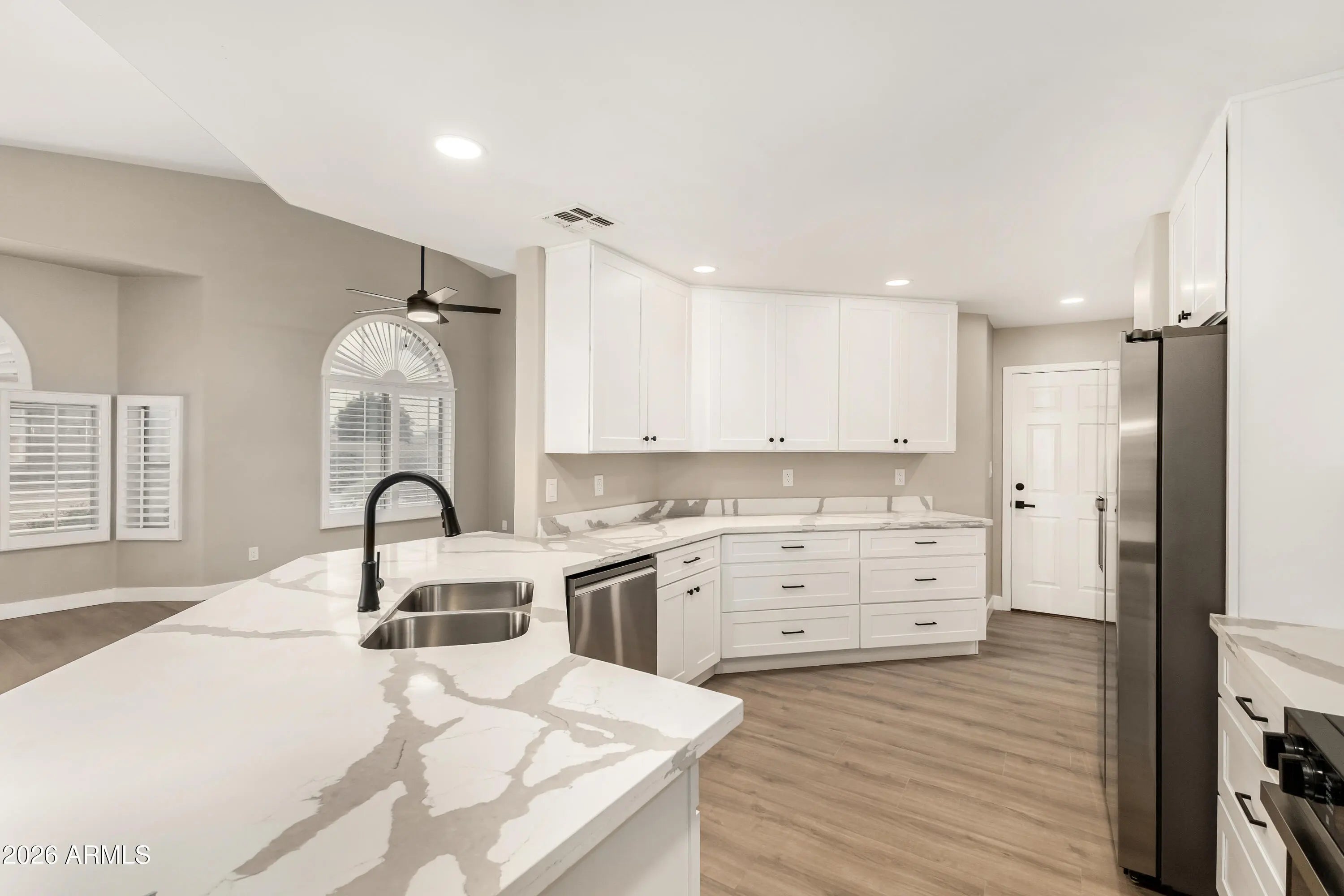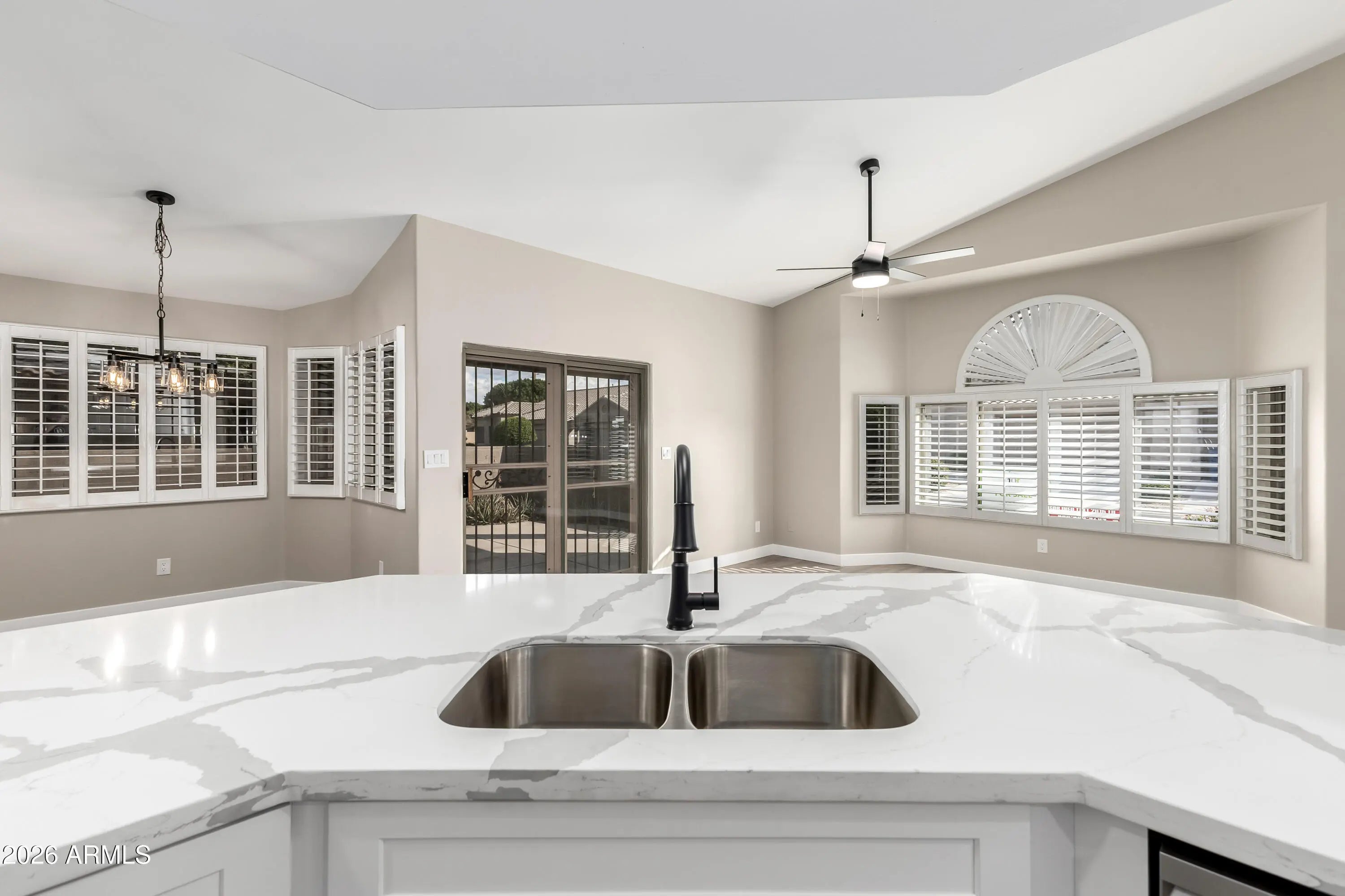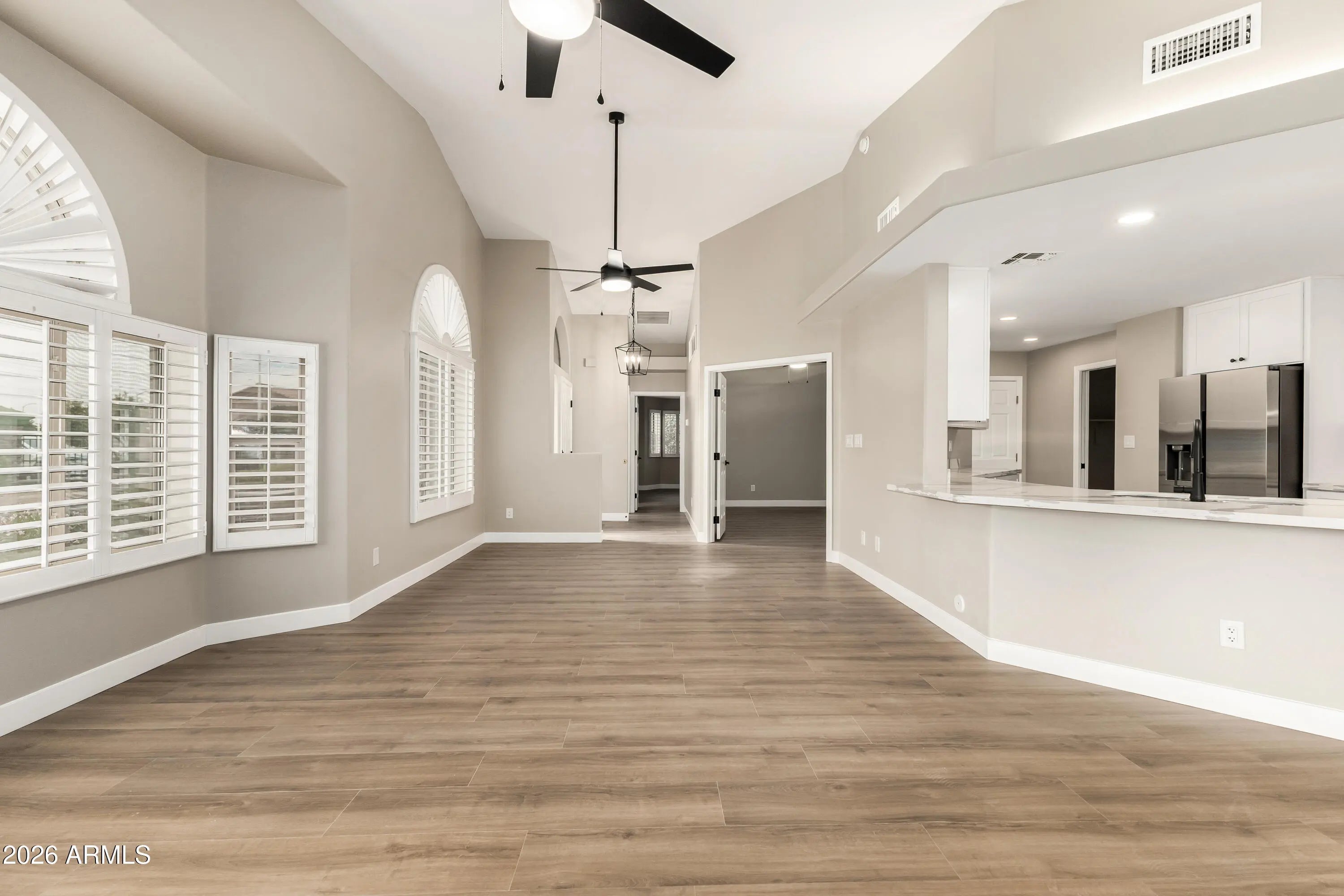 The kitchen in this freshly renovated home features new white shaker cabinets & quartz countertops with bar seating for 4, Samsung stainless appliances + air-fry convection oven. Be the first to enjoy the new 14.2 SEER AC unit, the Luxury Vinyl Plank floors, fresh paint, & upgraded fixtures and ceiling fans throughout. The primary suite includes a bay window, walk-in closet, and a stylishly updated bath with a tiled glass shower and dual vanity. This bright, airy home features vaulted ceilings, recessed lighting, plantation shutters, and large arch windows that fill the spacious great room with natural light. Interior laundry, sunscreens, a covered patio, and an epoxied garage with built-ins complete the home. Located in the sought after 55+ Verde Groves Community with loads of amenities