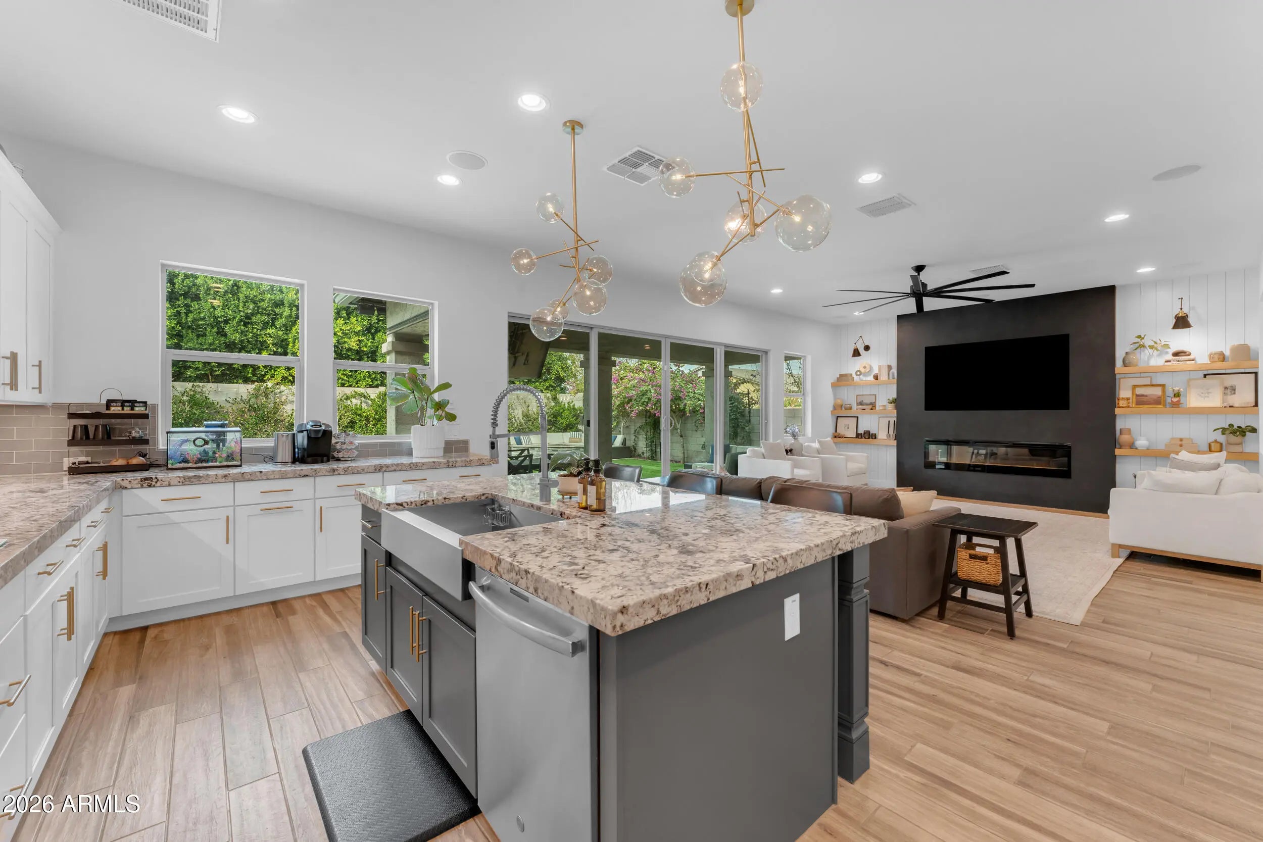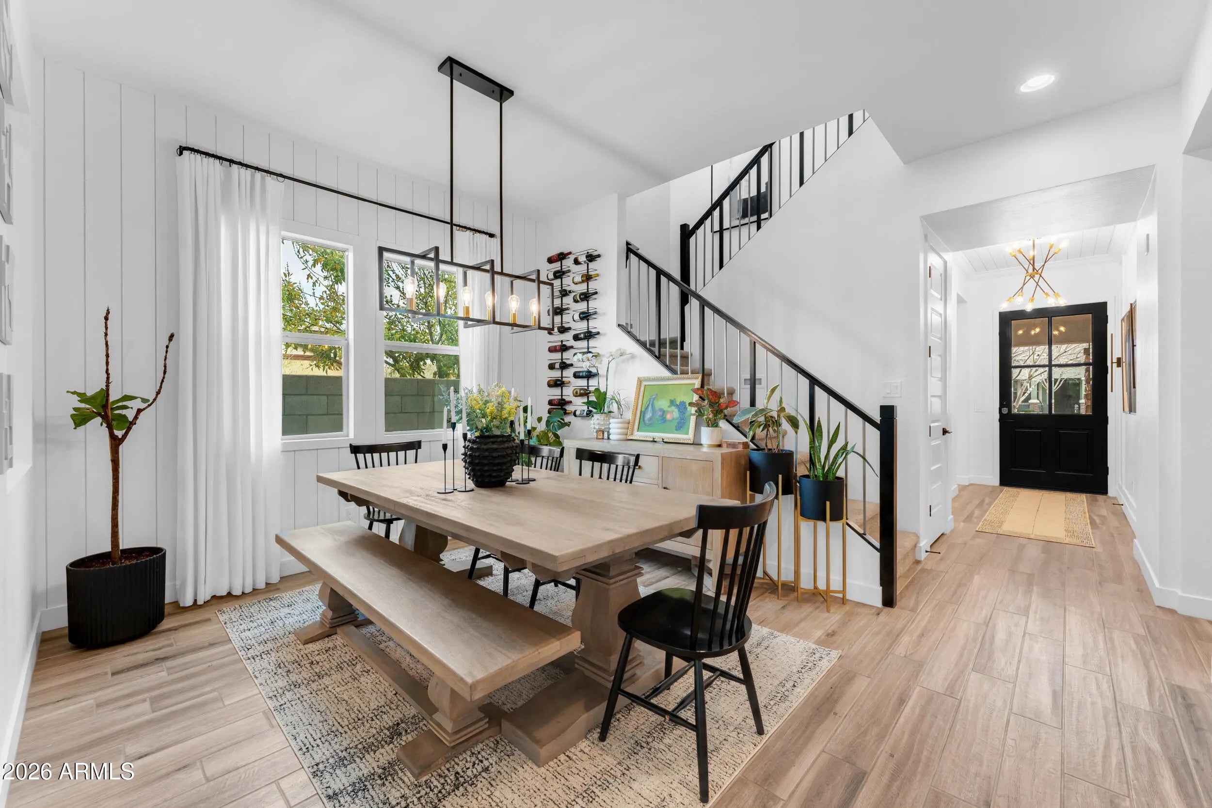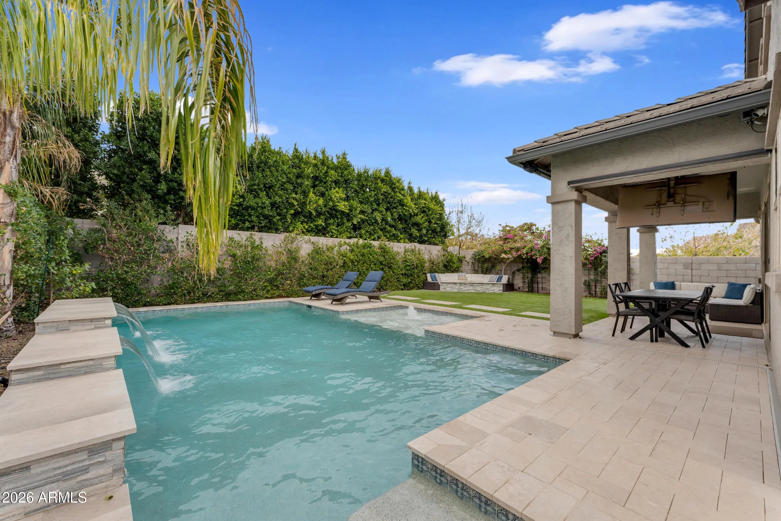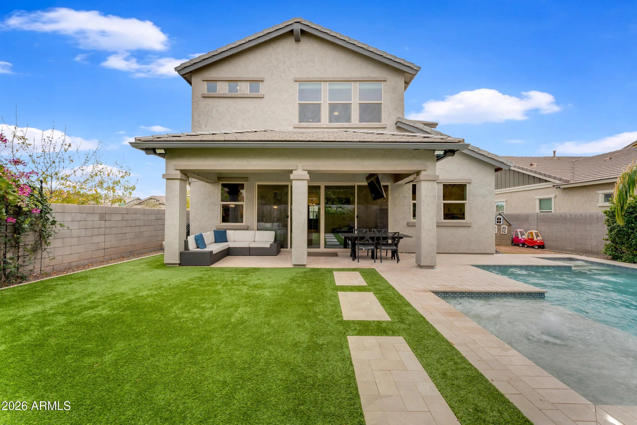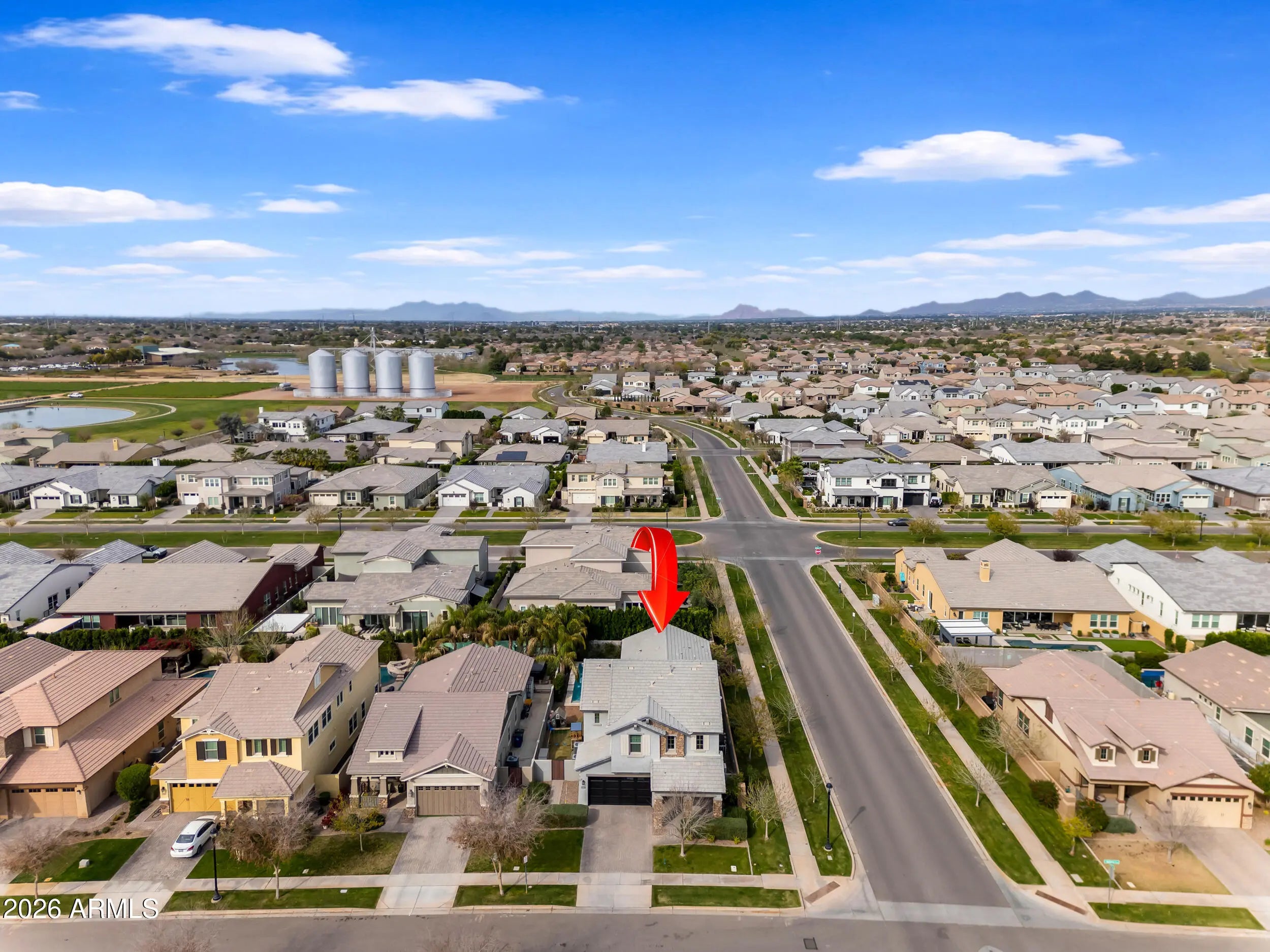 Welcome to luxury living in the heart of Morrison Ranch in Gilbert, Arizona. Situated on a premium 55' wide corner lot, this exceptional 5 bedroom, 4.5 bathroom residence combines thoughtful design, elevated finishes, and true indoor outdoor living. A charming front porch sets the tone as you enter into a home filled with custom woodwork, shiplap accents, and wood look tile throughout the main living areas. Recessed lighting and surround sound enhance the open concept layout, while the electric fireplace creates a warm and inviting focal point in the great room. Designed for both everyday living and entertaining, the chef's kitchen features a gas cooktop, granite countertops, large island, glass subway tile backsplash, stainless farmhouse sink, and an expansive walk in pantry. The formal dining room offers an elegant space for hosting gatherings and celebrations. The downstairs layout offers flexibility with a private bedroom featuring a walk in closet and full bathroom with a walk in shower, along with an additional guest powder bath. Upstairs, a massive loft with surround sound provides flexible living space for a media room, office, or secondary living area. The primary suite is a true retreat with shiplap detail, recessed lighting, dual vanities with granite countertops, custom tile walk in shower, large walk in closet, and additional linen storage. An oversized upstairs en suite bedroom offers the feel of a second primary, while the remaining bedrooms are generously sized. A secondary bathroom with dual vanities and a shower tub combo, along with a spacious upstairs laundry room featuring upper and lower cabinetry and a utility sink, complete the upper level. Step outside to your private backyard oasis. The heated pool with a large Baja step and tranquil water feature anchors the space, surrounded by pavers, artificial turf, and a mature Hong Kong orchid. Outdoor living is elevated with patio misters, surround sound, a gas firepit, and a built in retractable patio television that stays with the home, making entertaining effortless year round. Additional highlights include a Tesla charger, water softener, full house filtration system, and a three car garage with overhead storage. This home is ideally located just minutes from The Epicenter at Agritopia, offering popular dining, coffee shops, and gathering spaces. SanTan Village provides convenient open air shopping, restaurants, and entertainment. Downtown Gilbert's Heritage District features boutique shopping, award winning dining, and community events. Outdoor recreation is abundant with nearby Freestone Park, the Riparian Preserve at Water Ranch, scenic walking and biking paths, and numerous recreational amenities all within approximately 15 minutes of the property. This is a rare opportunity to own a beautifully upgraded home in one of Gilbert's most desirable master planned communities, where timeless design meets everyday comfort and a vibrant lifestyle.