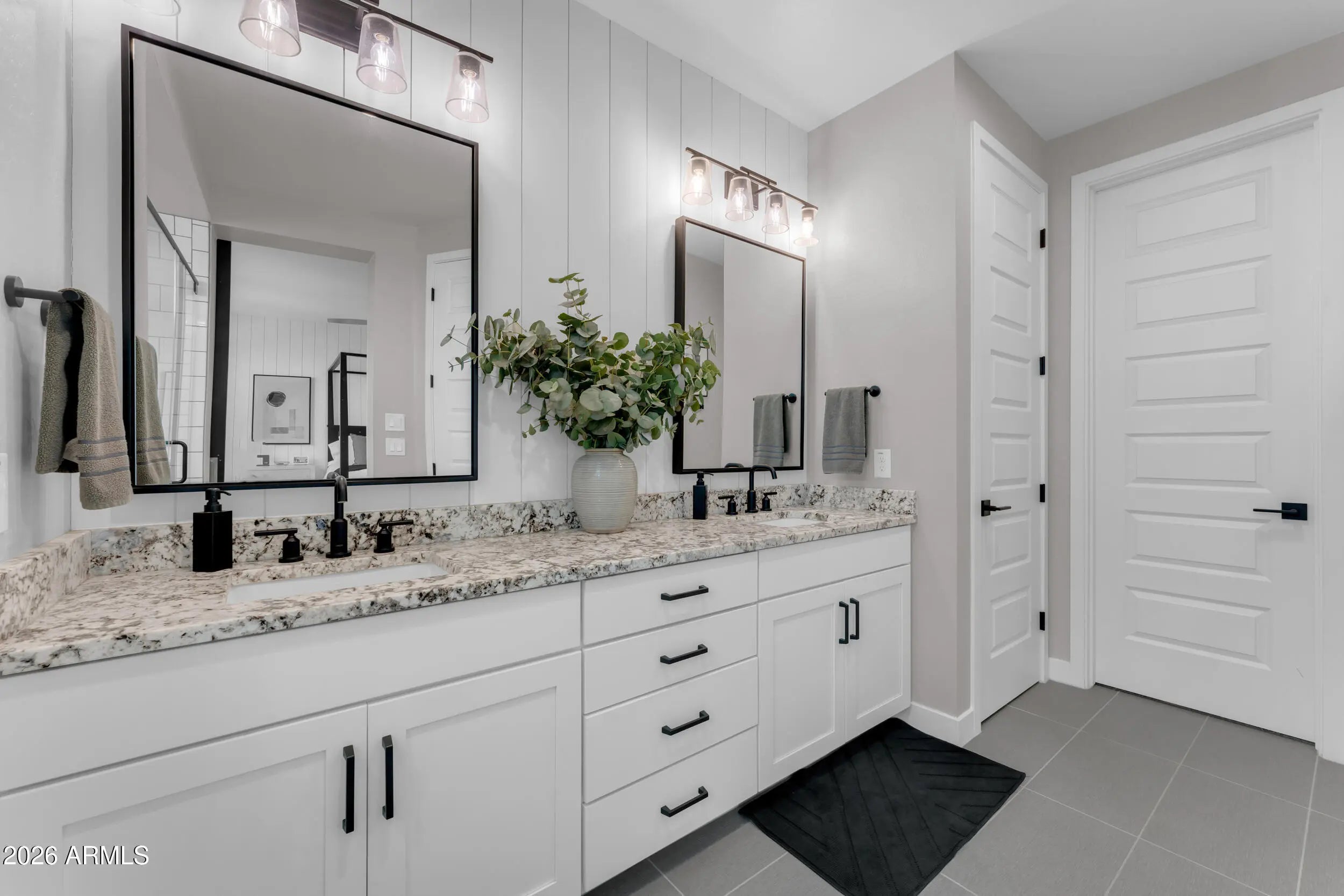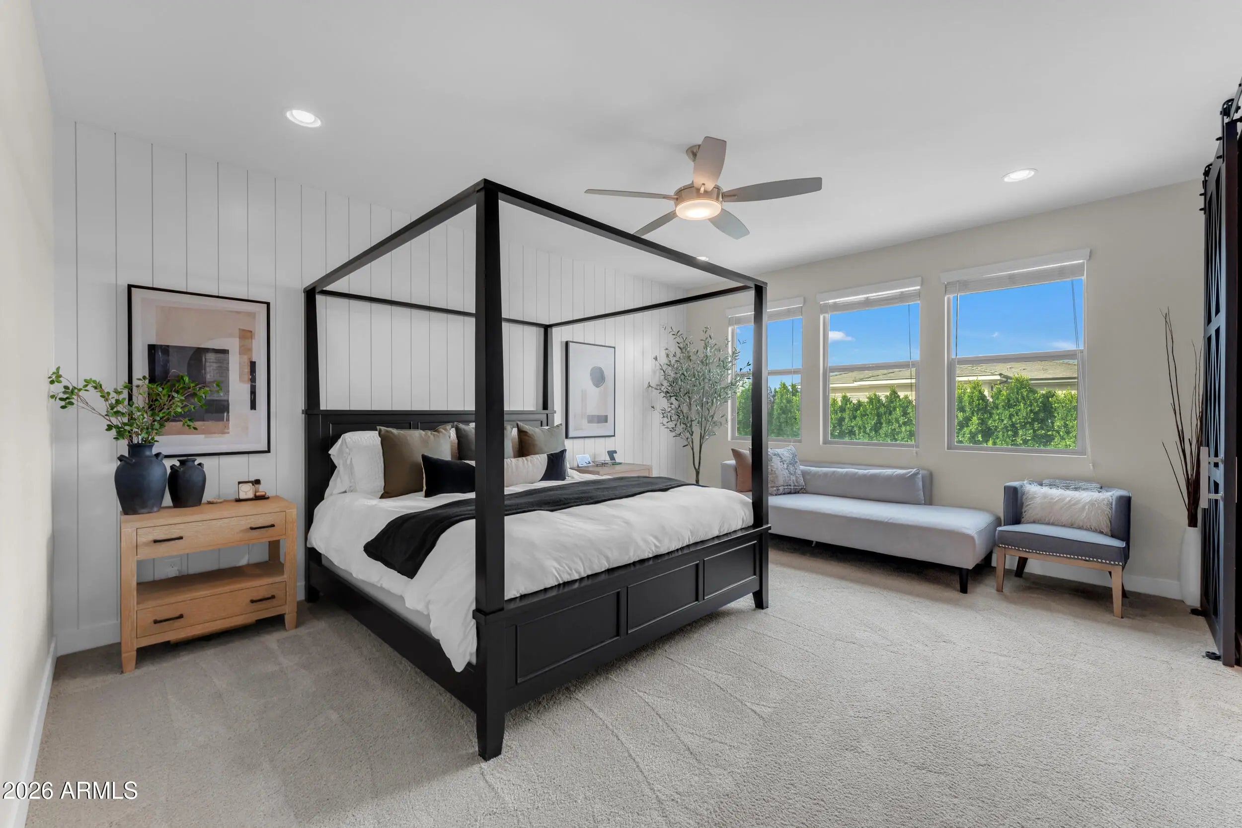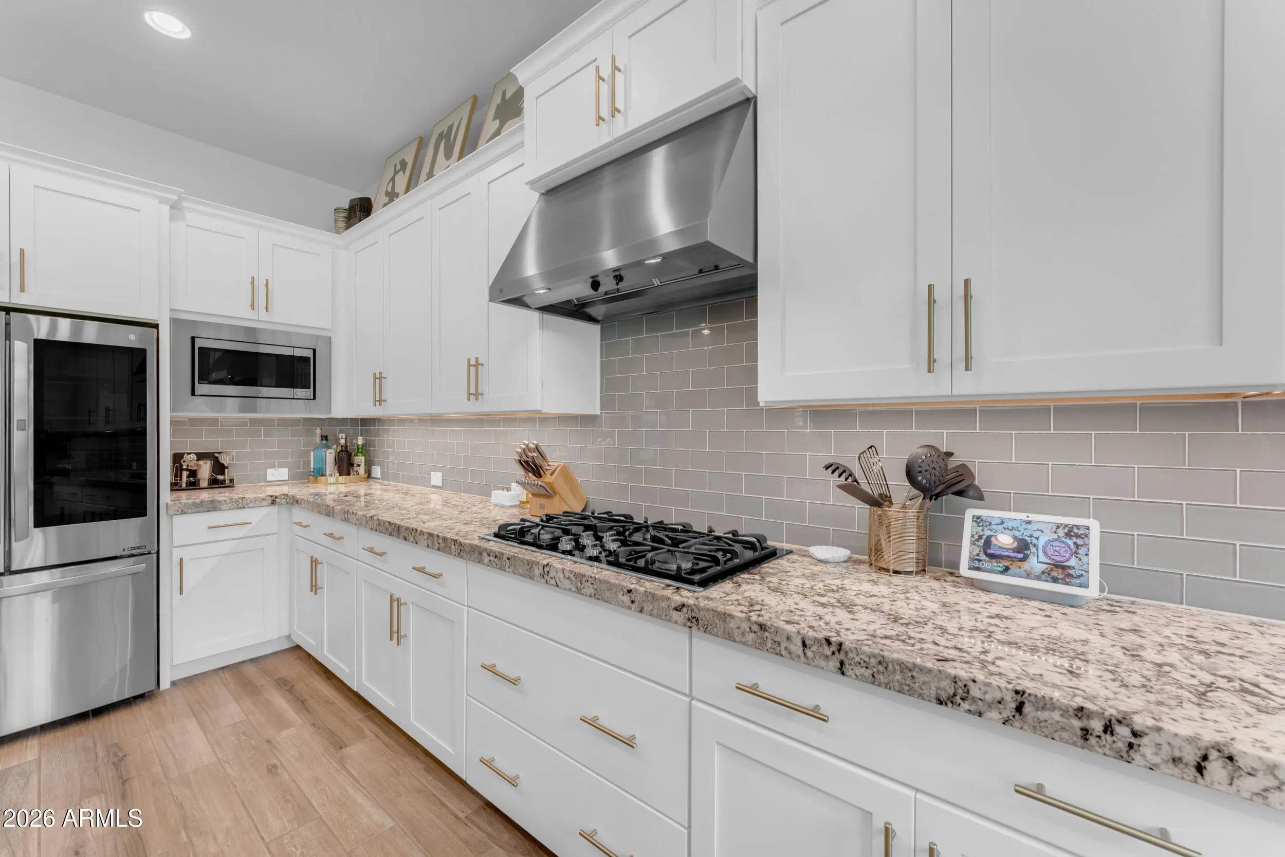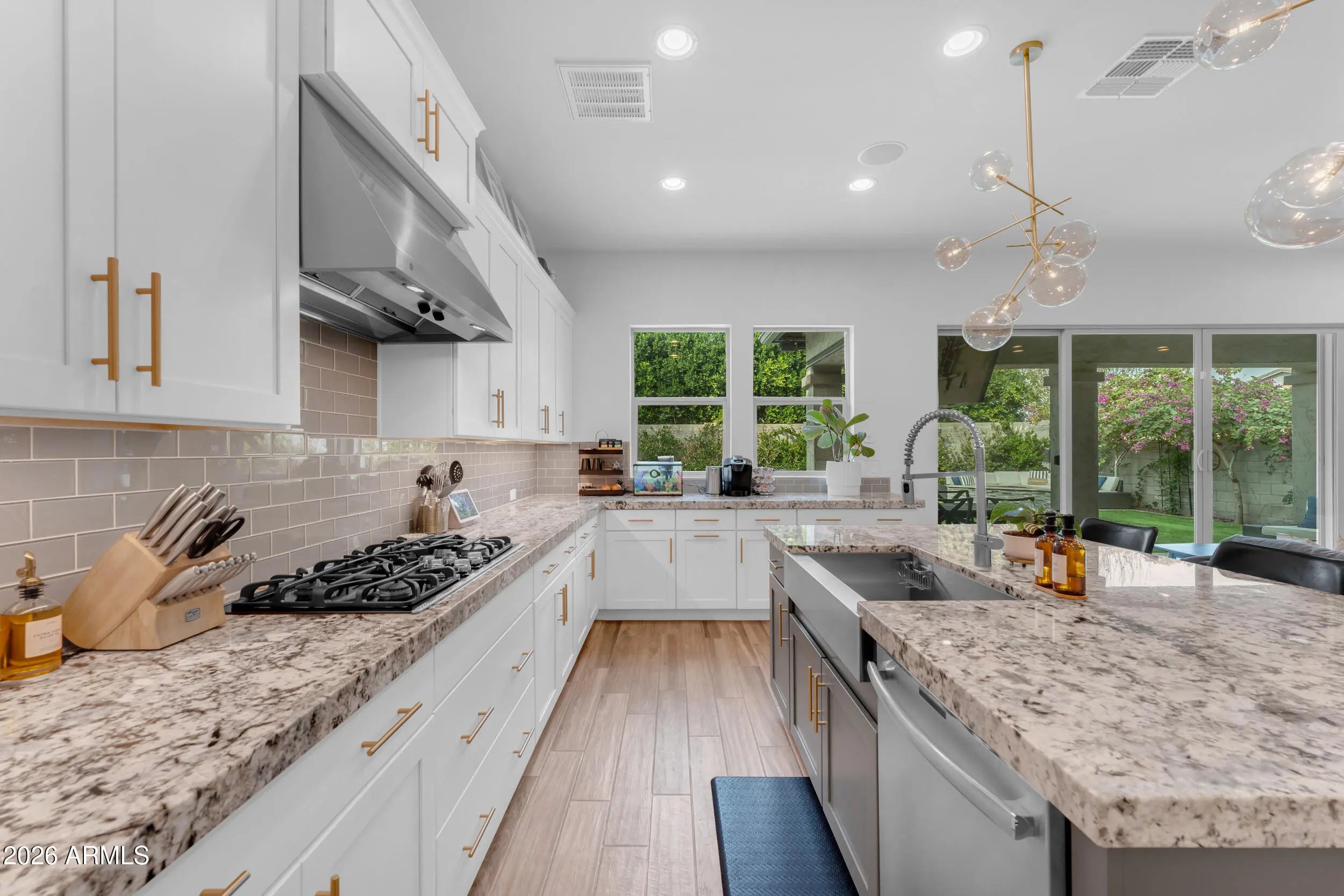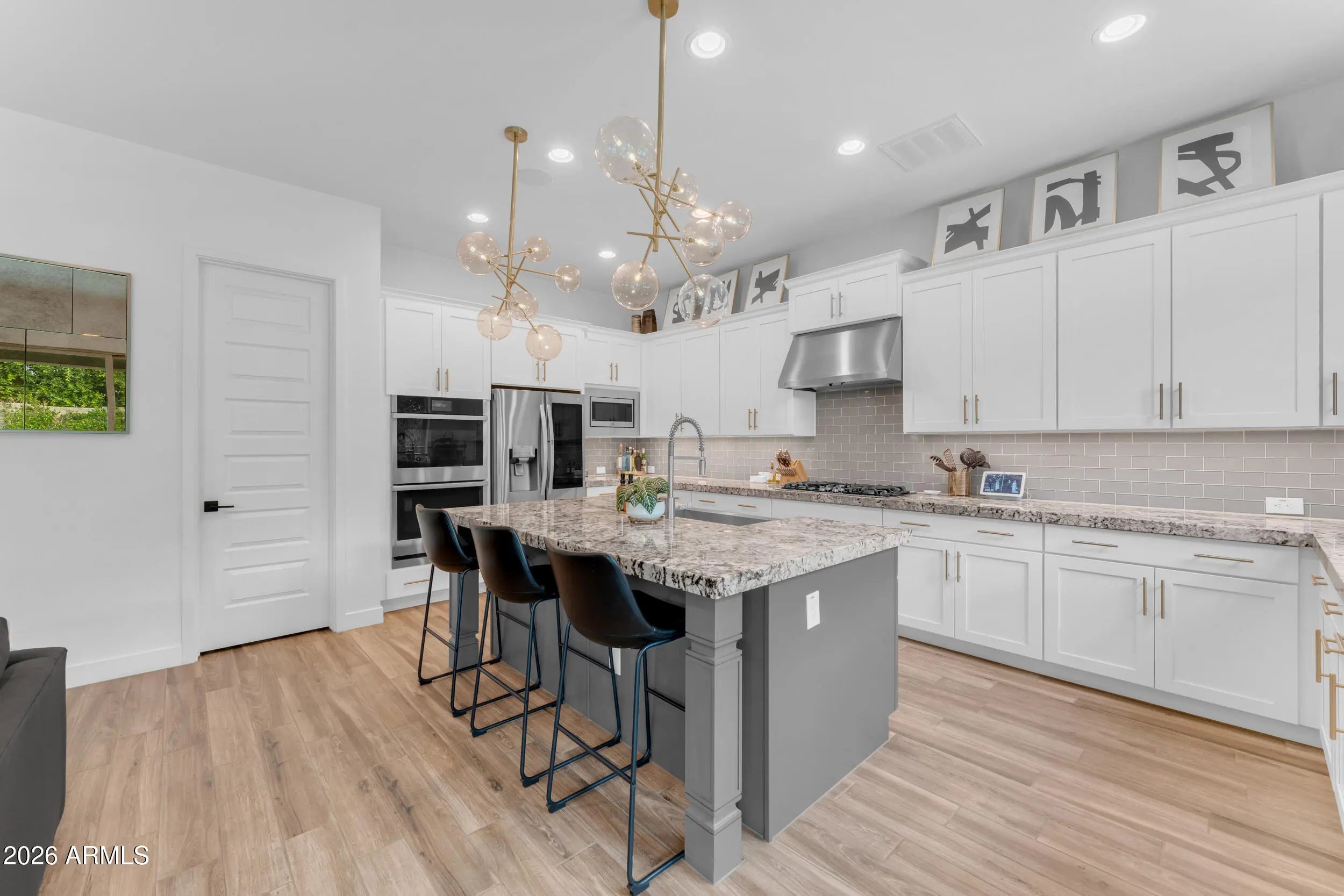 Welcome to luxury living in the heart of Morrison Ranch in Gilbert, Arizona. Situated on a premium 55' wide corner lot, this exceptional 5 bedroom, 4.5 bathroom residence combines thoughtful design, elevated finishes, and true indoor outdoor living. A charming front porch sets the tone as you enter into a home filled with custom woodwork, shiplap accents, and wood look tile throughout the main living areas. Recessed lighting and surround sound enhance the open concept layout, while the electric fireplace creates a warm and inviting focal point in the great room. Designed for both everyday living and entertaining, the chef's kitchen features a gas cooktop, granite countertops, large island, glass subway tile backsplash, stainless farmhouse sink, and an expansive walk in pantry. The formal dining room offers an elegant space for hosting gatherings and celebrations. The downstairs layout offers flexibility with a private bedroom featuring a walk in closet and full bathroom with a walk in shower, along with an additional guest powder bath. Upstairs, a massive loft with surround sound provides flexible living space for a media room, office, or secondary living area. The primary suite is a true retreat with shiplap detail, recessed lighting, dual vanities with granite countertops, custom tile walk in shower, large walk in closet, and additional linen storage. An oversized upstairs en suite bedroom offers the feel of a second primary, while the remaining bedrooms are generously sized. A secondary bathroom with dual vanities and a shower tub combo, along with a spacious upstairs laundry room featuring upper and lower cabinetry and a utility sink, complete the upper level. Step outside to your private backyard oasis. The heated pool with a large Baja step and tranquil water feature anchors the space, surrounded by pavers, artificial turf, and a mature Hong Kong orchid. Outdoor living is elevated with patio misters, surround sound, a gas firepit, and a built in retractable patio television that stays with the home, making entertaining effortless year round. Additional highlights include a Tesla charger, water softener, full house filtration system, and a three car garage with overhead storage. This home is ideally located just minutes from The Epicenter at Agritopia, offering popular dining, coffee shops, and gathering spaces. SanTan Village provides convenient open air shopping, restaurants, and entertainment. Downtown Gilbert's Heritage District features boutique shopping, award winning dining, and community events. Outdoor recreation is abundant with nearby Freestone Park, the Riparian Preserve at Water Ranch, scenic walking and biking paths, and numerous recreational amenities all within approximately 15 minutes of the property. This is a rare opportunity to own a beautifully upgraded home in one of Gilbert's most desirable master planned communities, where timeless design meets everyday comfort and a vibrant lifestyle.