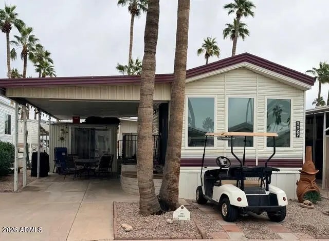 Affordable winter retreat in a land owned 55+ golf course community. Upgrades include new windows and replaced and upgraded plumbing! Solid surface flooring throughout! Furnishings are included, Spacious covered patio and laundry/shed with washer and dryer. Walking distance to the pool, spa and recreation center.
