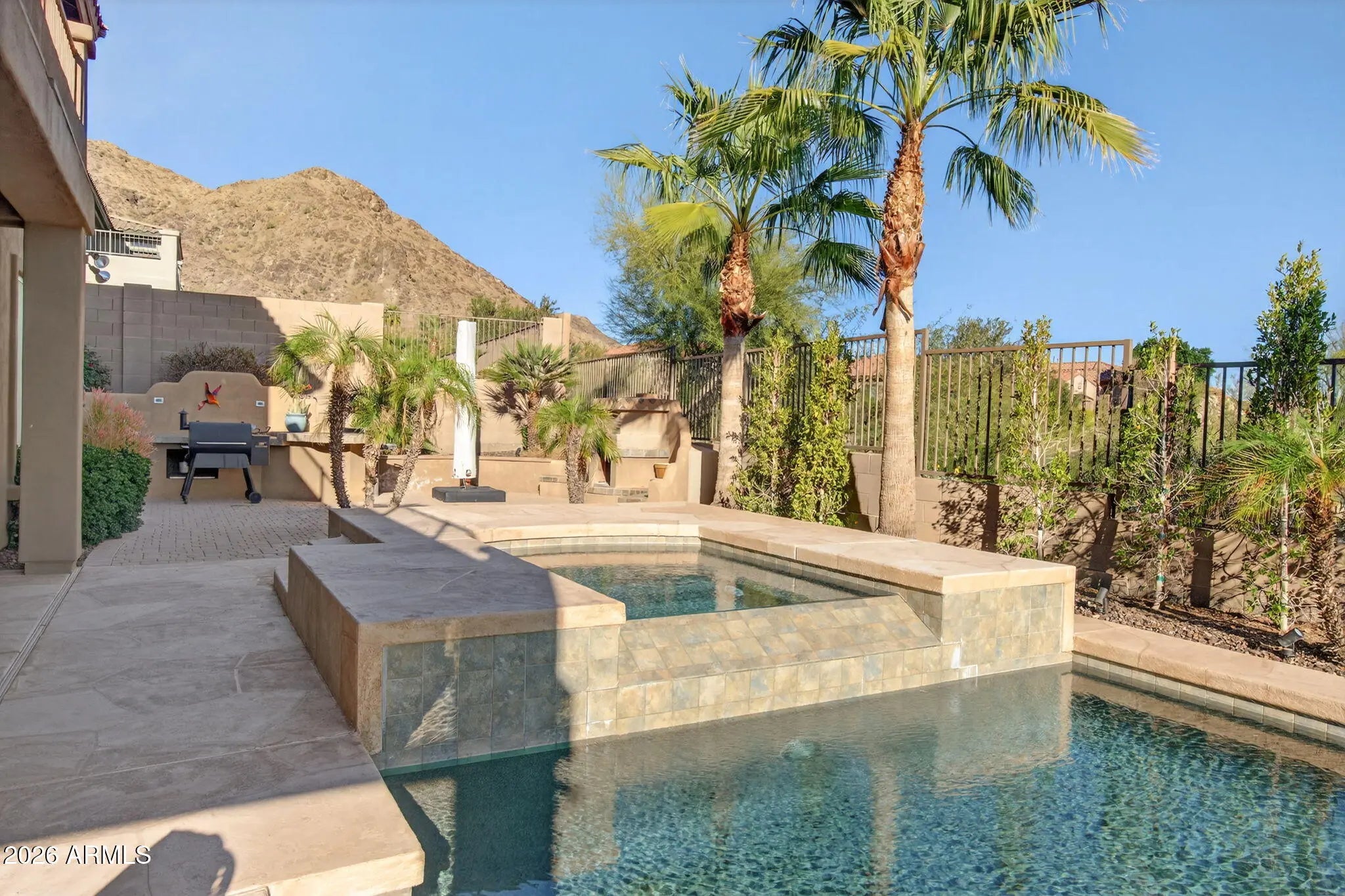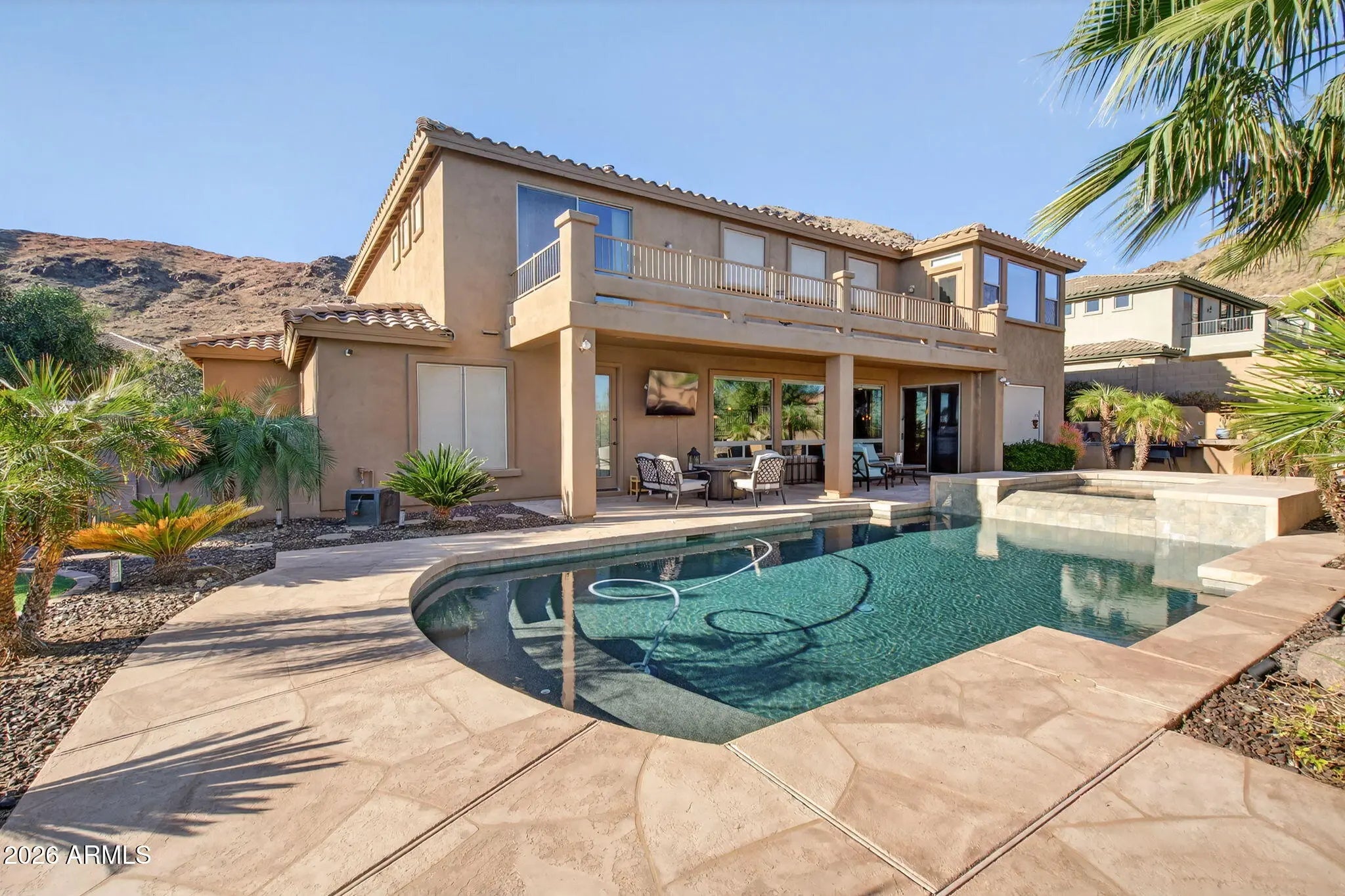 Discover the ultimate luxury home in the prestigious Ahwatukee Foothills, Phoenix, AZ—a one-of-a-kind property surrounded by breathtaking mountain views that offers the perfect blend of elegance, entertainment, and outdoor living. This stunning Ahwatukee Foothills home boasts an exceptional backyard oasis designed for year-round enjoyment: a heated Pebble Tec pool with a captivating spill-over spa, low-maintenance artificial turf, an expansive covered patio, a cozy outdoor fireplace conversation area, and a built-in BBQ with countertops — ideal for hosting gatherings or relaxing in style. Step inside to a gourmet kitchen featuring raised panel cabinets, a massive slab granite island and countertops, modern new lighting, and seamless flow to the living room and spacious eat-in area. A large walk-in pantry plus a butler's pantry (perfect as a coffee or wine bar) add convenience and sophistication. High ceilings, refined finishes, and thoughtful details elevate every room. The main floor includes a versatile entertainment room with a custom bar, a cozy den, and a large private guest suite with direct patio access. A grand staircase leads upstairs to an expansive loft/living area and three additional bedrooms. The oversized master suite is a true retreat, complete with a large sitting area, private balcony access for those incredible mountain views, a luxurious bathroom, and an enormous walk-in closet. The interior and exterior were freshly painted this month, ensuring a move-in ready feel. Enjoy panoramic vistas from the rooftop deck perfect for stargazing or soaking in the stunning mountain views. Located in the highly desirable Ahwatukee Foothills neighborhood, this home offers easy access to hiking and biking trails right outside your door, combining luxury living with an active Arizona lifestyle. Don't miss this rare opportunity to own a premium Phoenix luxury home with pool, mountain views, and resort-style amenities in one of Ahwatukee's most sought-after areas! Ideal for those searching homes for sale in Ahwatukee Foothills with premium features.