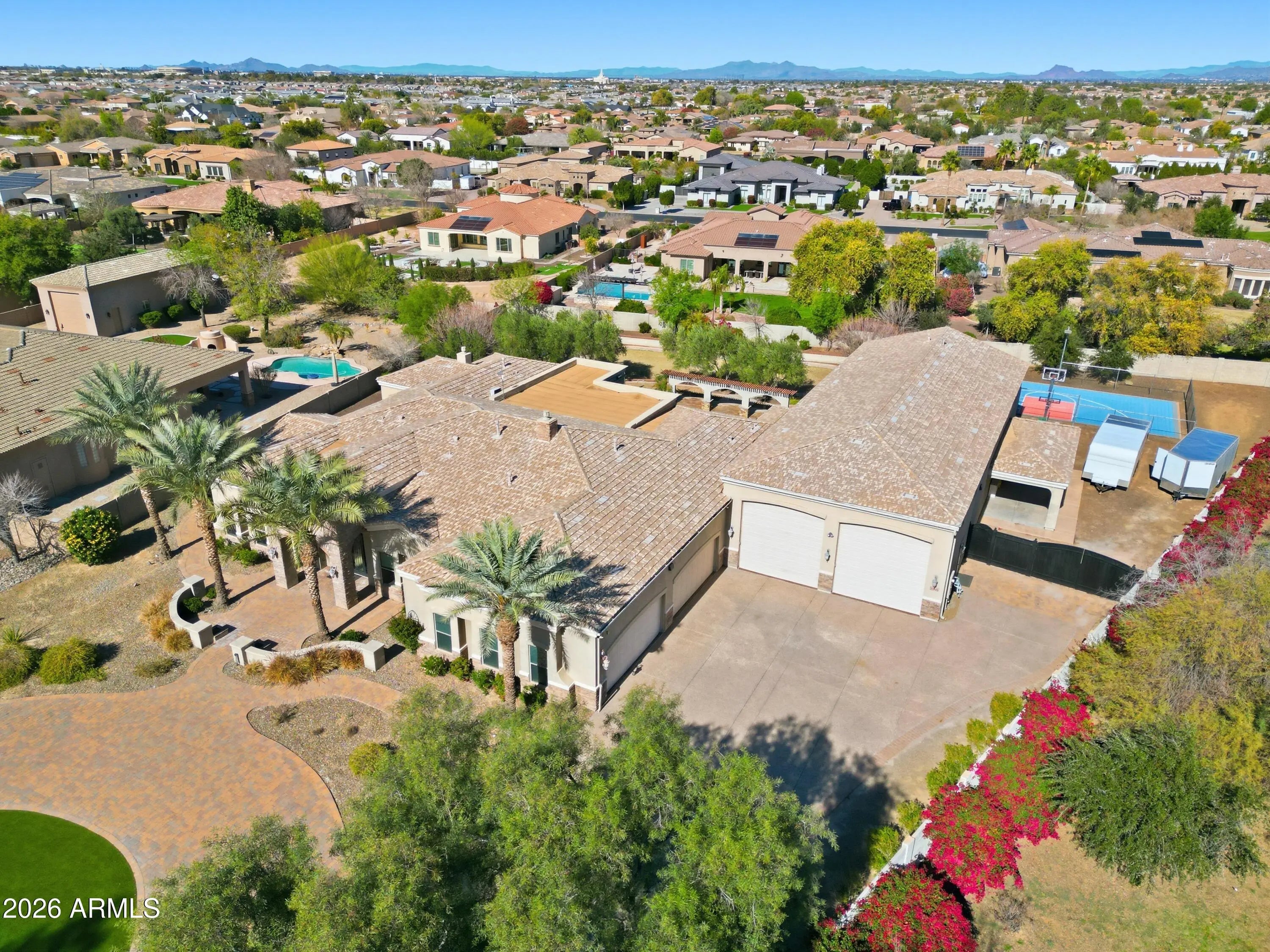 Enjoy coming home to this luxury retreat and entertainers dream! This single level home offers 4 ensuite bedrooms and 5 bathrooms with a welcoming front porch and a well-designed layout. Interior features include tile and hard flooring throughout, TWO fireplaces, granite countertops, high end appliances, exquisite cherry cabinets, large breakfast bar, and pantry. This home features an unprecedented climate controlled 4296 SF RV Garage for any luxury car enthusiast. The additional 4 car garage offers ample parking and storage. Enjoy outdoor living in the fenced backyard featuring a covered patio, resort style pool and spa, basketball court, and playground perfect for entertaining or relaxing. This property offers comfort, functionality, and plenty of space both inside and out!