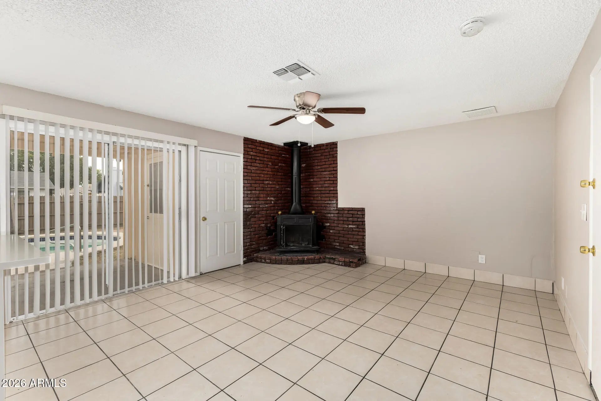 This charming 3-bedroom, 2-bath residence awaits its new owners! You're greeted by an inviting living room with a soothing palette, blinds, and durable tile flooring for easy maintenance. The appealing great room has a cozy fireplace for relaxing evenings with loved ones. Cook delicious meals in the well-appointed kitchen, equipped with solid surface counters, crisp white cabinetry, essential built-in appliances, and a peninsula with a breakfast bar for casual meals. The main bedroom includes a private bathroom for added comfort. Venture out onto the backyard, which offers a covered patio and a sparkling pool for refreshing dips on hot summer days. Don't miss your chance to own this property boasting unlimited potential!