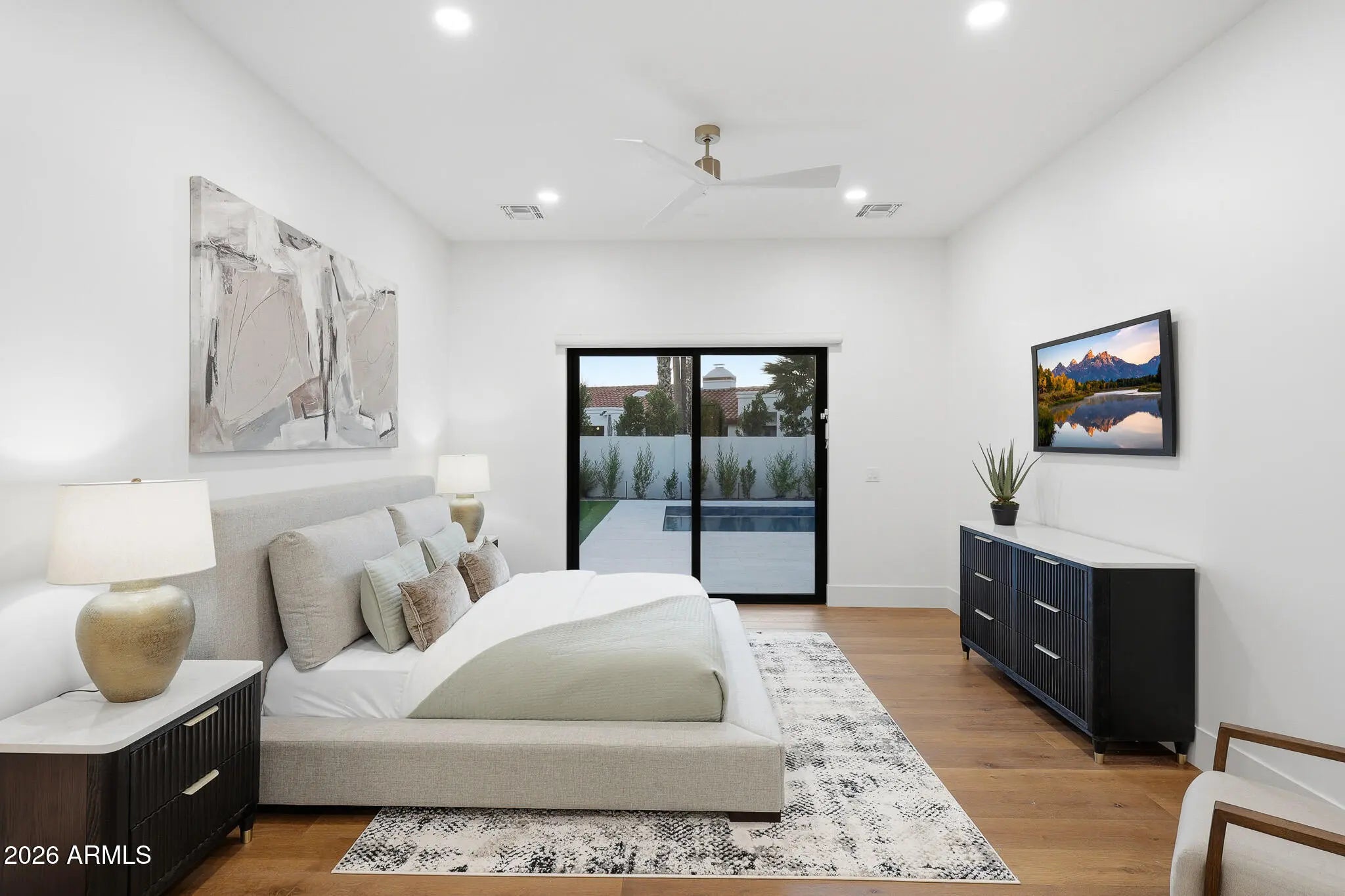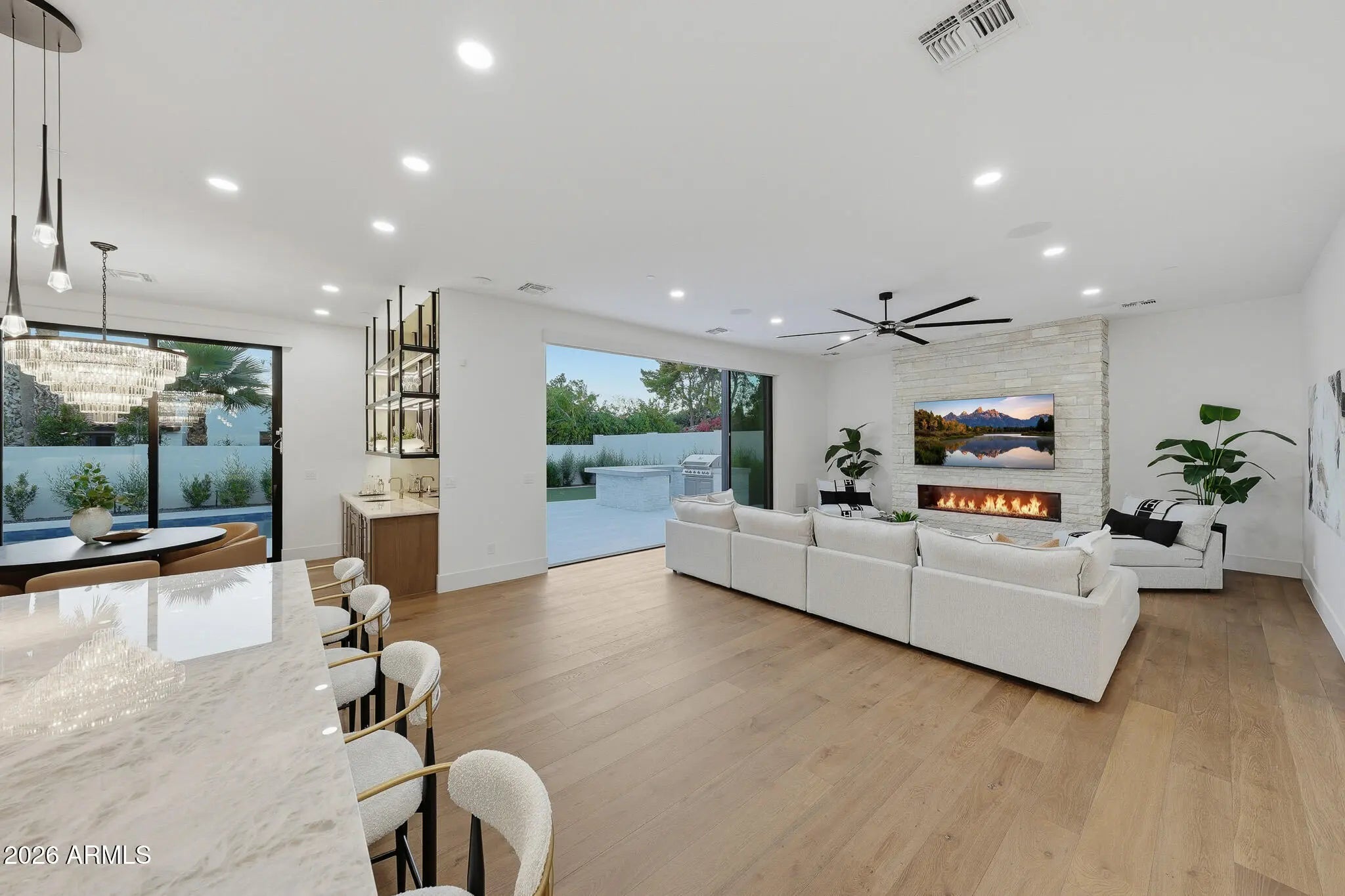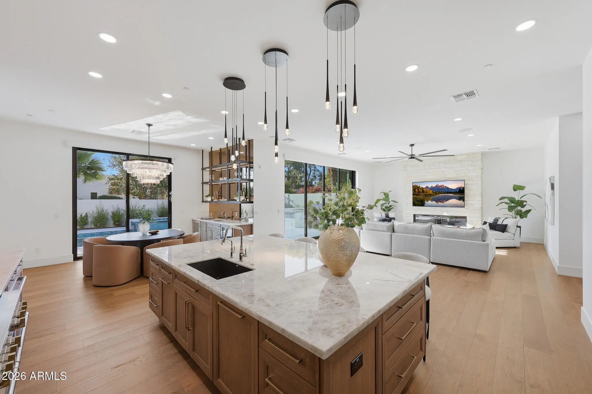 Introducing the one and ONLY first of it's kind newly constructed custom residence in Scottsdale Ranch—a rare blend of refined primary living, architectural warmth, and effortless everyday luxury. Thoughtfully designed for how people truly live, the home centers around expansive main-level living—where the primary suite and additional guest bedrooms create a seamless experience complemented by soaring ceilings and beautifully balanced proportions. Inside, the home feels both tailored and timeless, with natural stone, Cristallo quartzite, and custom cabinetry layered alongside French white oak flooring. The result is a calm, elevated backdrop that feels thoughtfully curated rather than constructed. The kitchen anchors the living space as a design-forward centerpiece equal parts functional and sculptural ideal for entertaining, gathering, and daily life. The first floor primary suite is a private retreat, featuring a spa-inspired wet room, soaking tub, and custom closets that evoke the feel of a boutique resort. Every secondary suite is equally intentional, with ensuite baths and walk-in closets offering comfort and privacy for family and guests. Built as a fully integrated smart home, the residence delivers modern convenience seamlessly woven into the home's design. Outdoors, a professionally landscaped backyard unfolds as a private, resort-inspired extension of the home, featuring a heated pool, spa, and outdoor kitchen. The setting is ideal for relaxed living and entertaining within the privacy and prestige of Scottsdale Ranch. Minutes to the 101, dining, shopping, golf, lakes, and A+ Rated schools. Absolute must see!