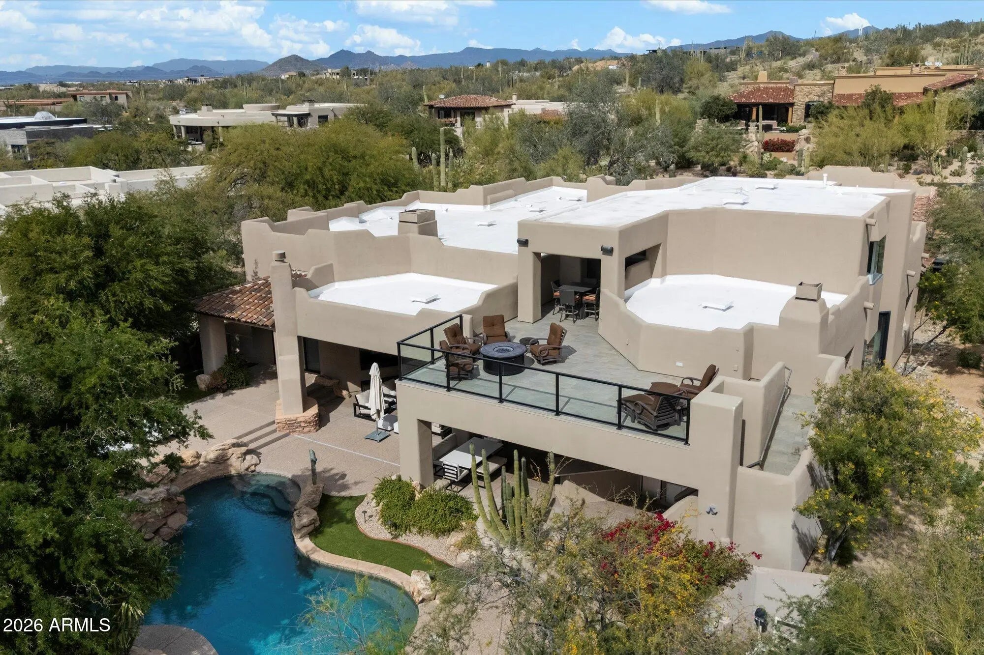Welcome to an exceptional luxury residence located within the prestigious Desert Highlands, offering 4 en-suite bedrooms plus an en-suite office, 6.5 bathrooms, with an upstairs casita or multi-purpose media room, all thoughtfully designed to deliver refined living in one of North Scottsdale's most sought-after private golf communities. This beautifully appointed home combines timeless architecture with modern livability, surrounded by dramatic mountain scenery and access to world-class amenities, and can be purchased fully furnished. Desert Highlands Golf Club is a private guard-gated community nestled along the iconic Pinnacle Peak mountains. You immediately become a club member after closing (membership dues apply) so you can enjoy the club amenities: golf, tennis, pool, fitness center, exclusive restaurants, and more! The home makes a striking first impression with a grand entry that opens into the formal living room, where a statement fireplace and automated pocketing sliding glass doors create a seamless indoor-outdoor connection and an immediate sense of scale and sophistication. And not to be overlooked is the full bar for unforgettable experiences! Natural light fills the space, setting the tone for both everyday comfort and effortless entertaining. At the heart of the home, the kitchen anchors the living spaces and is designed to accommodate both daily living and hosting with ease. It features an oversized center island, two dishwashers, granite countertops, abundant high-quality cabinetry, and a kitchen window that frames beautiful Pinnacle Peak views. The family room and dining room are directly adjacent to the kitchen, creating a true great room experience that reflects what home buyers look for and how people live and entertain today. The floor plan offers four en-suite bedrooms plus a dedicated en-suite office and a total of 6.5 bathrooms, providing privacy, flexibility, and excellent separation of space. The primary suite is thoughtfully split from the remaining bedrooms and serves as a private retreat, featuring a spacious bedroom with its own fireplace, private patio access, a his and her bathrooms with a shared central shower, and two expansive walk-in closets designed to delight anyone who values organization and wardrobe space. The office includes its own bathroom and closet, making it highly versatile and suitable for a variety of uses beyond a traditional workspace. An upstairs casita or multi-purpose media room adds another layer of flexibility and opens to a balcony with distant city-light and Pinnacle Peak views, creating an ideal setting for evening relaxation or entertaining. Desert Highlands Golf Club is a private community nestled among the mountains of North Scottsdale. An immediate golf membership is available at closing, a highly desirable benefit within Desert Highlands. (Buyer to pay applicable membership initiation and transfer fees at closing.) The club allows members to build camaraderie as neighbors and friends through shared experiences on the golf course, at the racquet club, in the fitness center, by the pool, or while dining at one of their exclusive restaurants. When you buy a luxury home in Desert Highlands, you're investing in more than real estate; you're investing in yourself.