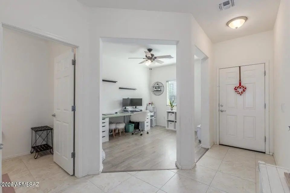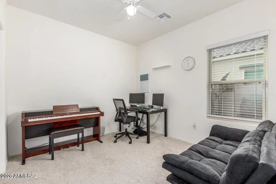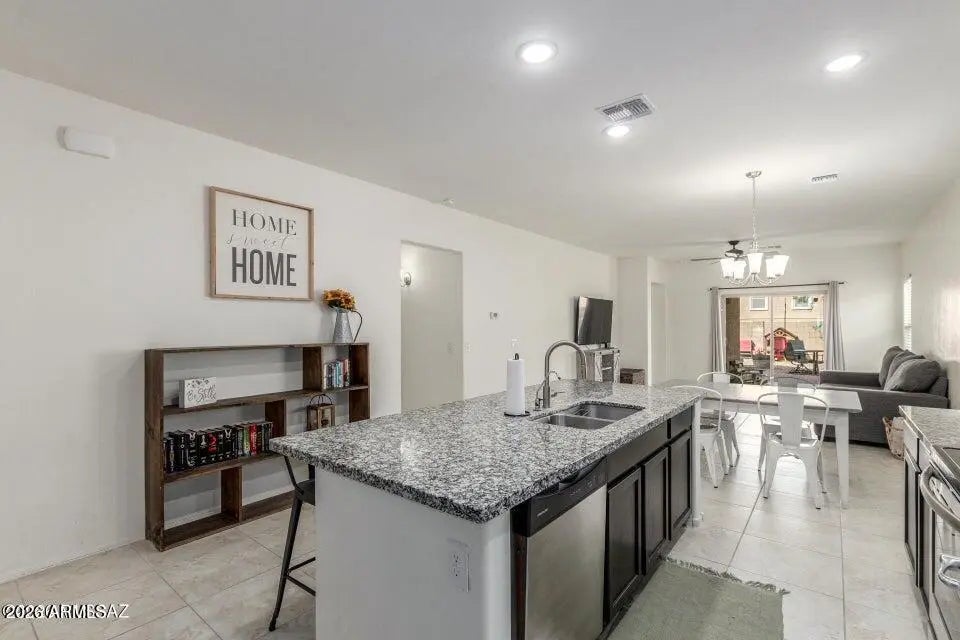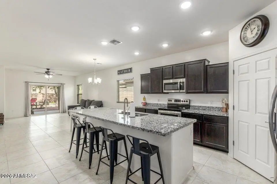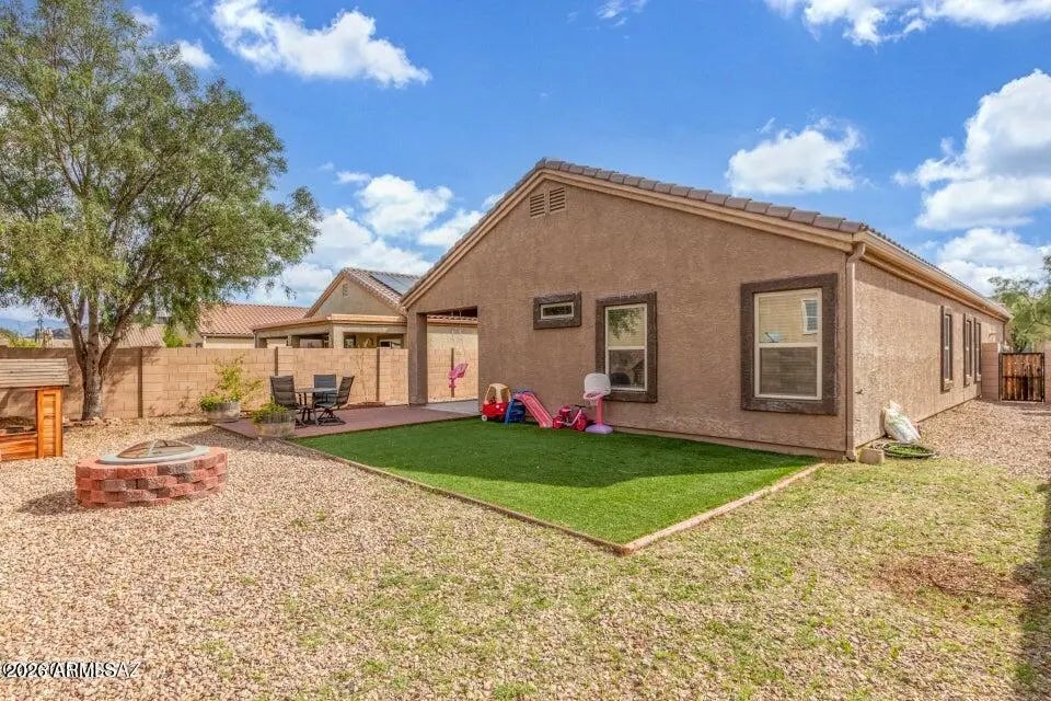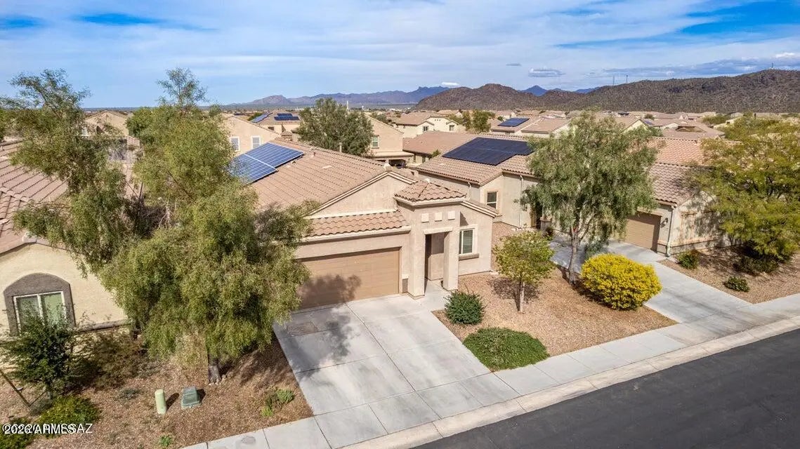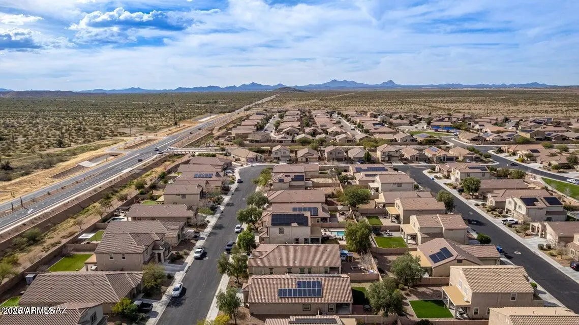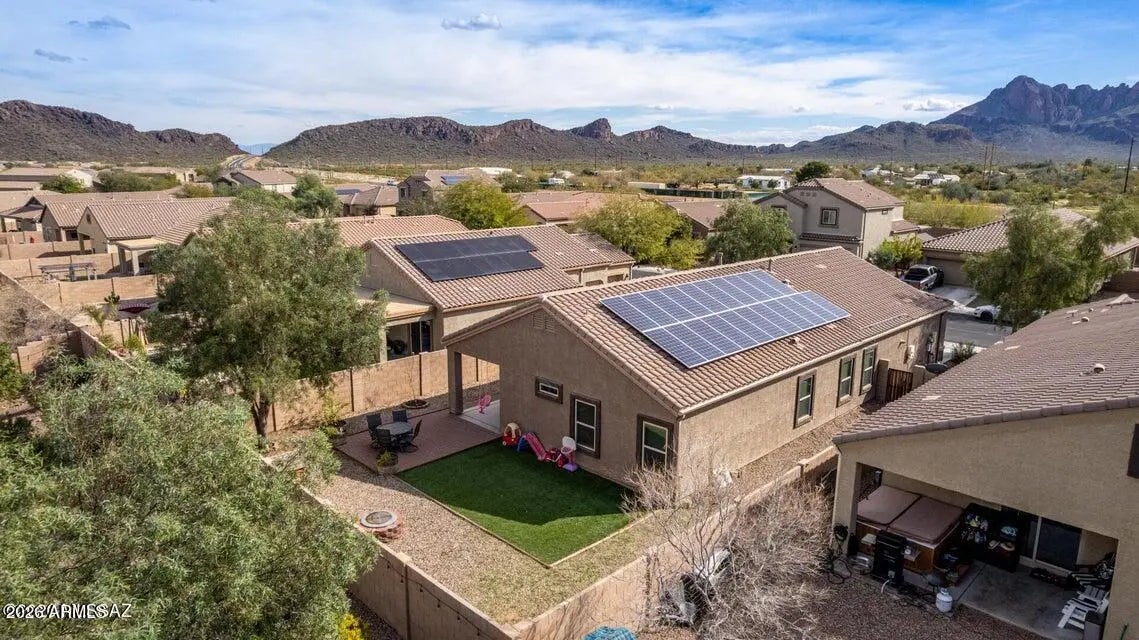 PAID SOLAR! Breathtaking scenes of blooming saguaros encompassing the mountains will captivate you as you venture through the mountain pass into a delightful desert community that awaits you. The Saguaro Bloom community welcomes individuals and families in all chapters of life, presenting wonder and excitement with crystal pools, shaded parks, a splash pad, basketball court, walking paths, and a pristine clubhouse and fitness center. In a community full of impressive amenities, and thoughtful design, this heartfelt Old Agave Trail Home will leave you smitten the moment you arrive. This 4-bedroom home has the space and style you've been looking for. A versatile den with wood-look floors makes the perfect home office, hobby room, or quiet retreat. The bright great room with tile flooring in all the right places is ready for movie nights and gatherings with friends. The kitchen shines with stainless steel appliances, granite countertops, neutral cabinetry, recessed lighting, a walk-in pantry, and a center island with breakfast bar seating ideal for casual mornings with a cup of coffee, or hosting with ease. Unwind in the spacious primary bedroom featuring a private bath and walk-in closet. Step outside to enjoy a serene yard complete with a covered patio, artificial grass area, cozy fire pit, and plenty of room for play, pets, or weekend fun. If you prefer low utility bills all year round this is the home for you, Solar to be paid fully at closing! This one truly feels like home! Don't miss it!